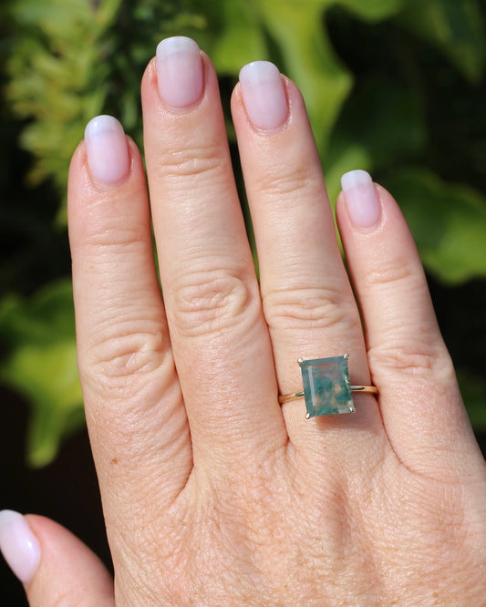 3.7ct Emerald Cut Moss Agate Ring, 9ct Yellow Gold, size Q1/2 or 8.25, 3.0g