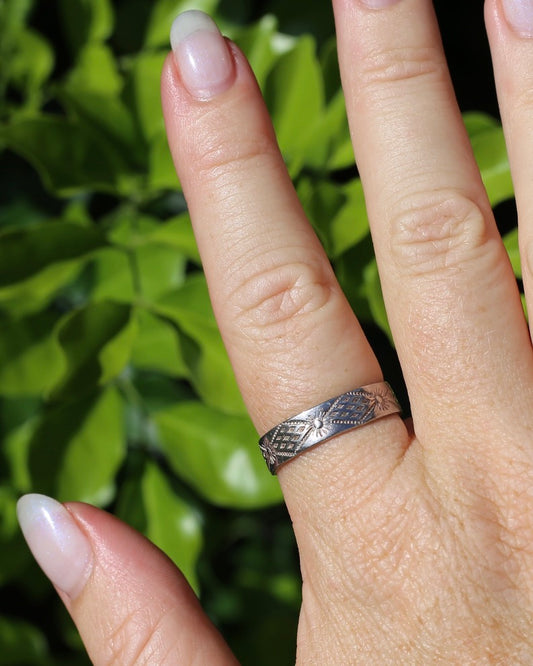 Vintage Silver and 9ct Yellow Gold Band, Angular Pattern, size U1/2 or 10.25, 4.5g