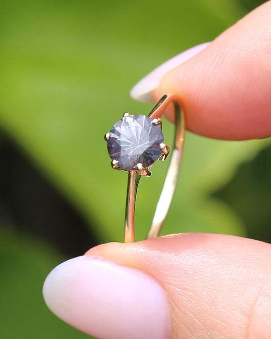 1.35 Lavender Grey Spinel Solitaire, 6 Claw setting, 9ct Yellow Gold, size 9.75 or just over T, 1.72g