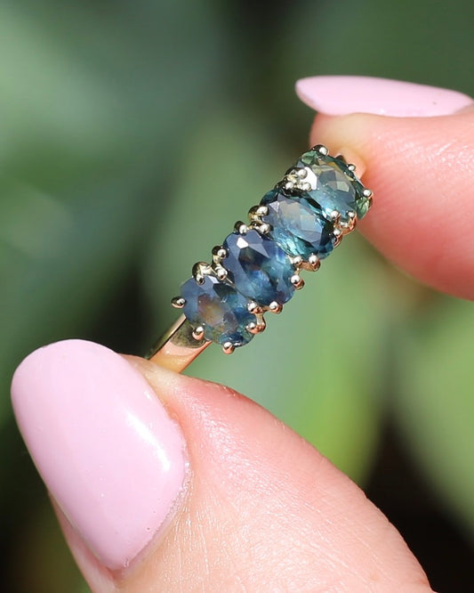 Vintage Four Stone Parti Sapphire Ring, 9ct Yellow Gold, size 9 or S, 2.59g
