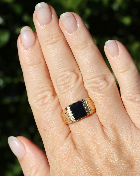 Chunky 1979 Onyx Signet with Floral Shoulders, 9ct Yellow Gold, size 10 or U