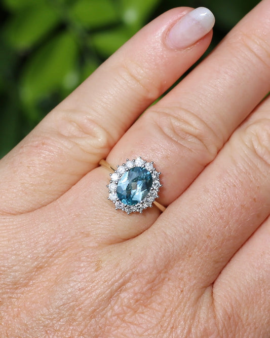 2.79ct Oval Blue Zircon and Diamond Halo, Vintage 9ct White and Yellow Gold, size M1/2 or 6.5
