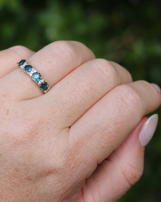 Four Stone Australian Teal Parti Sapphire & Diamond Ring, 9ct Mixed Yellow & White Gold, size O or 7.25