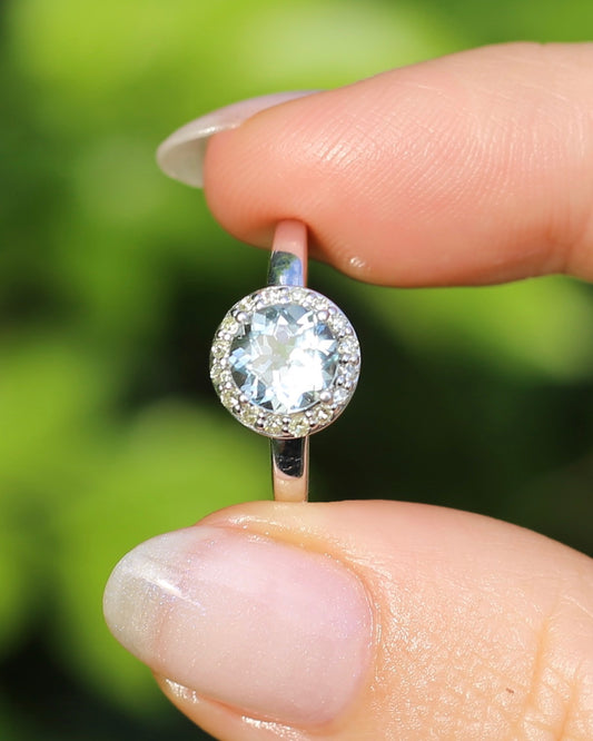 Vintage 1.25ct Aquamarine and Single Cut Diamond Halo, 9ct White Gold, size P or 7.75