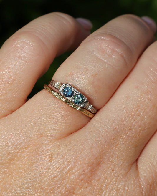 1.09ct Emerald Cut Teal Australian Sapphire With Diamonds in Vintage Trilogy Setting, 9ct Yellow and White Gold, size N1/2 or 6.75, 2.05g