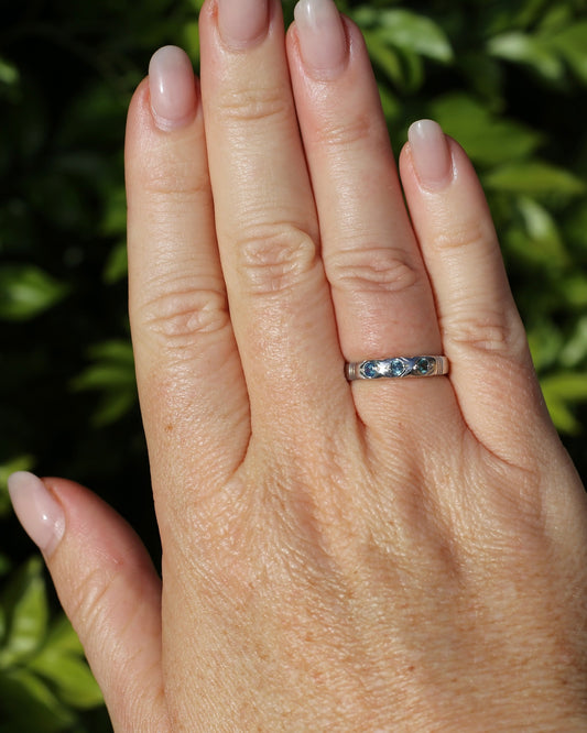 ON HOLD Australian Parti Sapphire Trilogy, 9ct White Gold Band, size N1/2 or just under 7, 2.67g