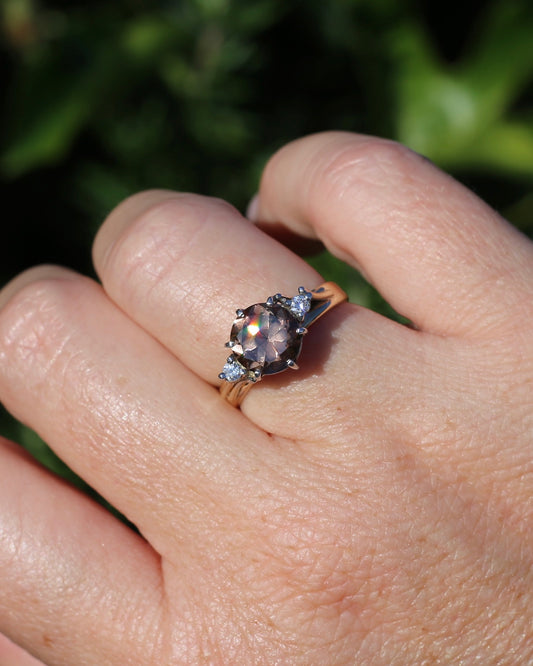 Vintage Circa 1960s 3.44ct Zircon and Diamond Trilogy, 9ct Yellow and White Gold, size 8 or Q, 3.95g