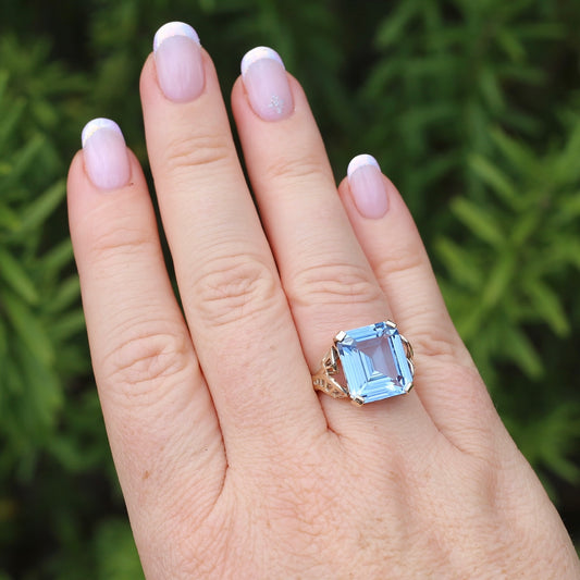 Mid Century Emerald Cut Blue Spinel Cocktail Ring, size N1/2 or 6.75