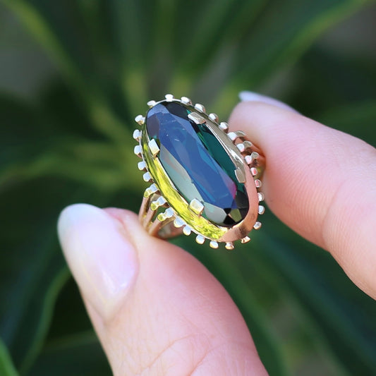Vintage Fancy Cut Oval Green Synthetic Spinel with decorative surrounds, 9ct Gold, size K or 5.5