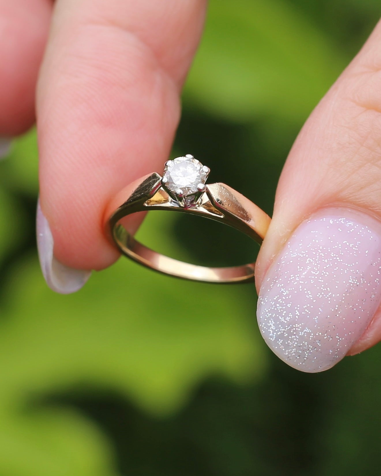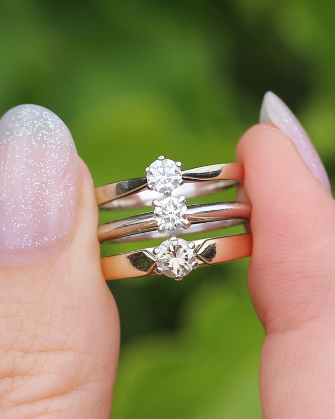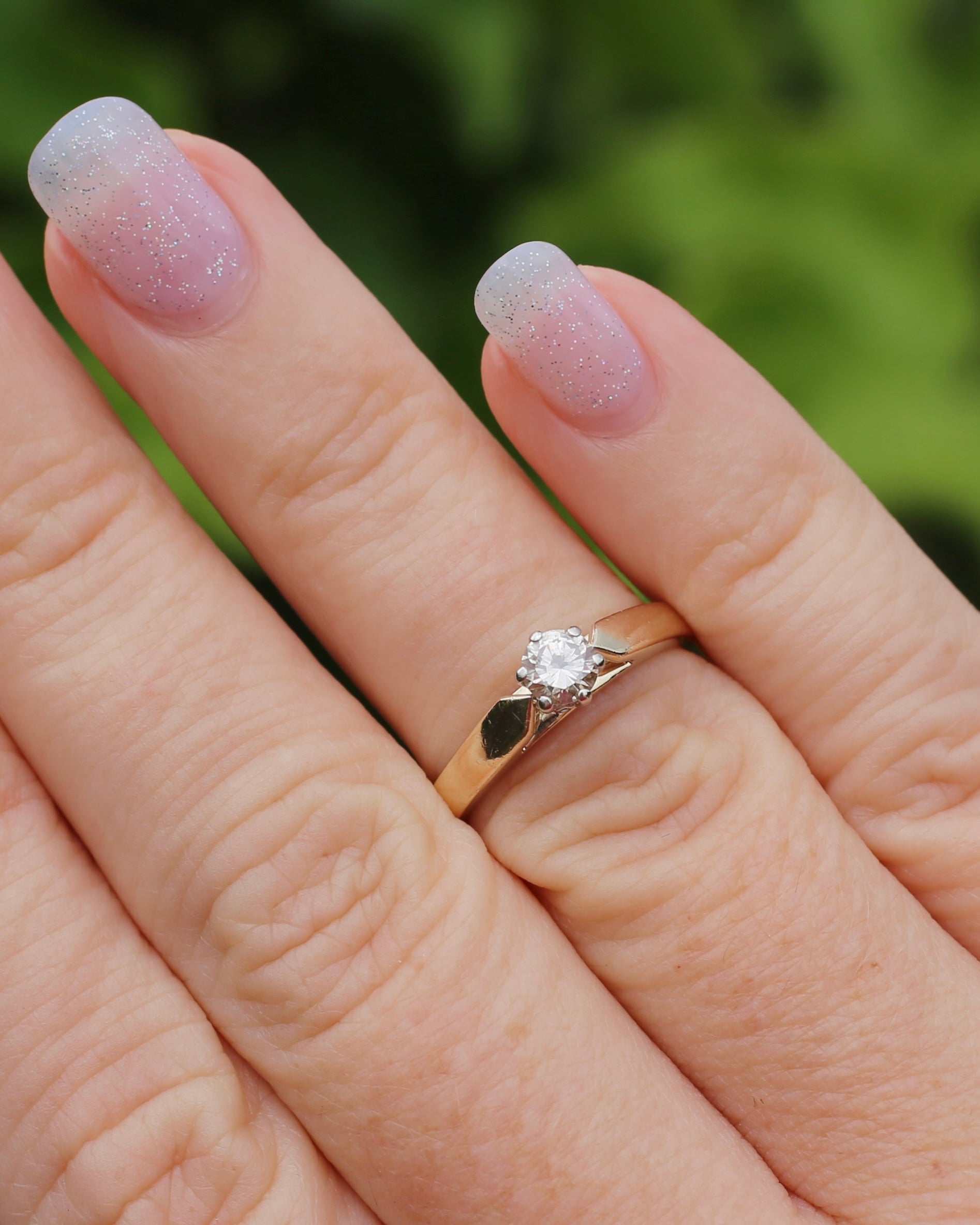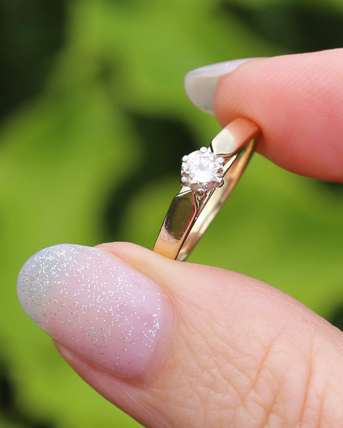 We are suckers for those warm toned sparkly stones. This champagne coloured diamond is just that - and we are here for those warm golden bursts of sparkle. Something we have already realise we miss is the simple earth mined diamond solitaire. The lab grown craze has taken over and little treasures like this are a thing of the past. Confirmed earth mined with a top of the range new fangled tester - this sparkly 0.35ct beauty is held in a great 6 claw white gold setting agianst a chunky 9ct yellow gold band. Elegant, sparkly, refined - we think these are a staple. Pictured with the other diamond solitaires for size and colour comparisons.