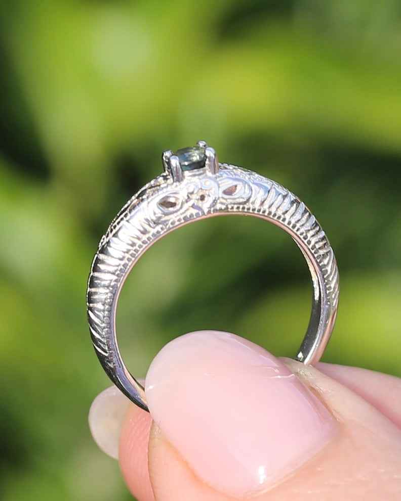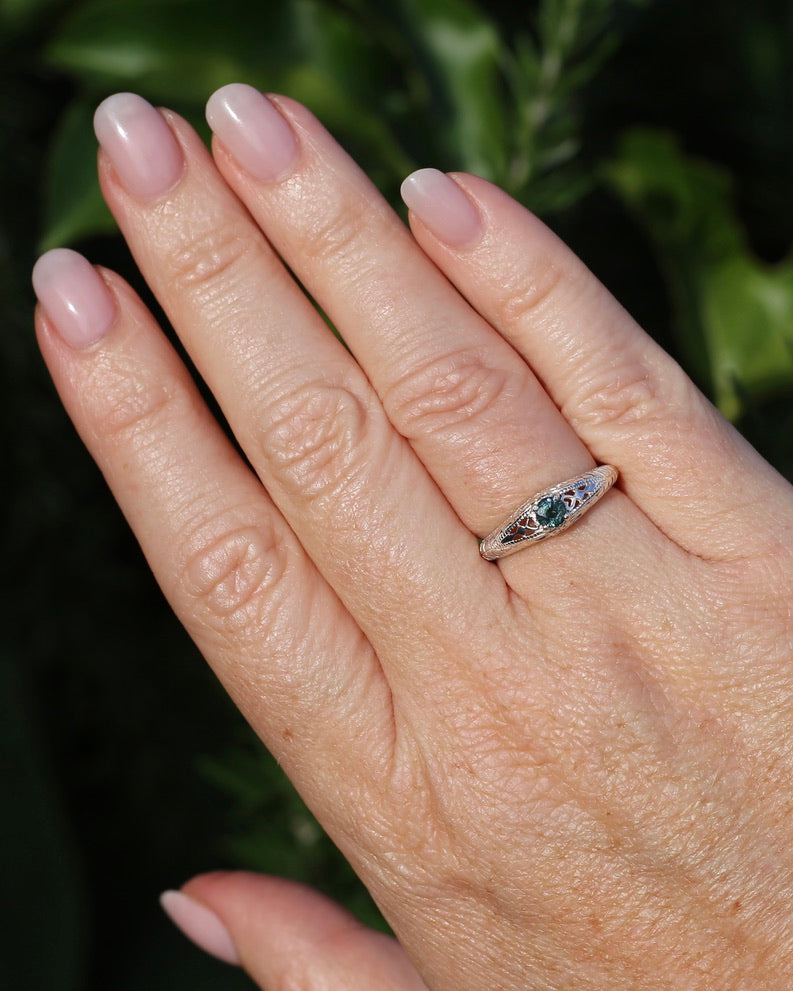 This is PARTI - just look at that colour and those facets - in the sun it is a kaleidoscope of greens and blues and they just dance. Partis are just the most special of stones- no two the same colour and the way they change is all so unique. The base is a teal green - hugely popular we know. Claw set high on a filigree band. This is not hand carved original - but it is in the style of. Chunky and delicate this ring (being newer made - think 30 or so years old) has so much life left in it unlike some of the hand carved originals.