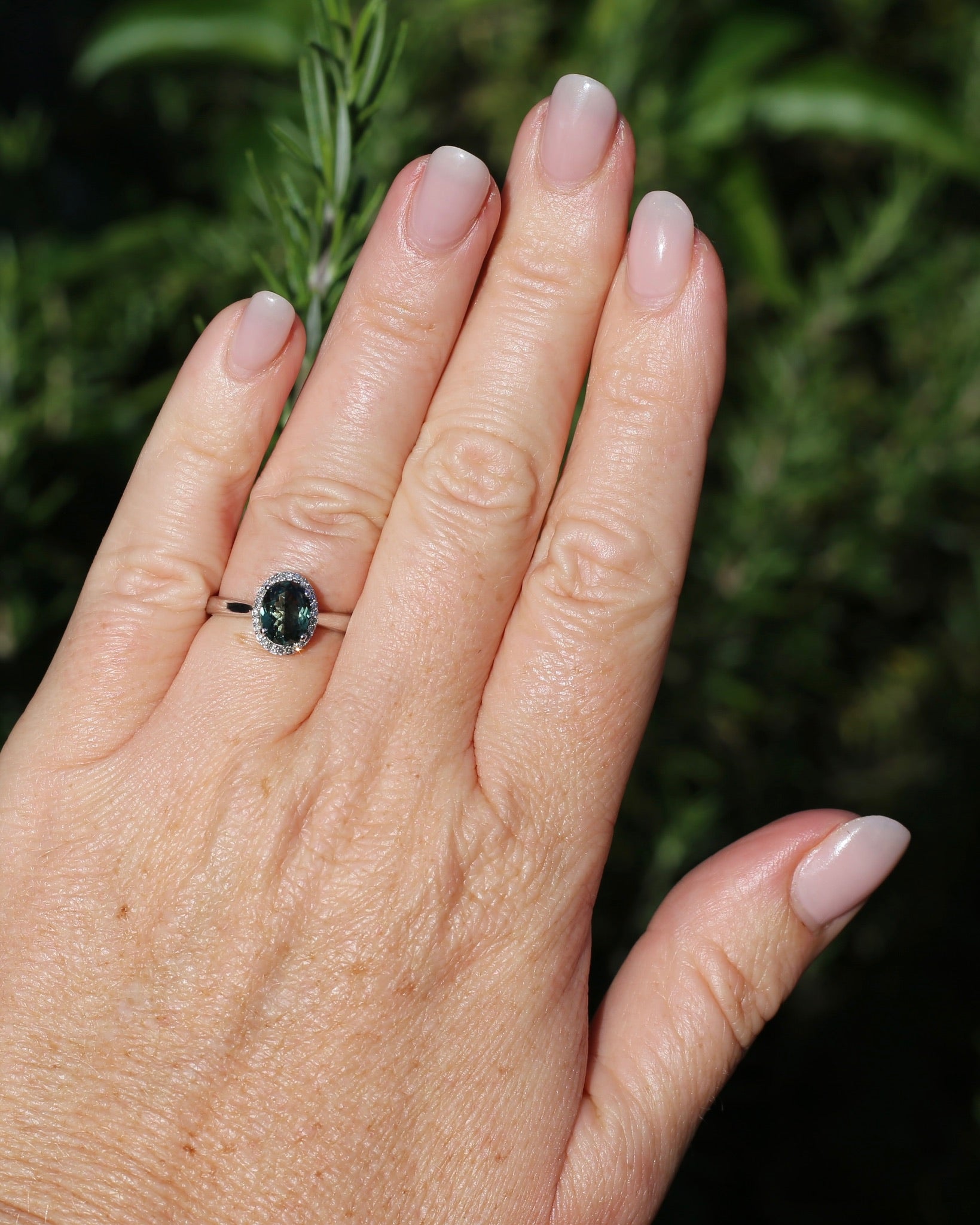 This fabulous sapphire is a fantastic 1.48ct known weight. When we bought this ring it had a synthetic centre stone - and those are our favourites for a stone swap to a treasure. So now this gorgeous single cut diamond halo has a fabulous sage green oval natural sapphire. Claw set in white gold and with a diamond halo this gorgeous green stone is surrounded by bright sparkles. Set high on a pierced basket and with a chunky white gold band this is a fabulous sapphire and diamond halo.