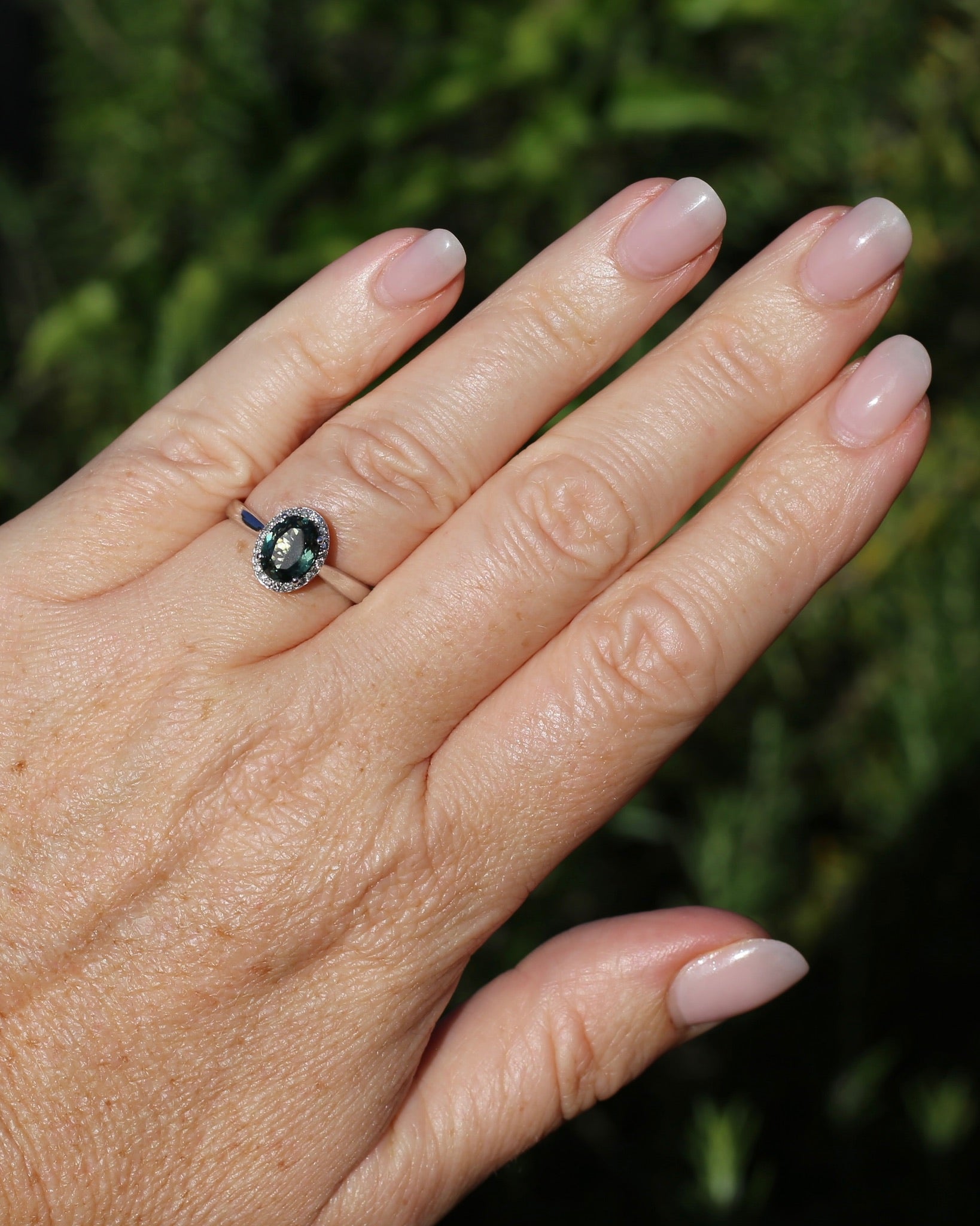 One of the most unique stones we have seen. This gorgeous 1.48ct natural Australian sapphire has an inclusion that runs down the centre of this stone - so in some lights this stone is a sage green and in others there is a dark blue linear divide and a pale yellow section. We love this about this sapphire and the magic of the way the stone moves that exposes and closes this colour shift. In the shade this stone dances in greens, a river of deep green down the middle and sagey greeny yellows around the edge - like a pool washing up on beaches.