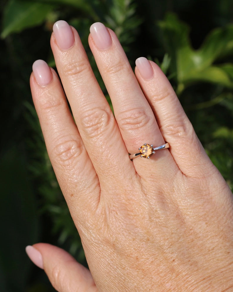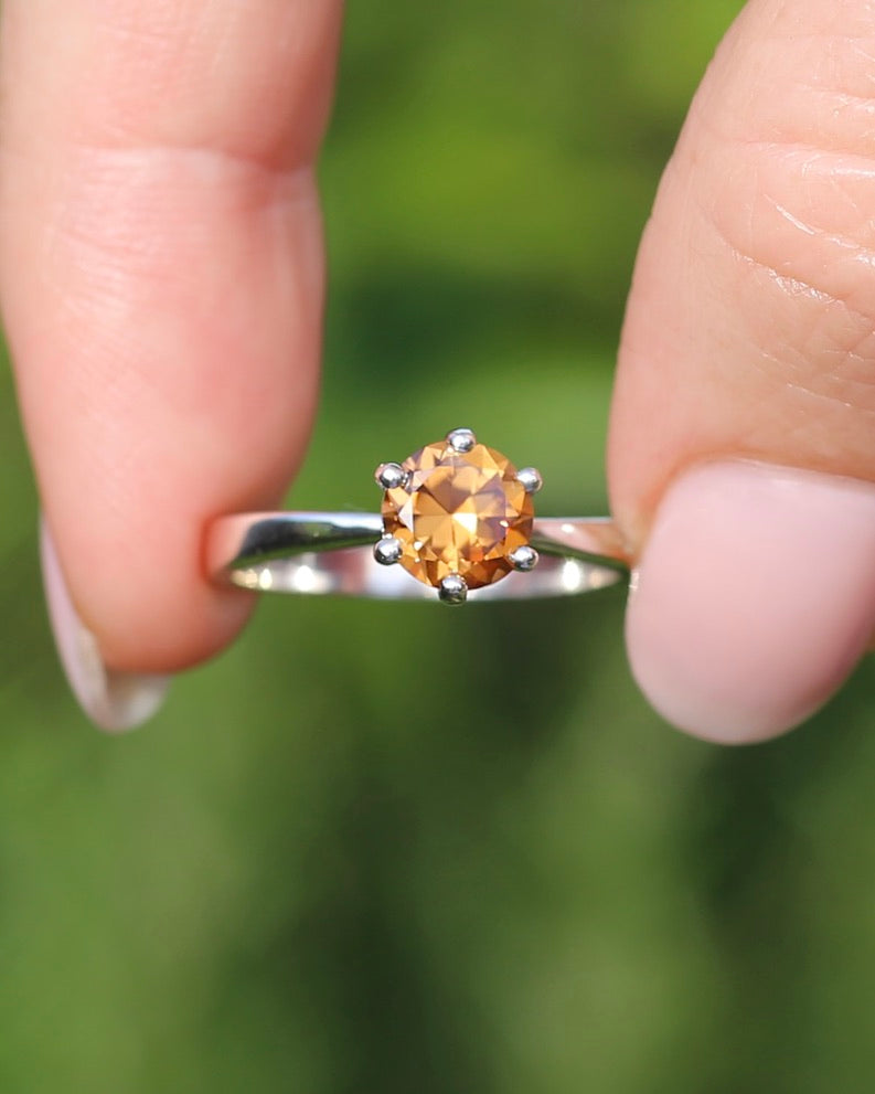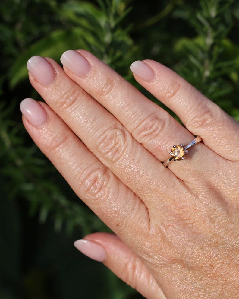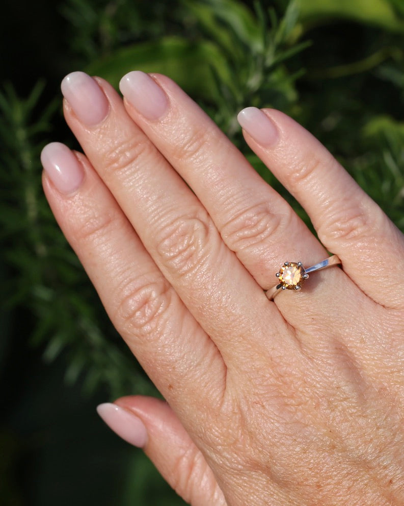 Set in a 6 claw setting, this offers a fabulous simple setting that highlights the stone and offers the girdle some protection. A perfect stacker.