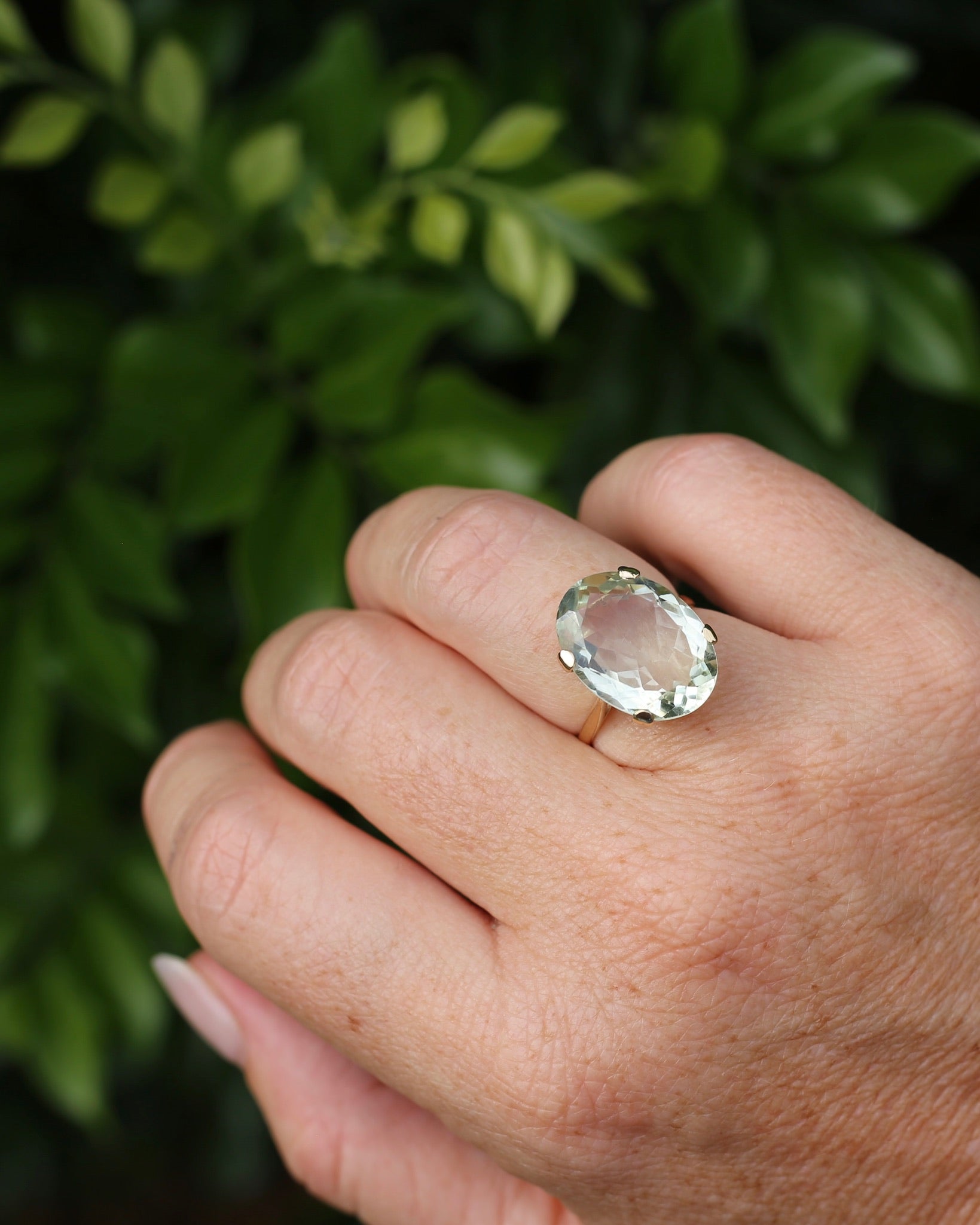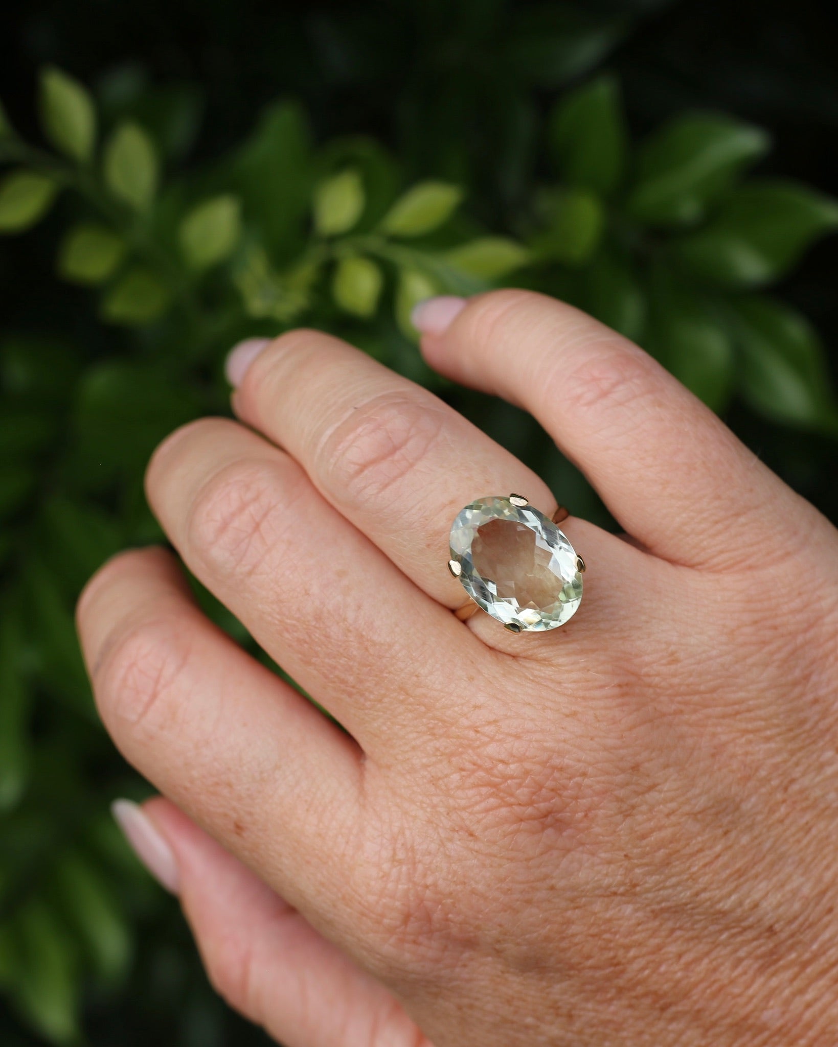 Vintage 10.5ct Oval Prasiolite or Green Amethyst Ring, 9ct Yellow Gold, size N1/2 or 7, 4.60g