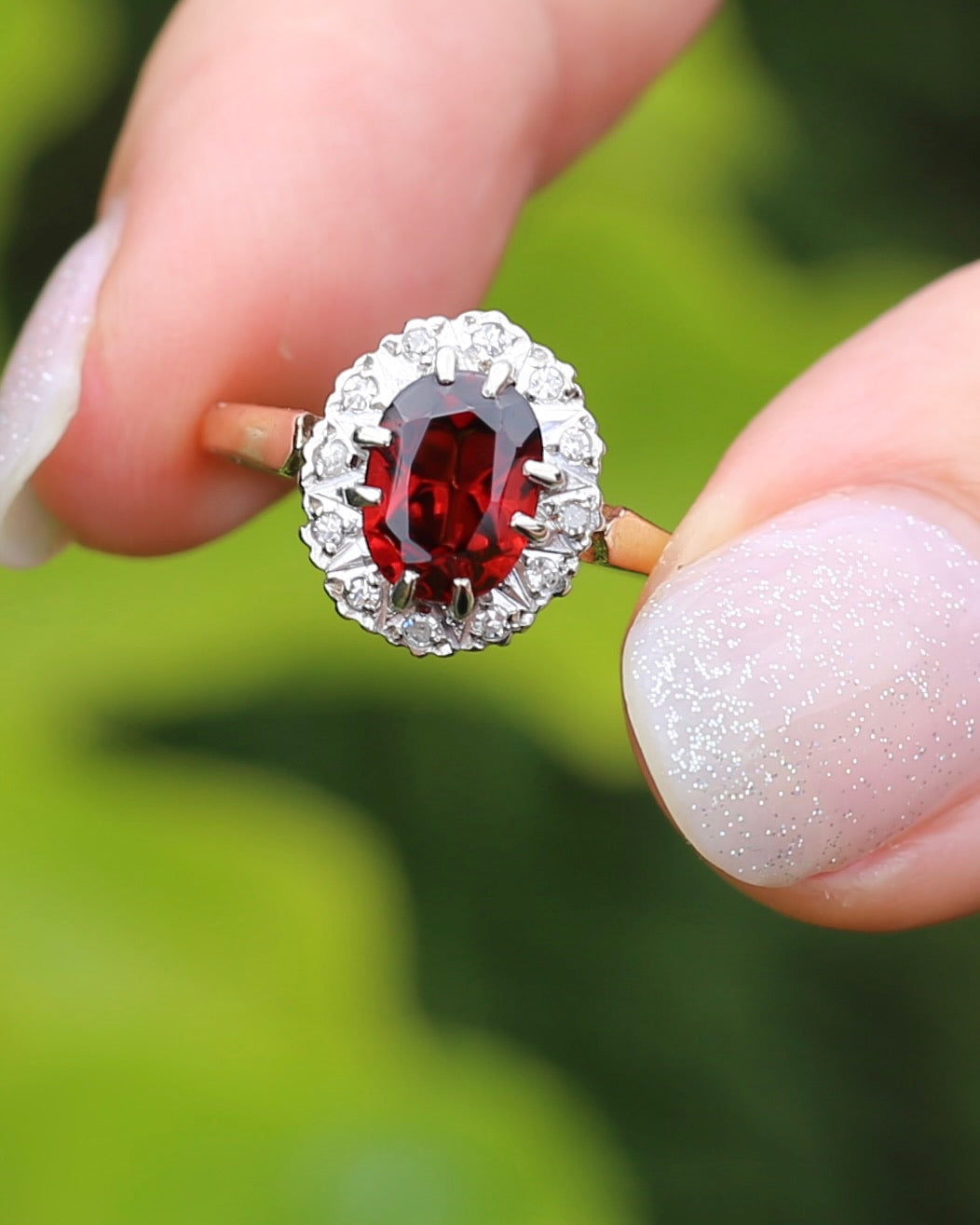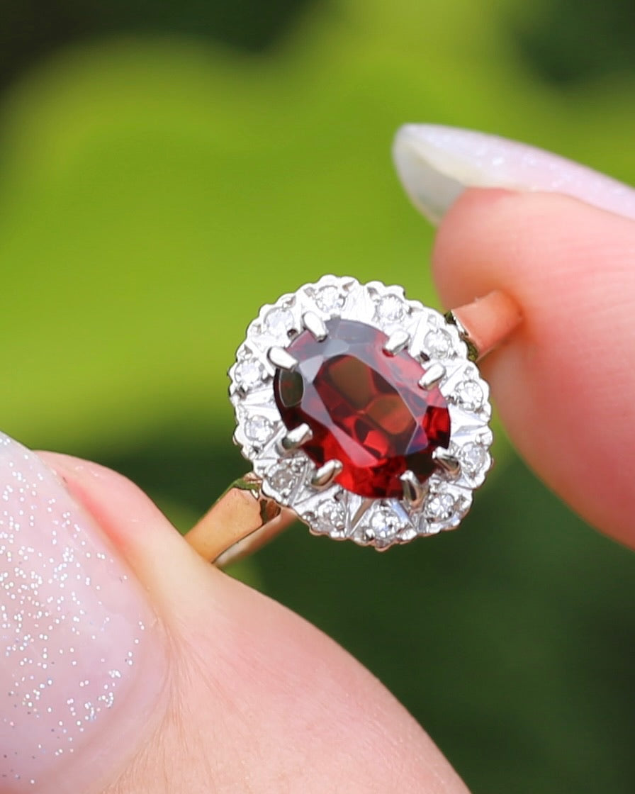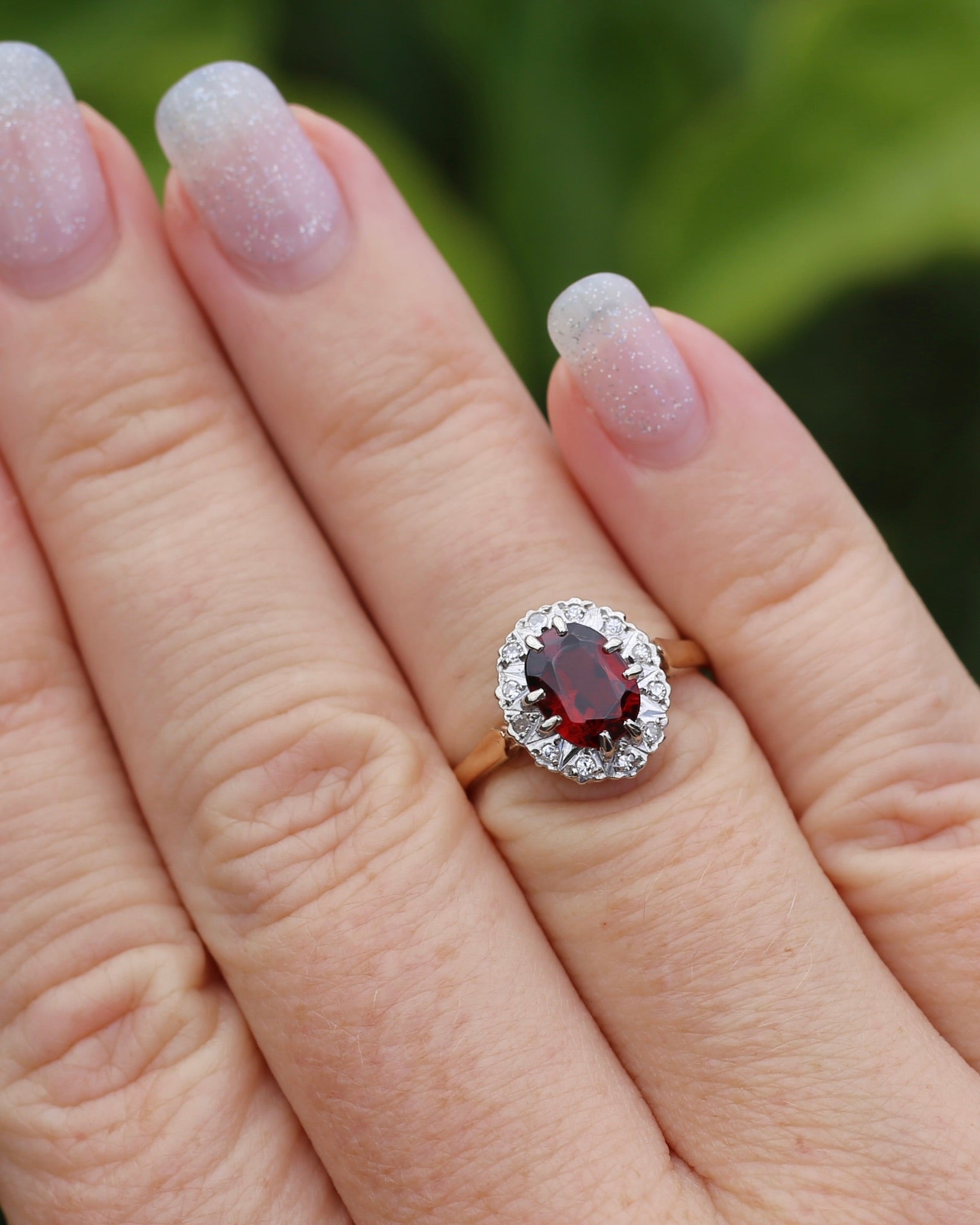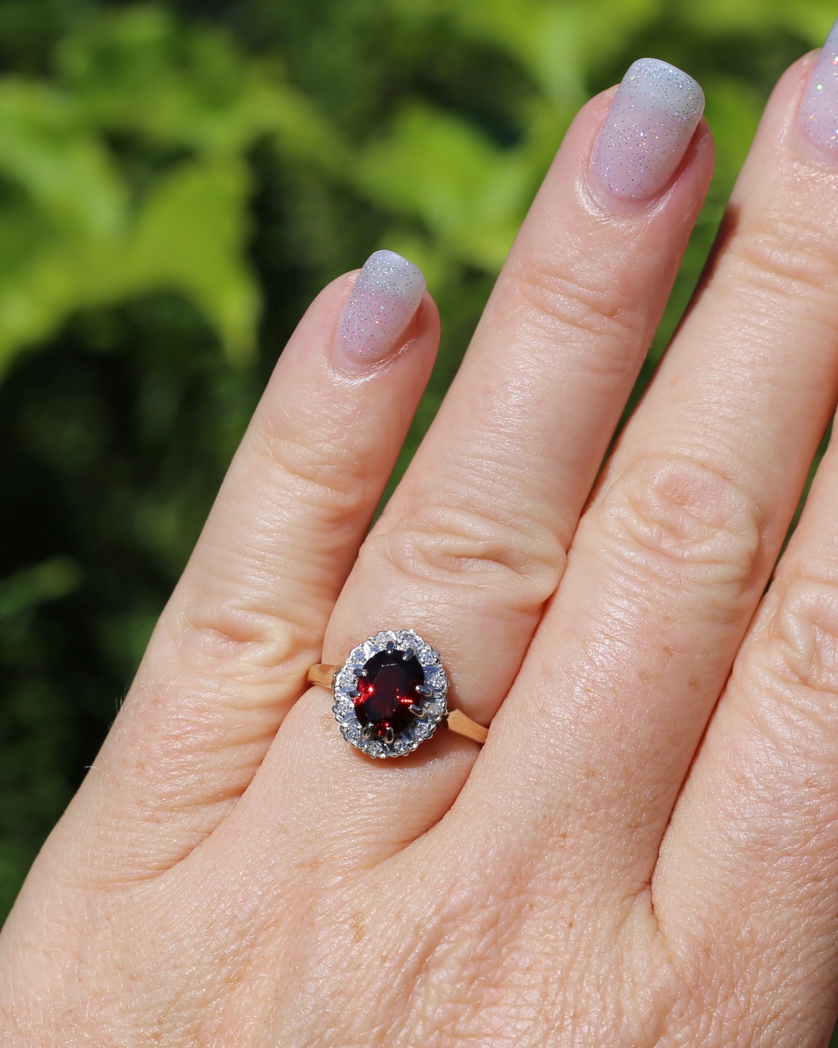 Condition - evidence of sizing at the back, some wear to the claws on the halo - expected with age, garnet stone and claws in lovely condition.