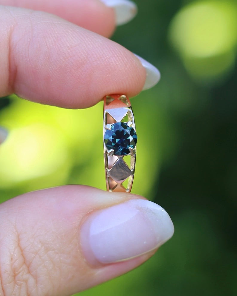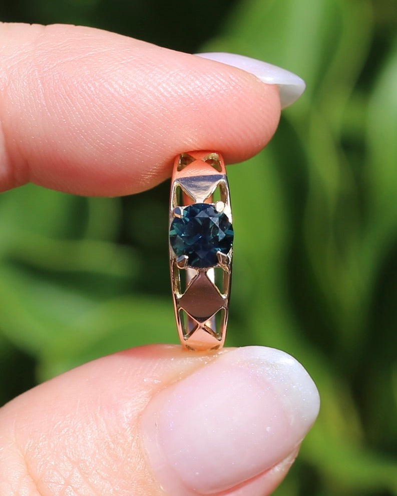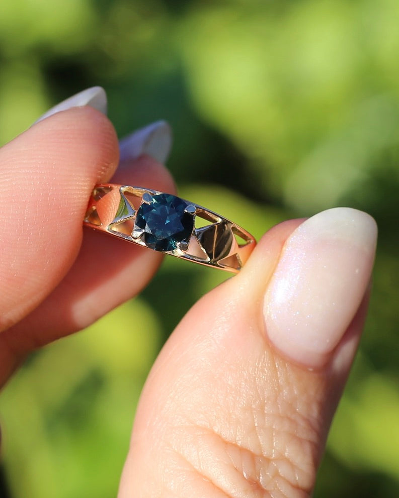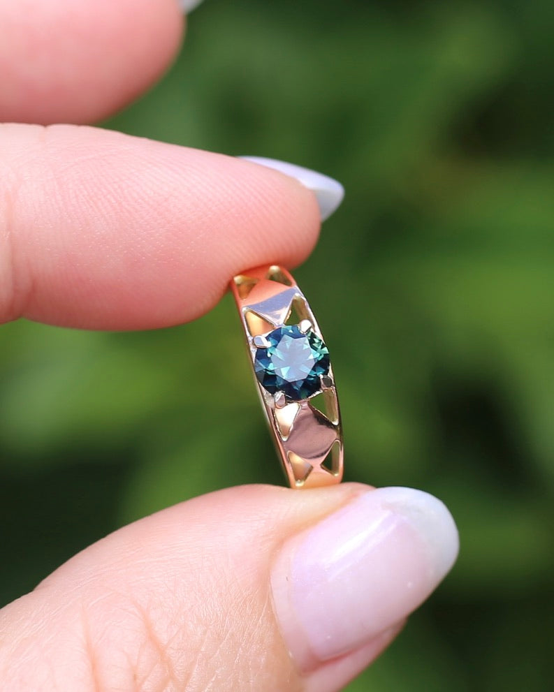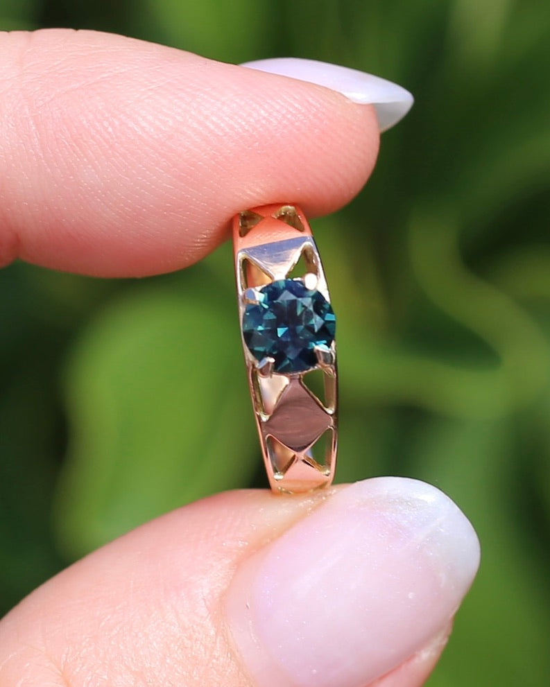 1ct Natural Teal Australian Sapphire in Hand Carved 14ct Rosey Gold Ring, size M or 6.25, 3.14g