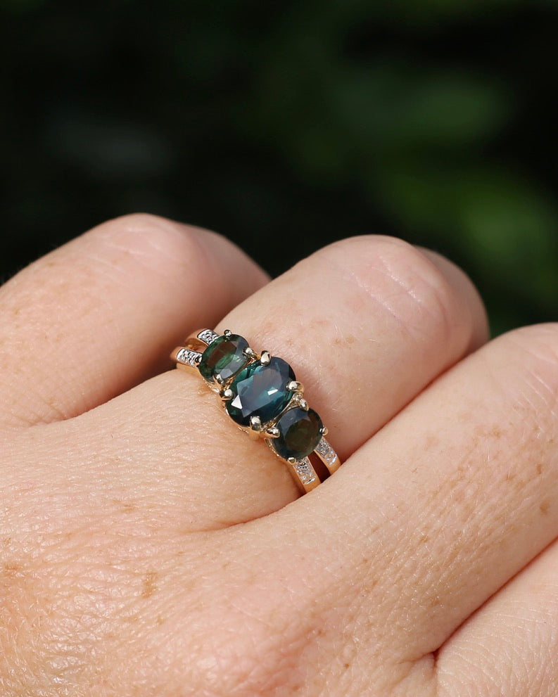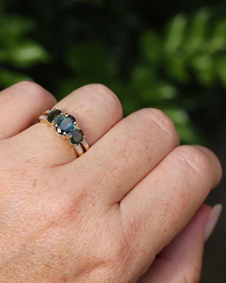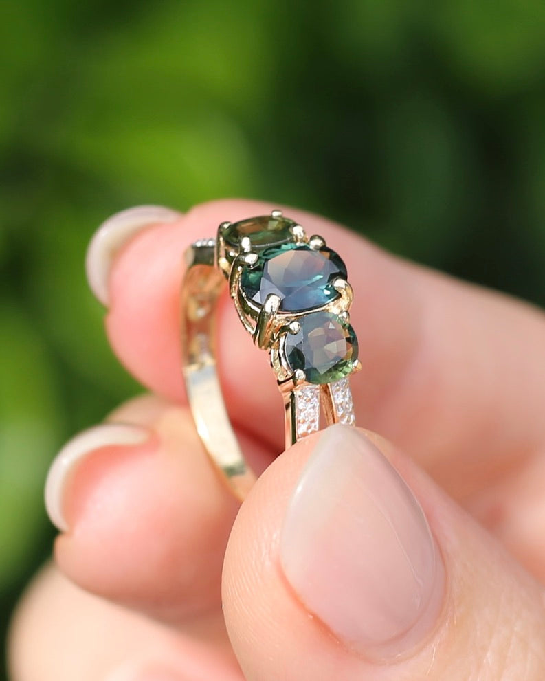 The centre stone here is dominated by those parti blue greens, and framed by two olive green sapphires - in slightly different hues. We love this pairing - the range of colours of sapphires that Australia has to offer in the green range. The centre stone has lovely colour play - from the hunter green, through blues and even fronds of yellow. The richness of the gold and the warmth of the olive green stones really allow this one to sing.