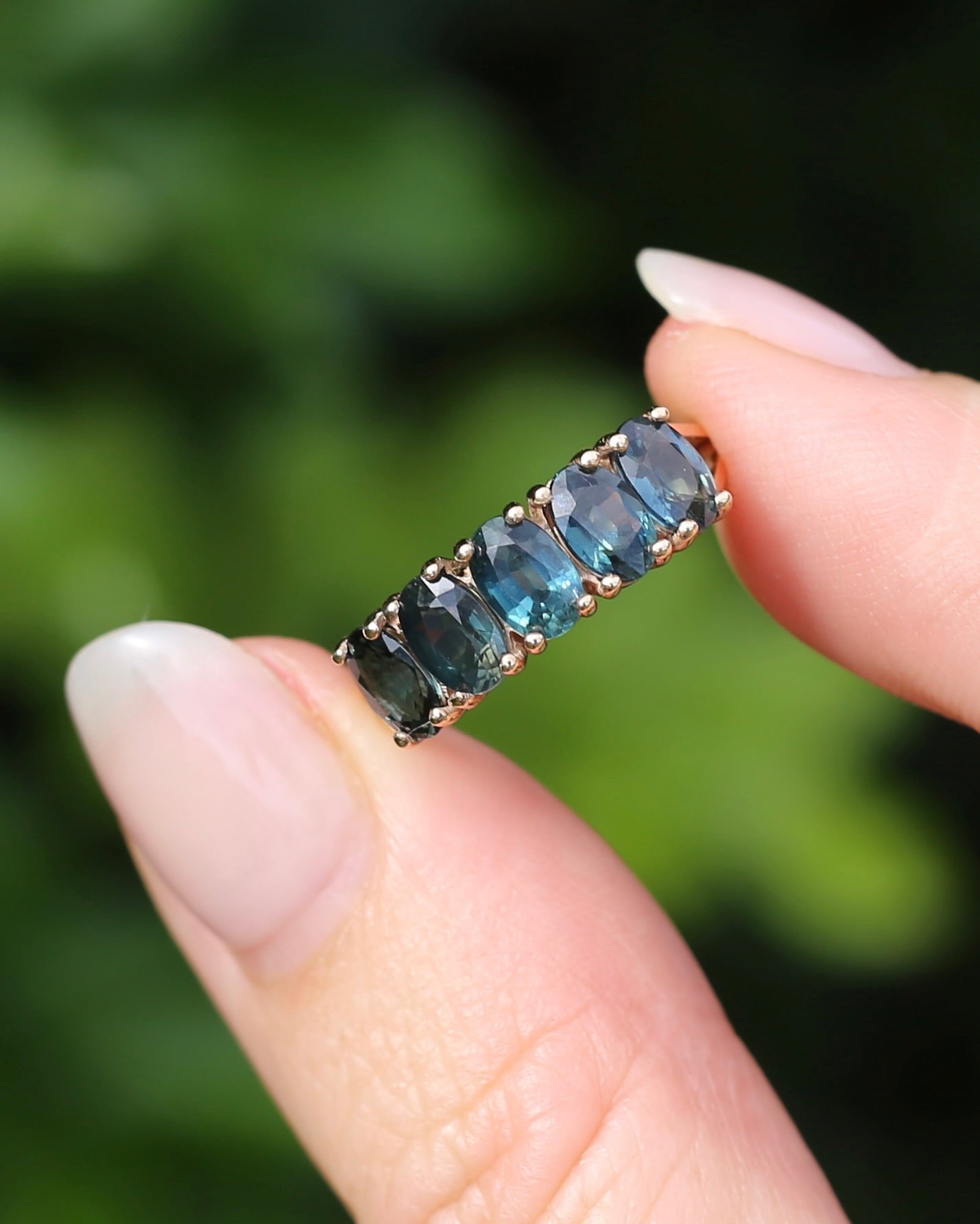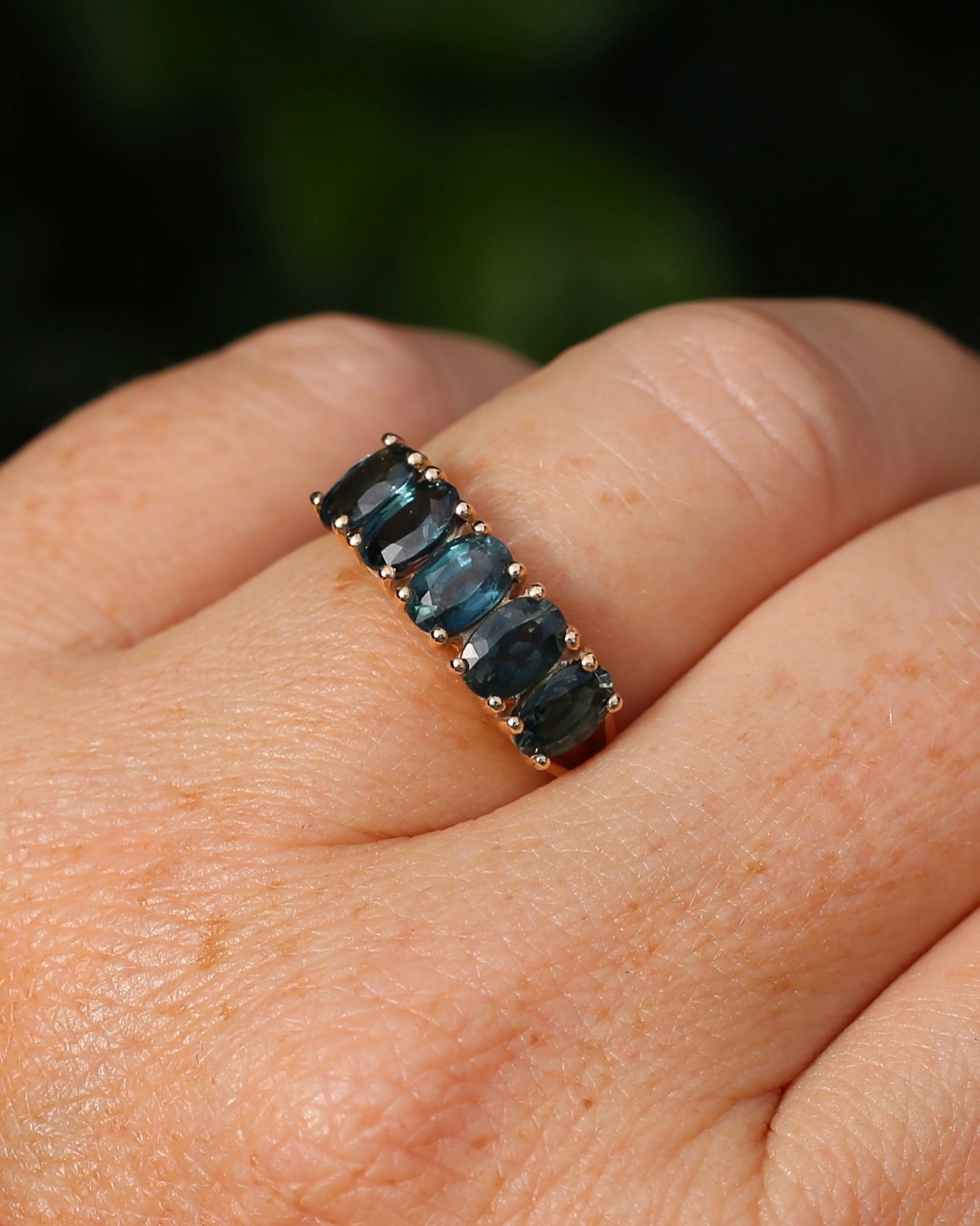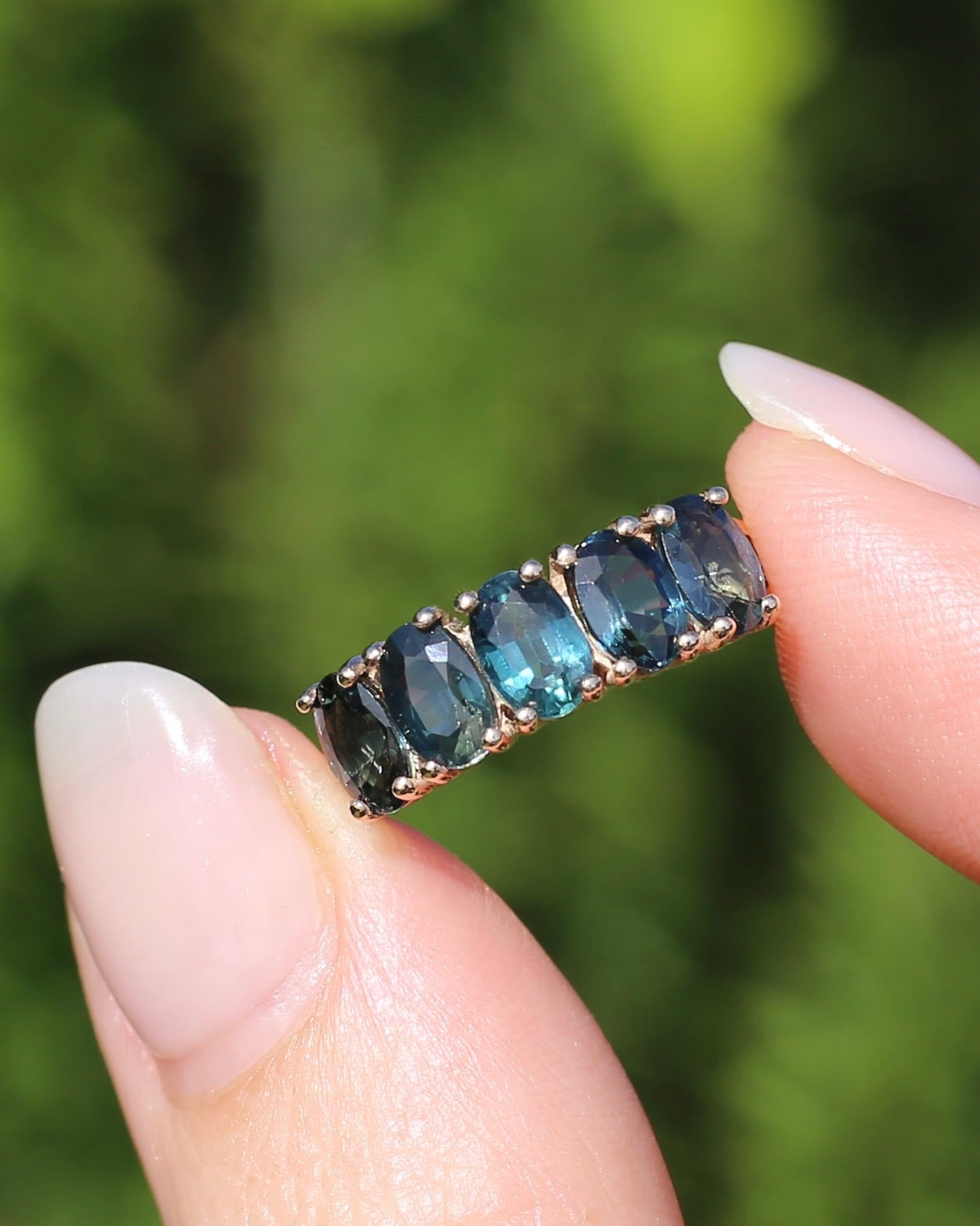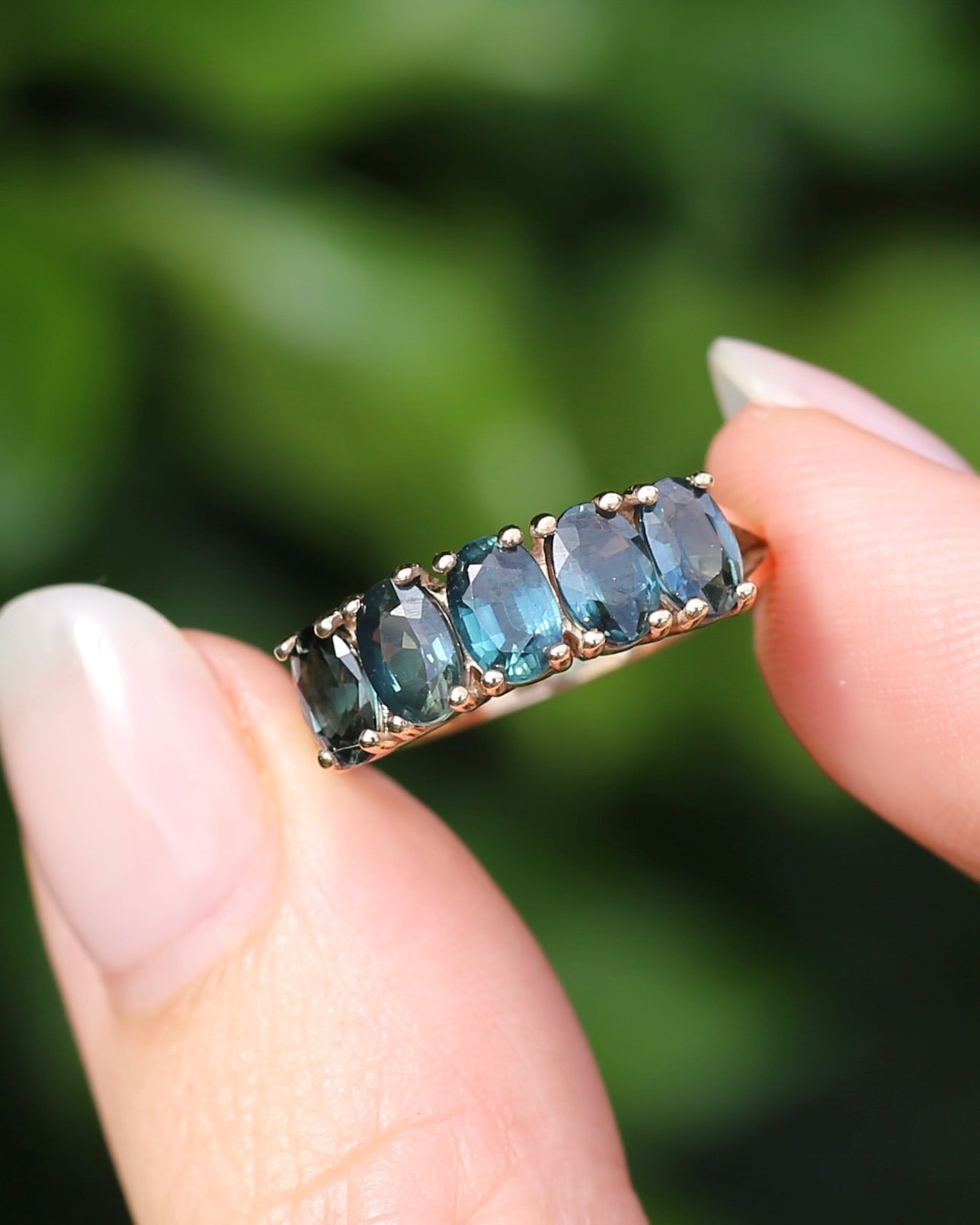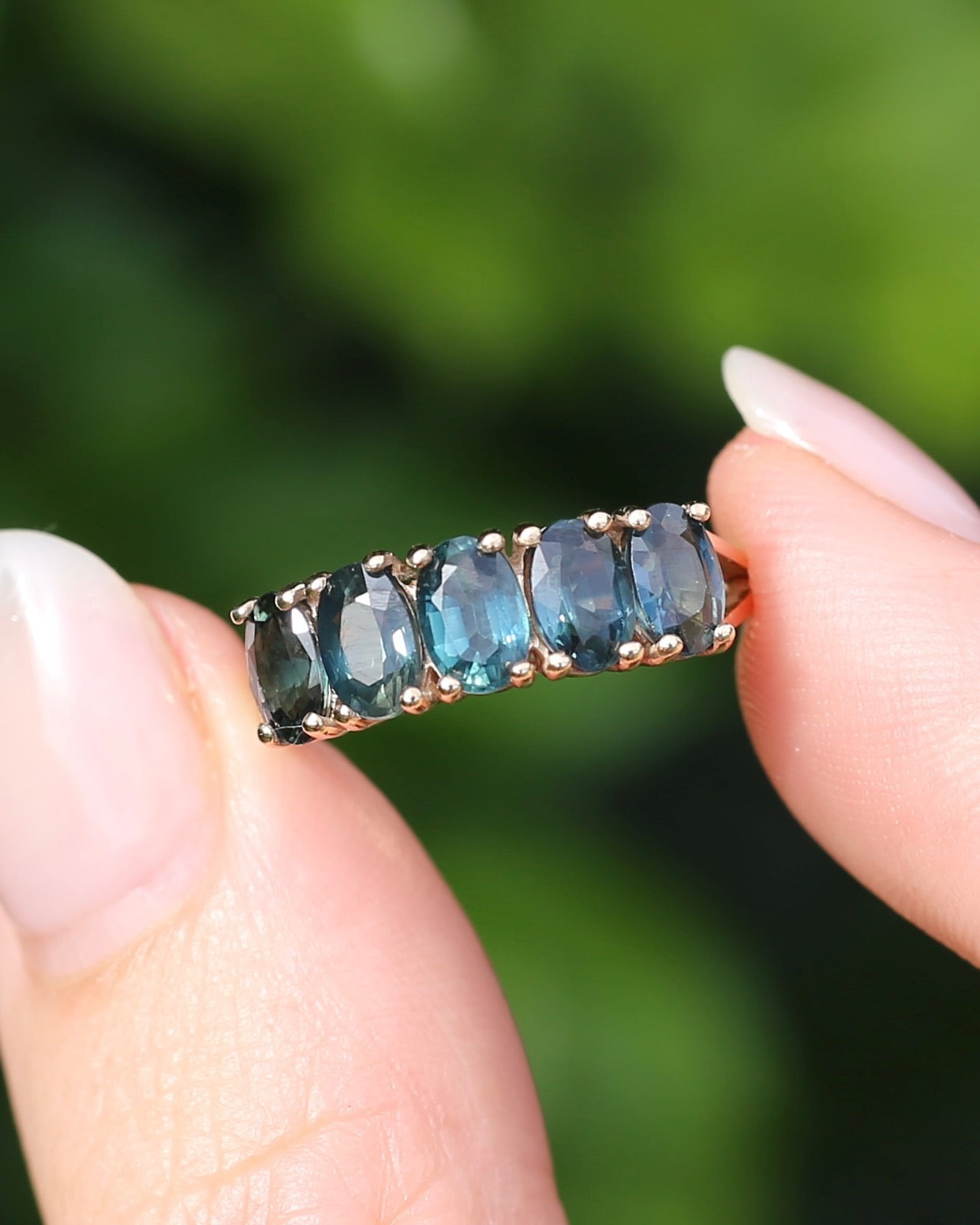 These stones are all in the teal range - but that does not mean they are the same. That is the magic of the parti sapphire. The centre stone has a brighter turquoise hue to it, and the side stones when viewed from the side have some very clear green and yellow streaks. The inky darkness in the shadows comes alive in the sun and we love both colours paired with the yellow gold - they are rich and sumptuous as a pairing.
