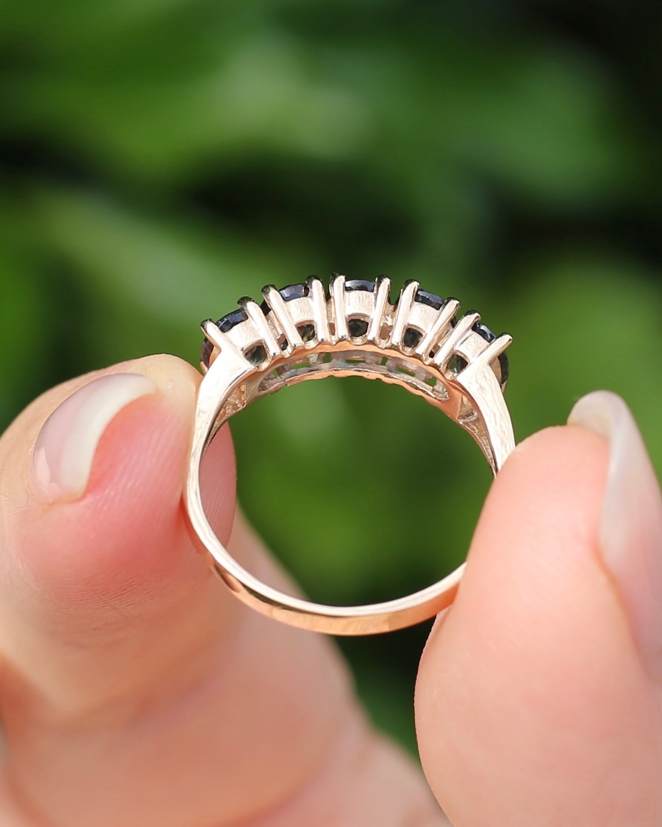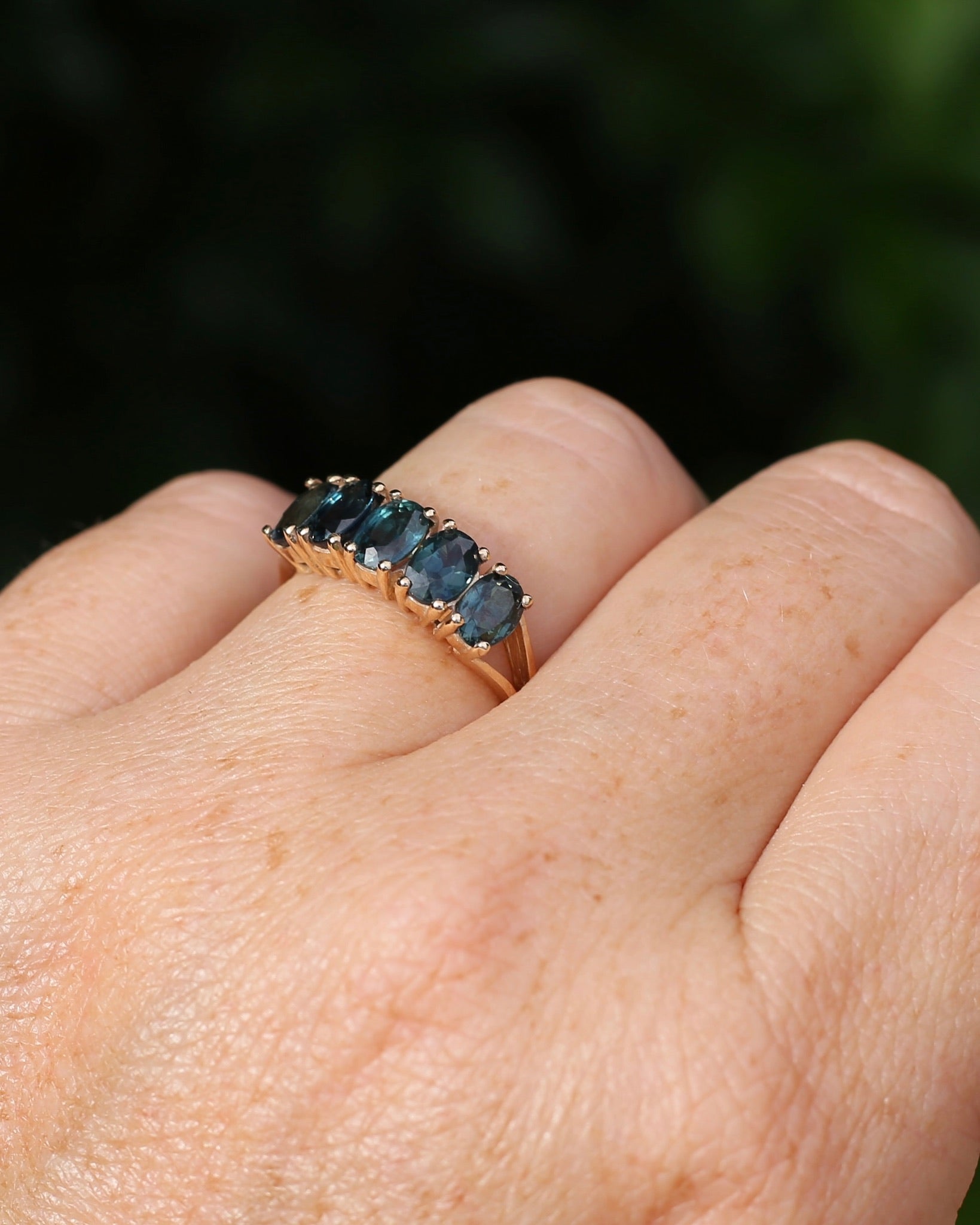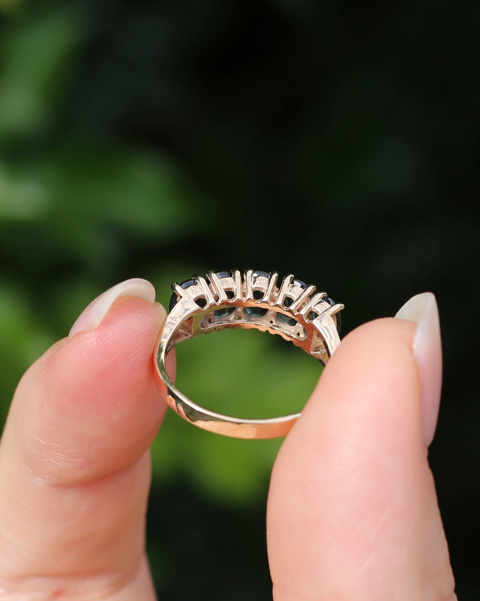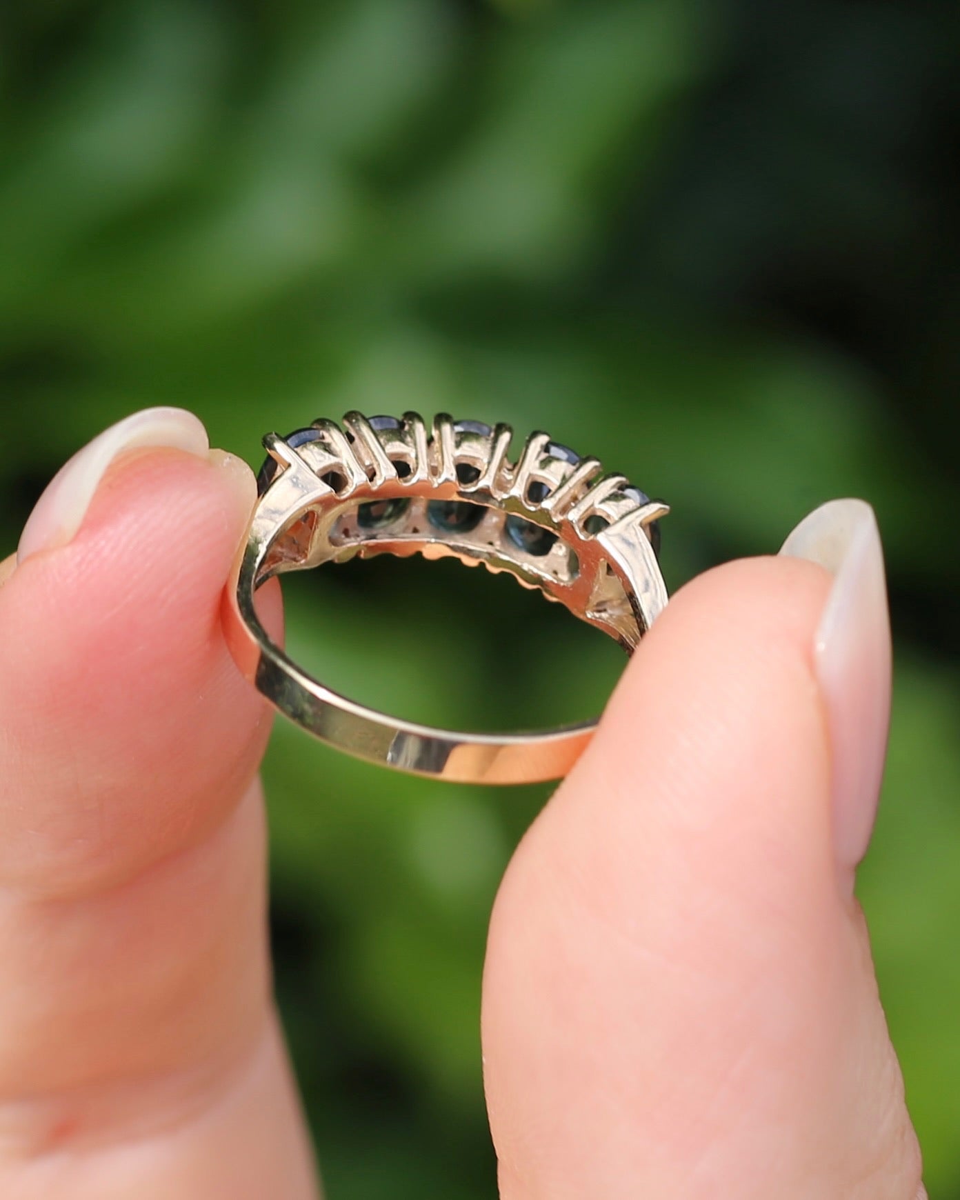 Claw set in a vintage 9ct gold ring, these 5 stones are the same size - not graduated - and we love the effect. We love that the claws are top and bottom - not only for the look, but the protection of the stones. From the side the profile of the baskets is angular and we love the curve of the band and the repeating pattern of the baskets. The band is a nice sturdy 9ct band - with all the focus on those stones that run across the whole top of the finger.