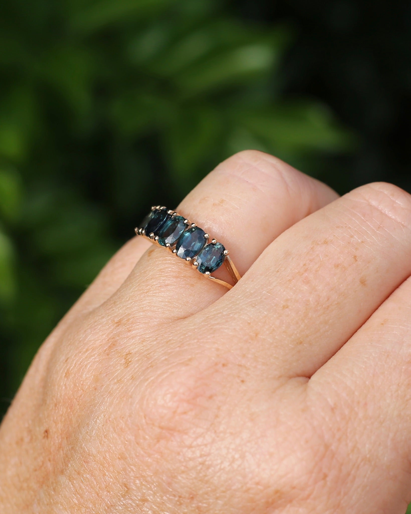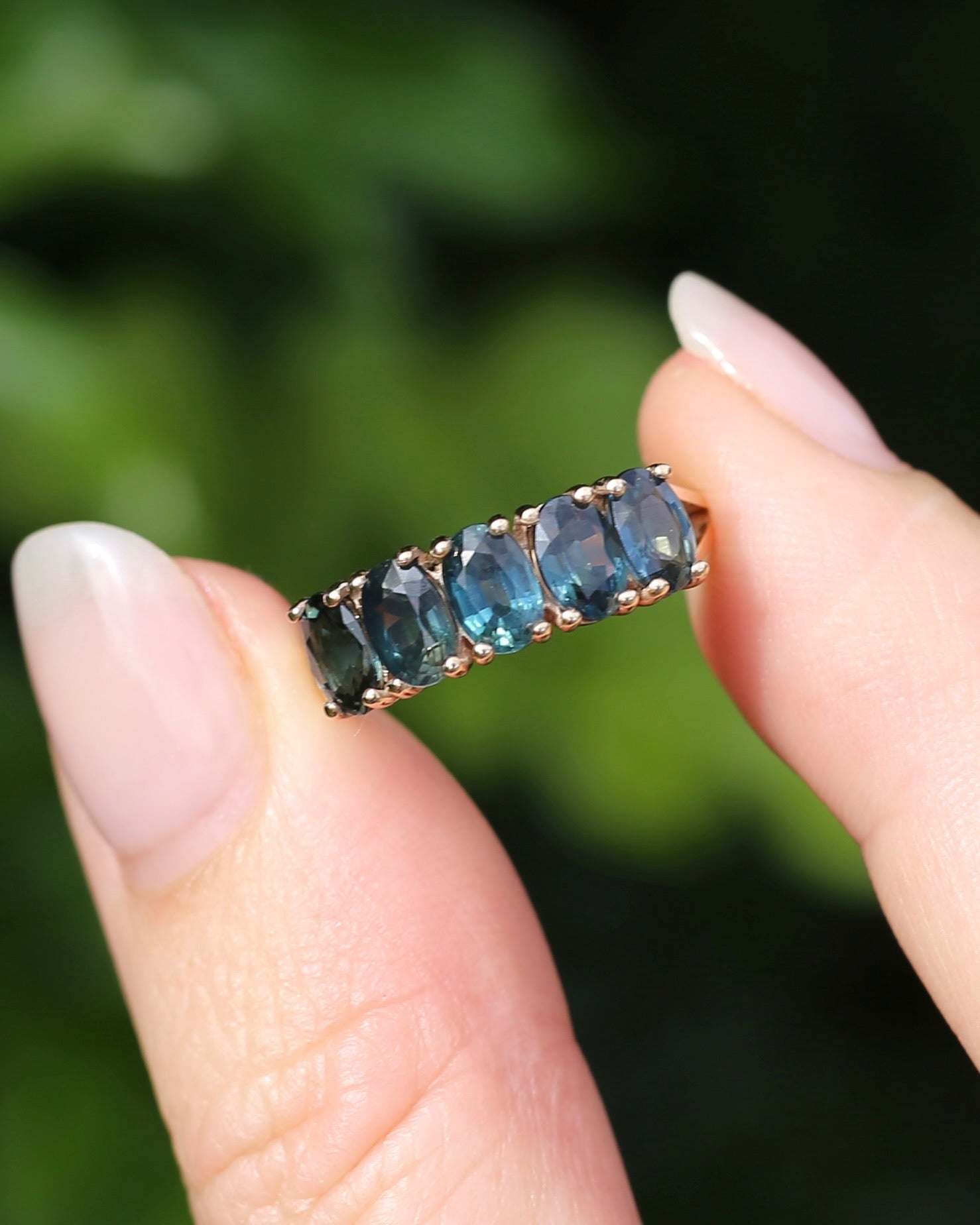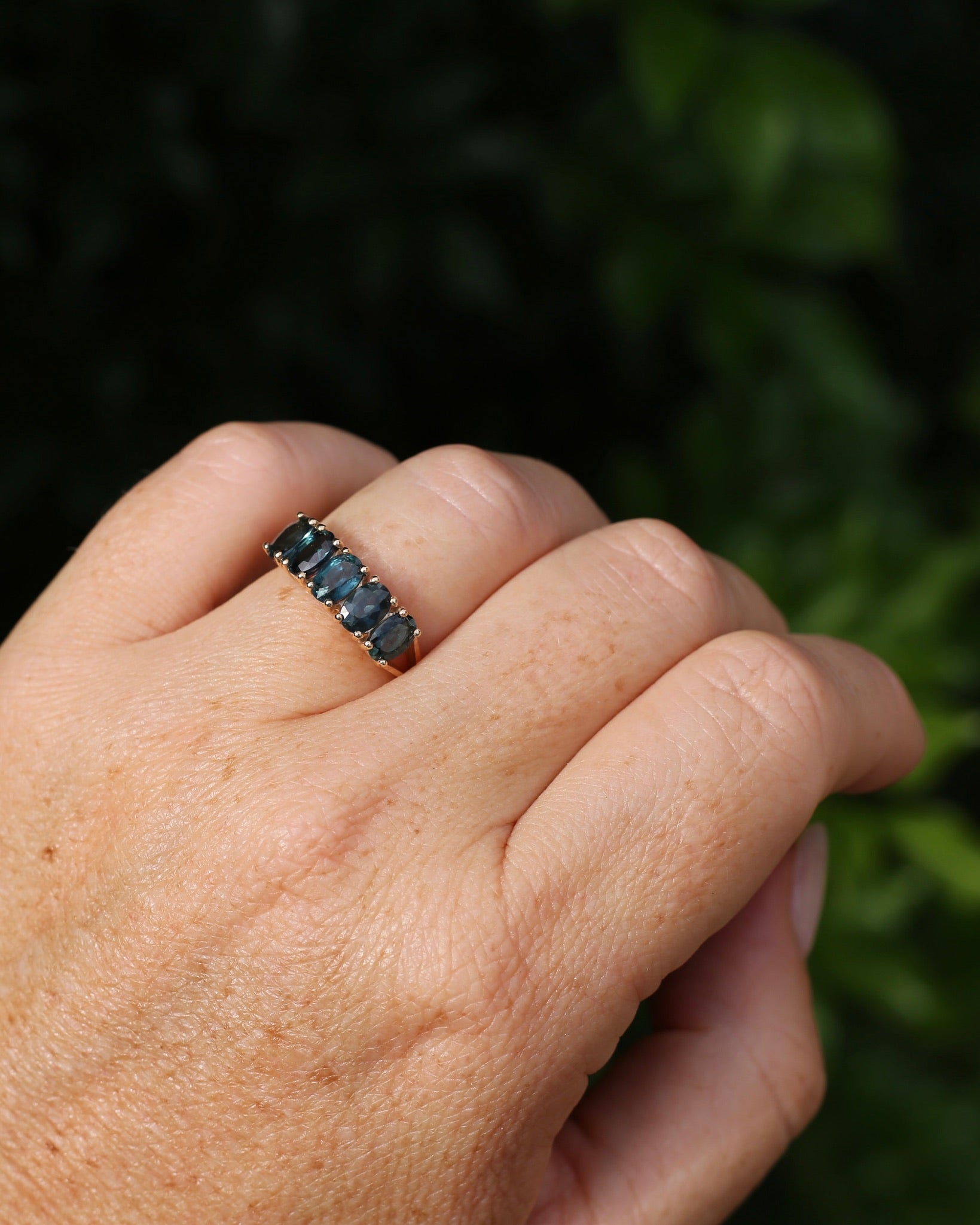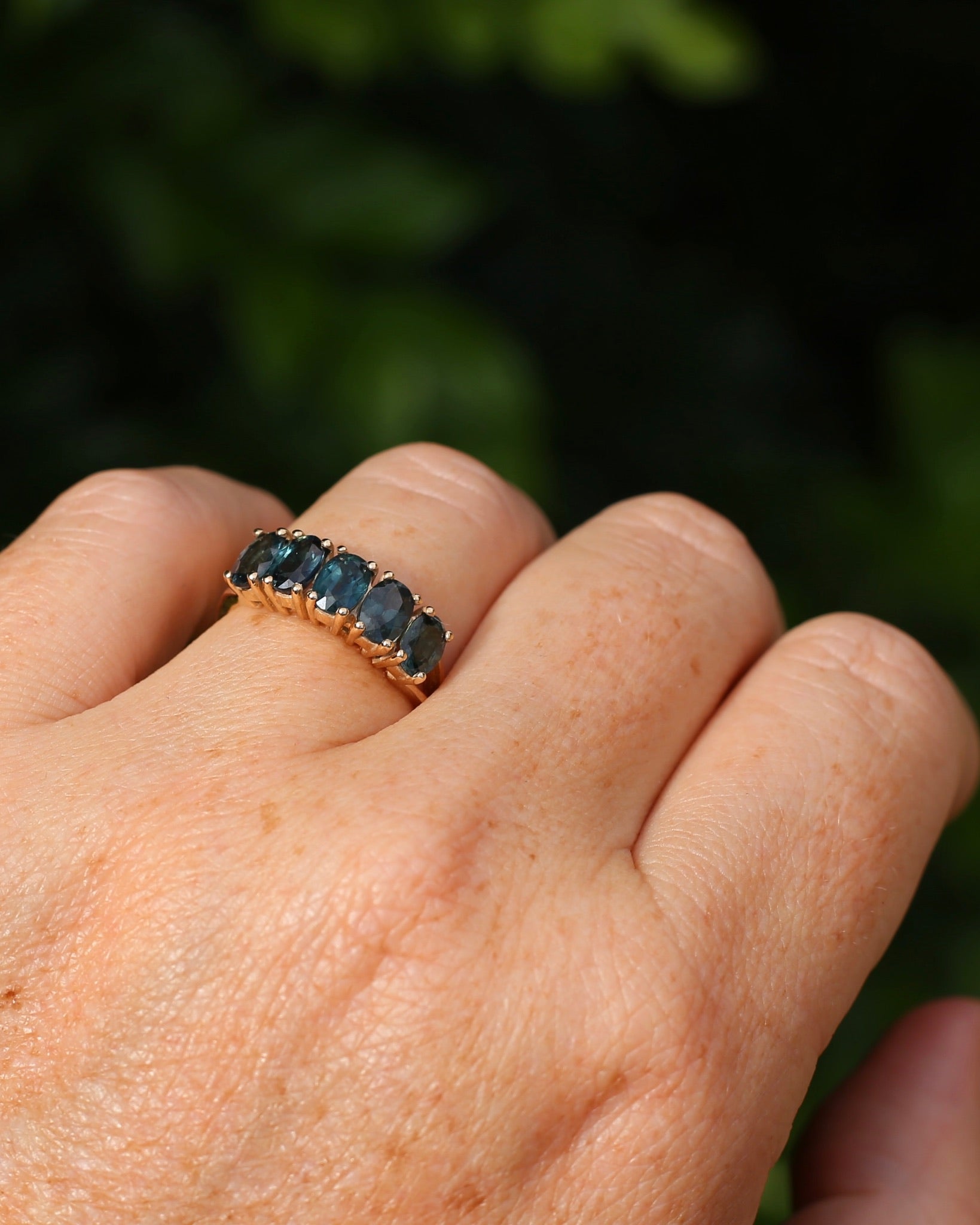 Claw set in a vintage 9ct gold ring, these 5 stones are the same size - not graduated - and we love the effect. We love that the claws are top and bottom - not only for the look, but the protection of the stones. From the side the profile of the baskets is angular and we love the curve of the band and the repeating pattern of the baskets. The band is a nice sturdy 9ct band - with all the focus on those stones that run across the whole top of the finger.