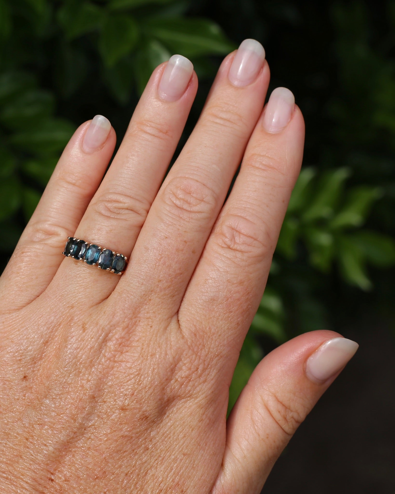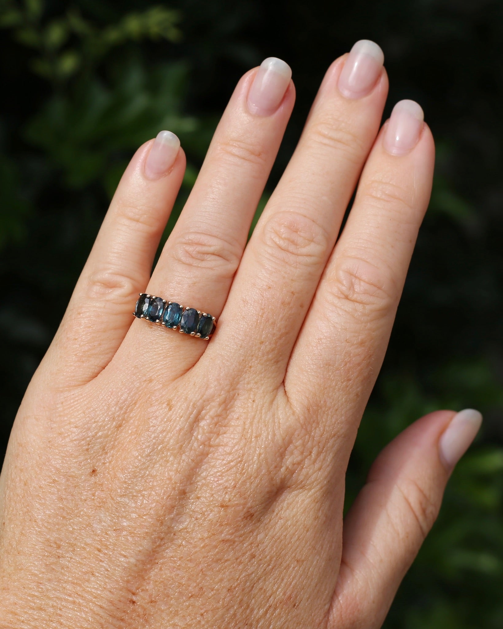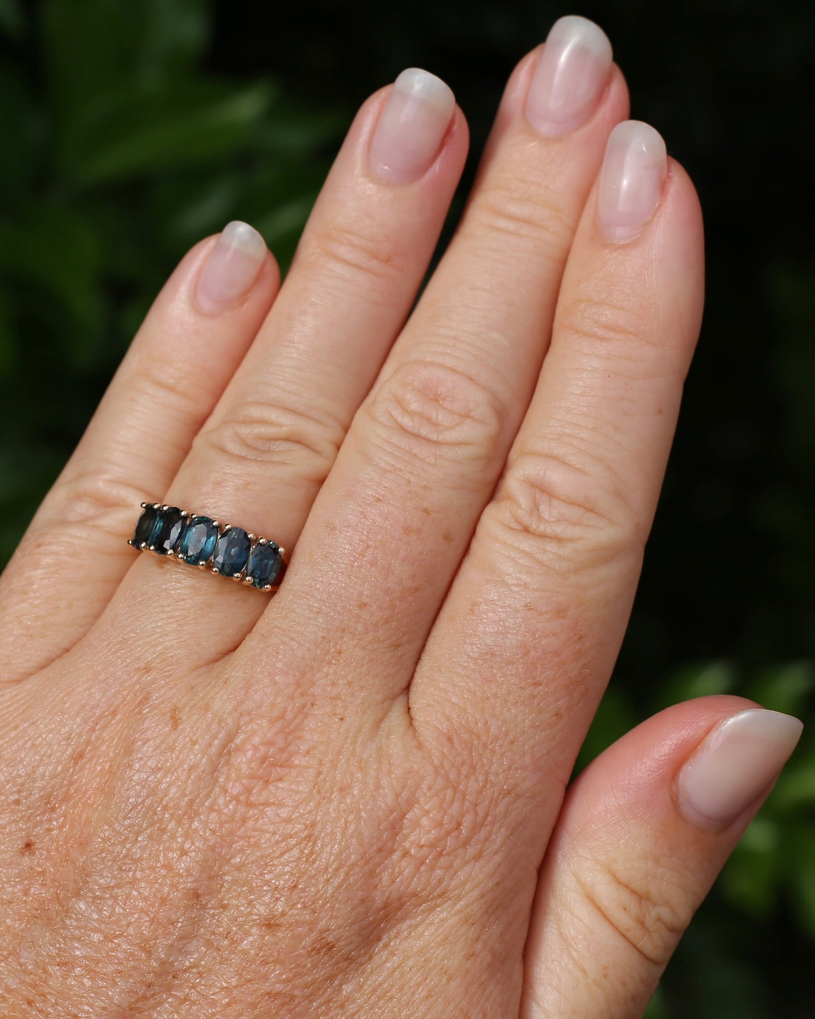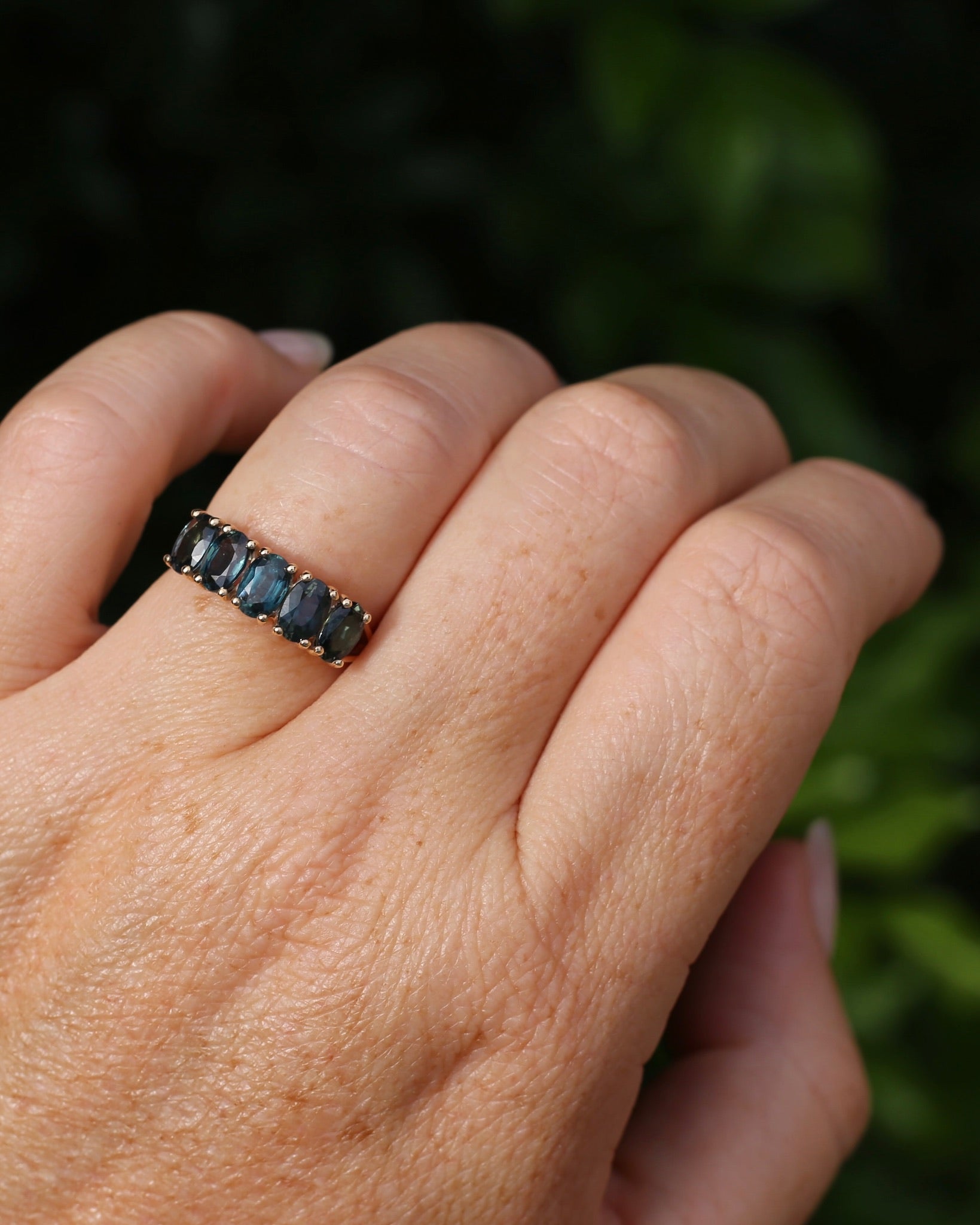 Claw set in a vintage 9ct gold ring, these 5 stones are the same size - not graduated - and we love the effect. We love that the claws are top and bottom - not only for the look, but the protection of the stones. From the side the profile of the baskets is angular and we love the curve of the band and the repeating pattern of the baskets. The band is a nice sturdy 9ct band - with all the focus on those stones that run across the whole top of the finger.