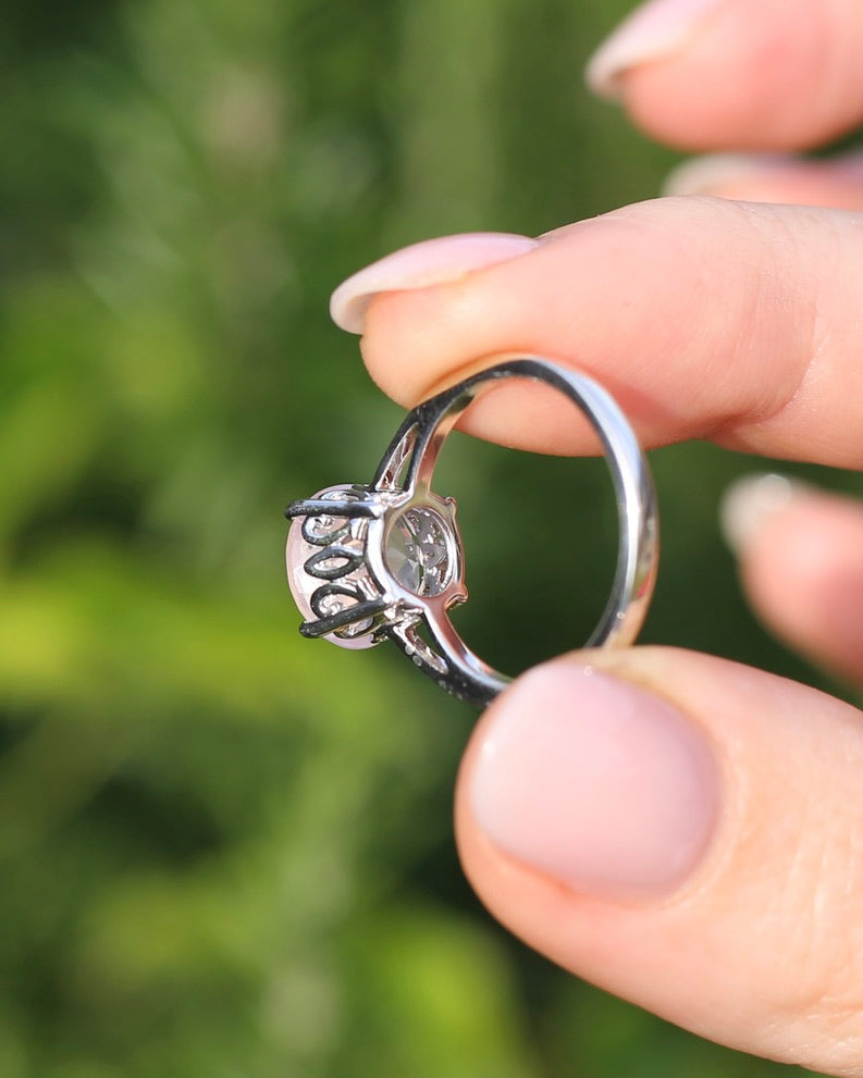 This ring is such a fabulous filigree and soft pink roses vibe. The roses quartz has that amazing slight opaqueness and as you stare through the facets the translucence and opaqueness dance in the palest shade of pink. This stone is a lovely statement size - 10mm and the setting is fabulous too. The basket is filigree - and we love the delicate shapes against the soft tones of the ring.