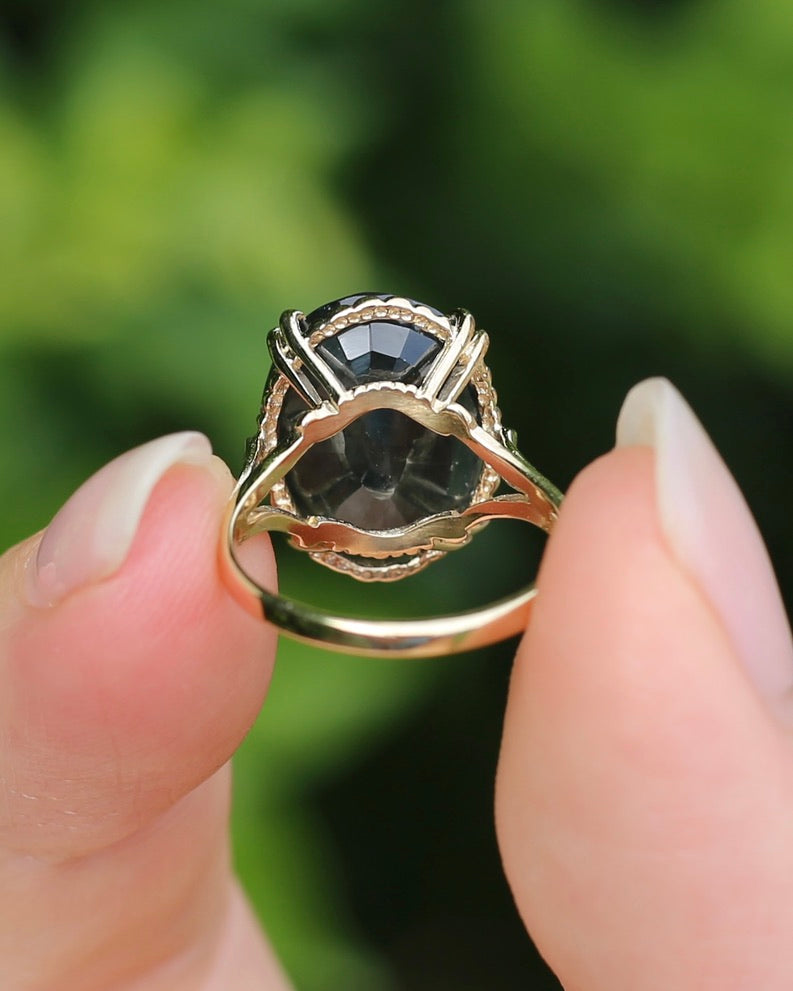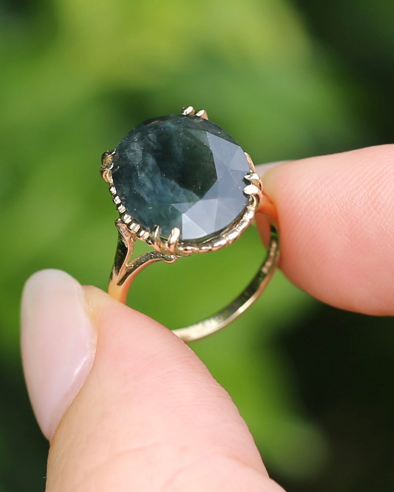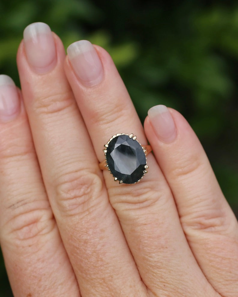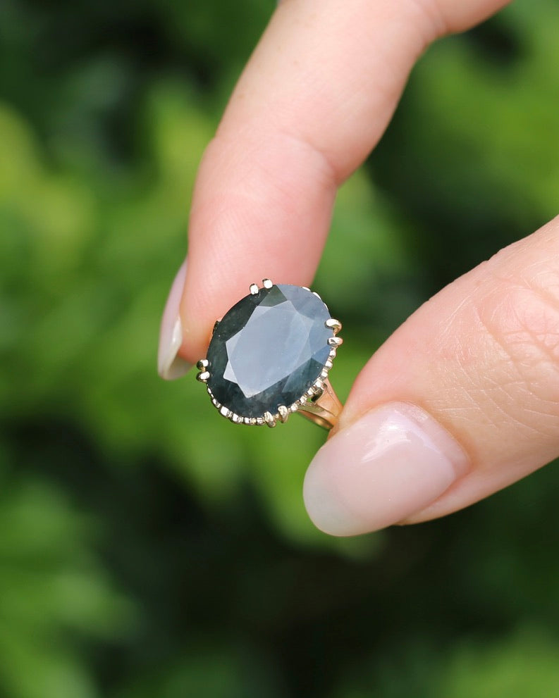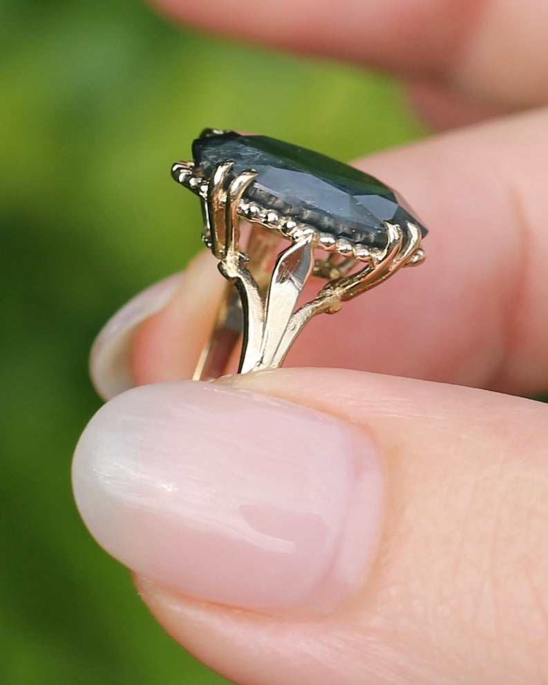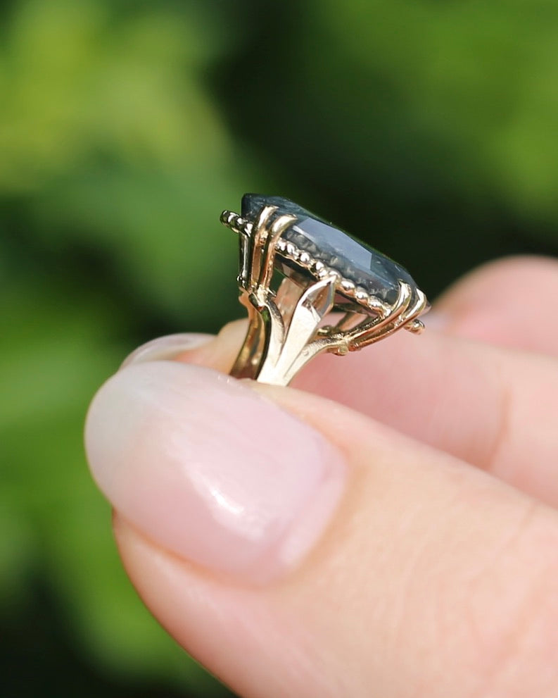 Held in a flour claw double claw setting with wire frame this ring is all about that big brooding stone.