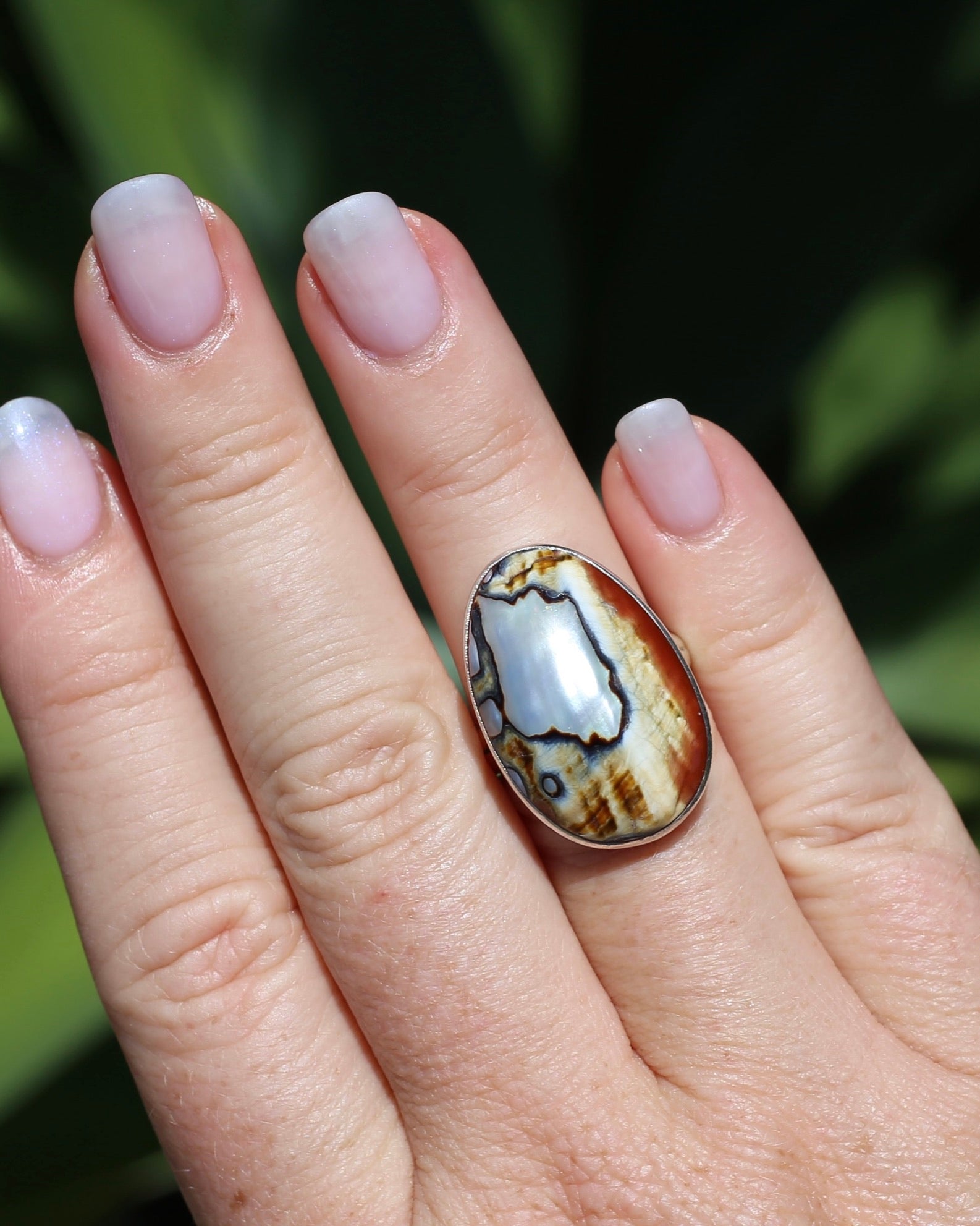 Abalone Shell Cabochon Bezel Set Ring, Sterling Silver, sizse N or 6.75 - fits more like an M1/2 or 6.5, 9.60g