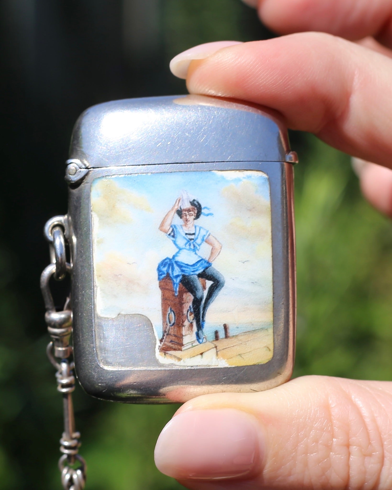 Antique 1896 Vesta Case featuring Enamel Sailor Girl, Sterling Silver, 39g