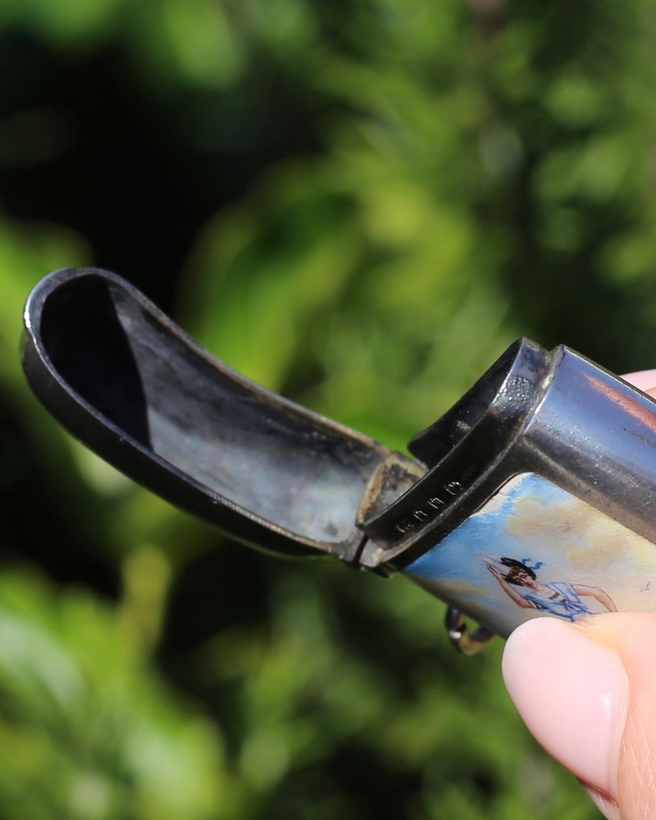 Well, we have never seen a vesta quite so unusual as this! A fabulous antique Vesta to store matches with an amazing enamel sailor girl on the front. Given the inscription on the back "From Bob, to Roy 1899" we are guessing that this was a gift to Roy who was likely in the navy and on his way to the Second Boer War.