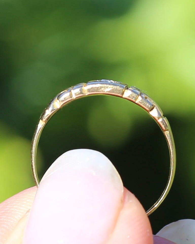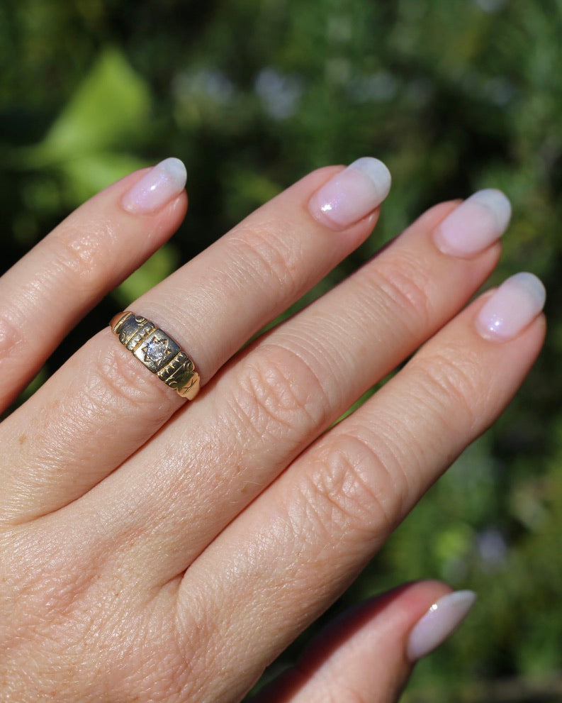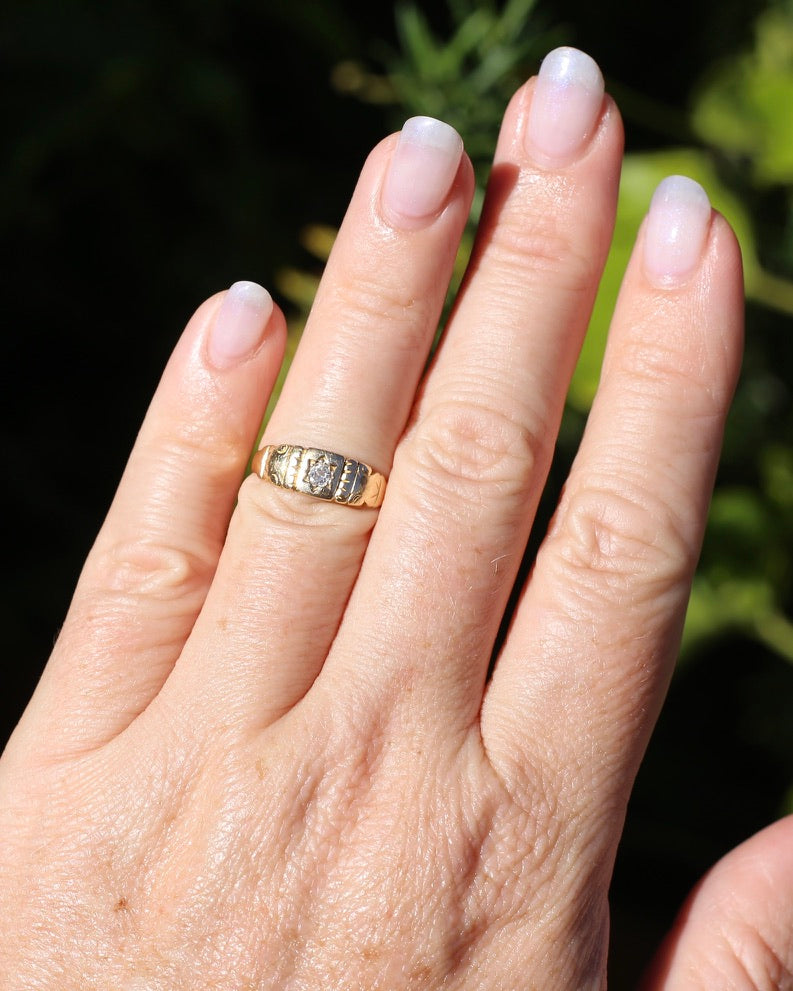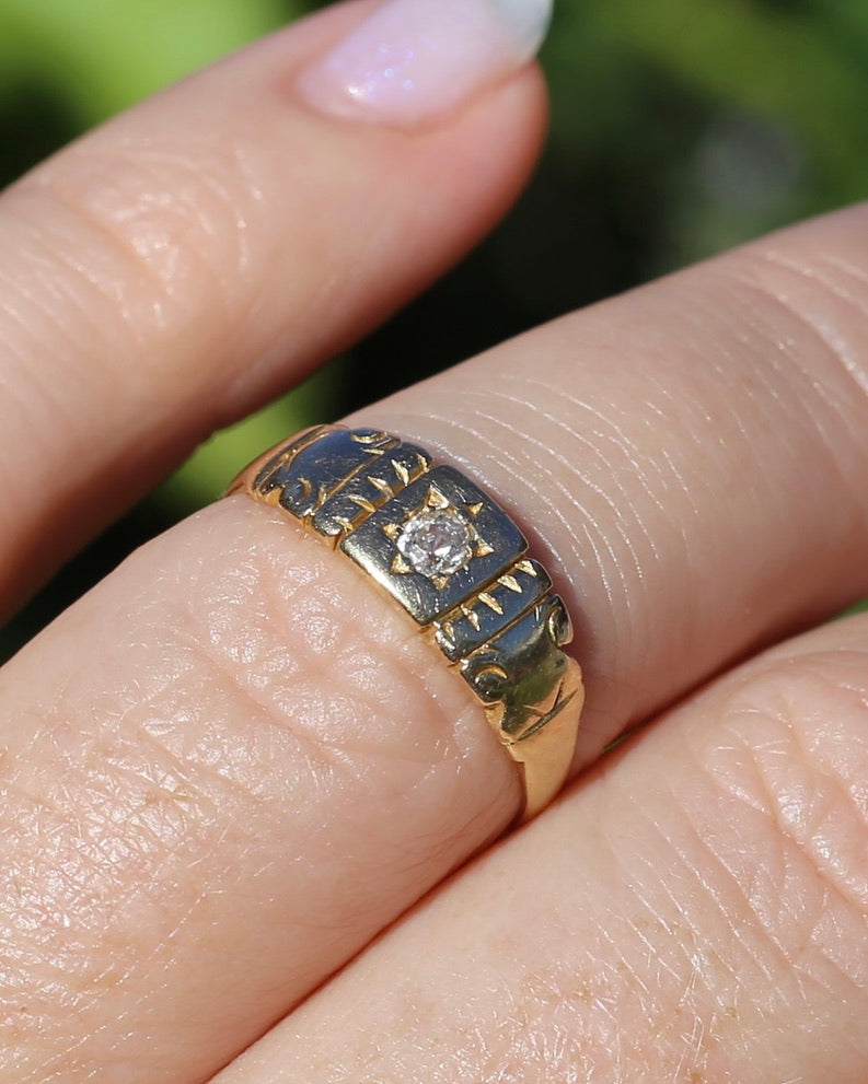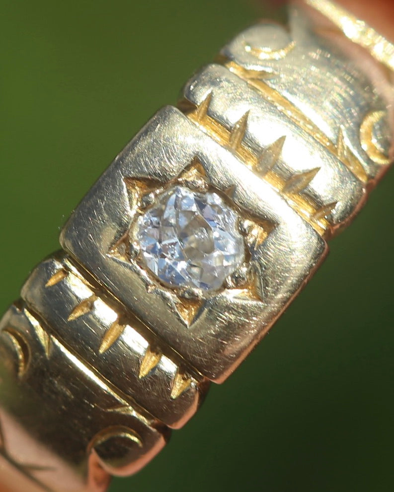 Antique 1898 Old Cut Diamond Star Set Carved Ring, 18ct Yellow Gold, size M1/2 or just under 6.5, 2.74g