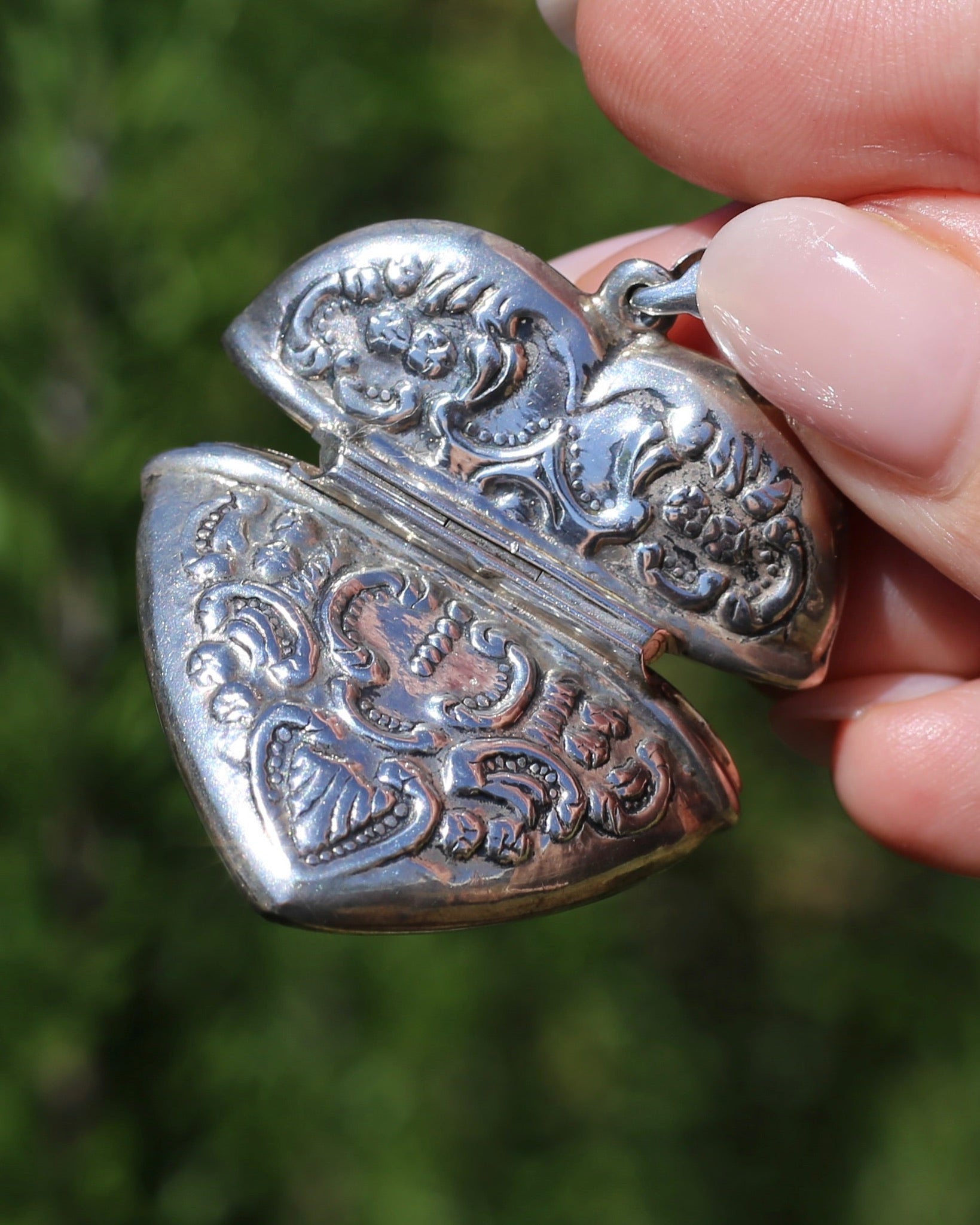 In Victorian times, pendants like this were worn by brides on their wedding day for keepsakes or as a vinaigrette (to hold a perfume soaked sponge to make them smell amazing) The metalwork is called repousse which is where the thin piece of silver is pressed into a mold to gain that amazing pattern.