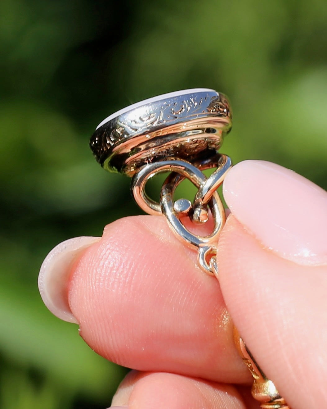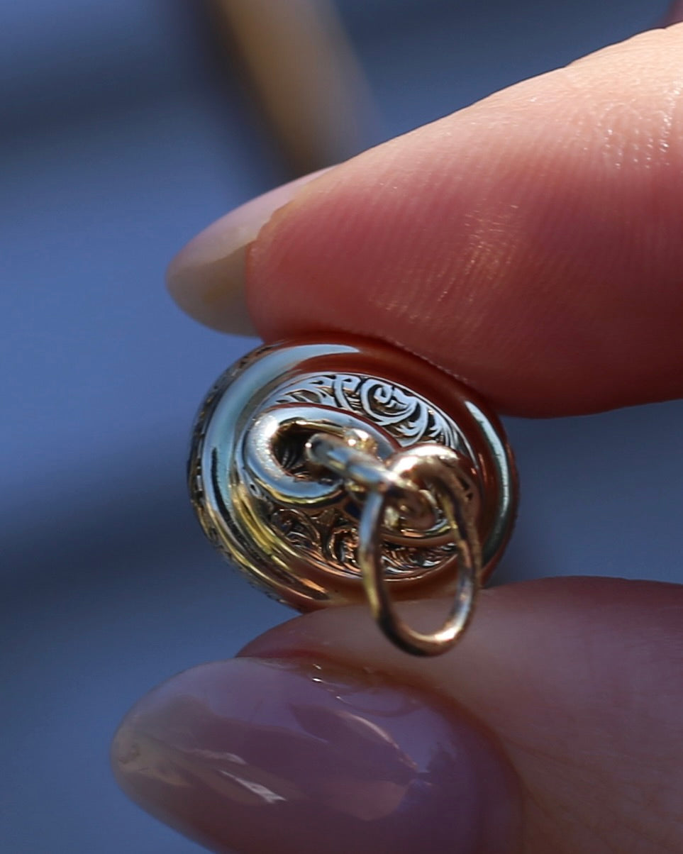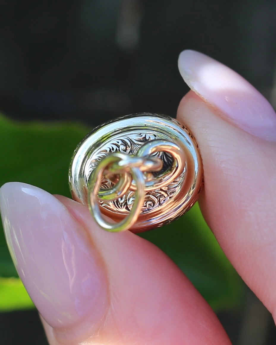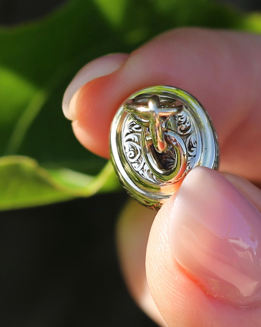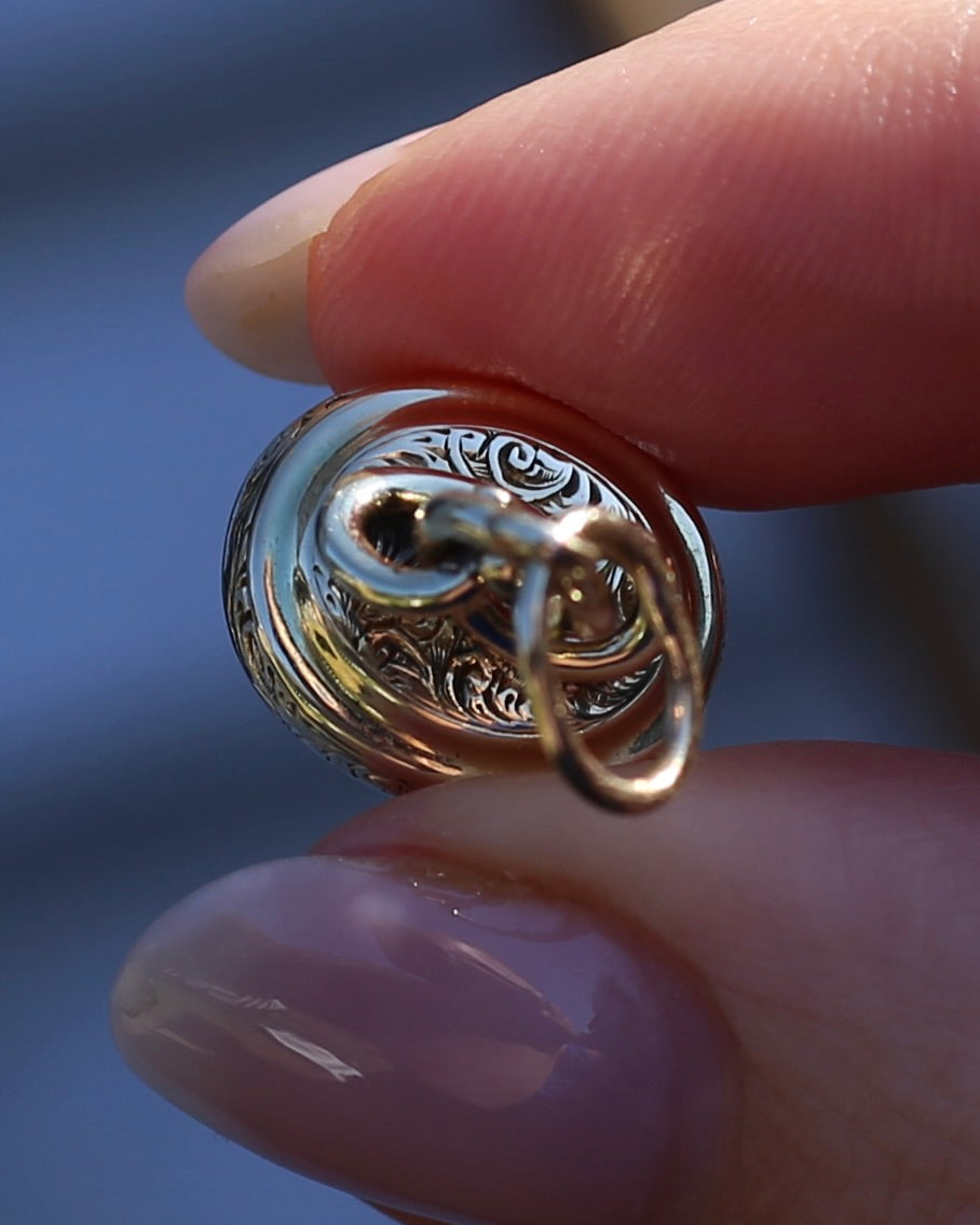 Set in 9ct gold, the edges are covered in a fabulous vine and leaf engraved pattern. This pattern also sits beneath the swirled gold that builds to the bail. We love the opulence of the gold, the engraved details, the swirls. It all screams of the most fabulous past.