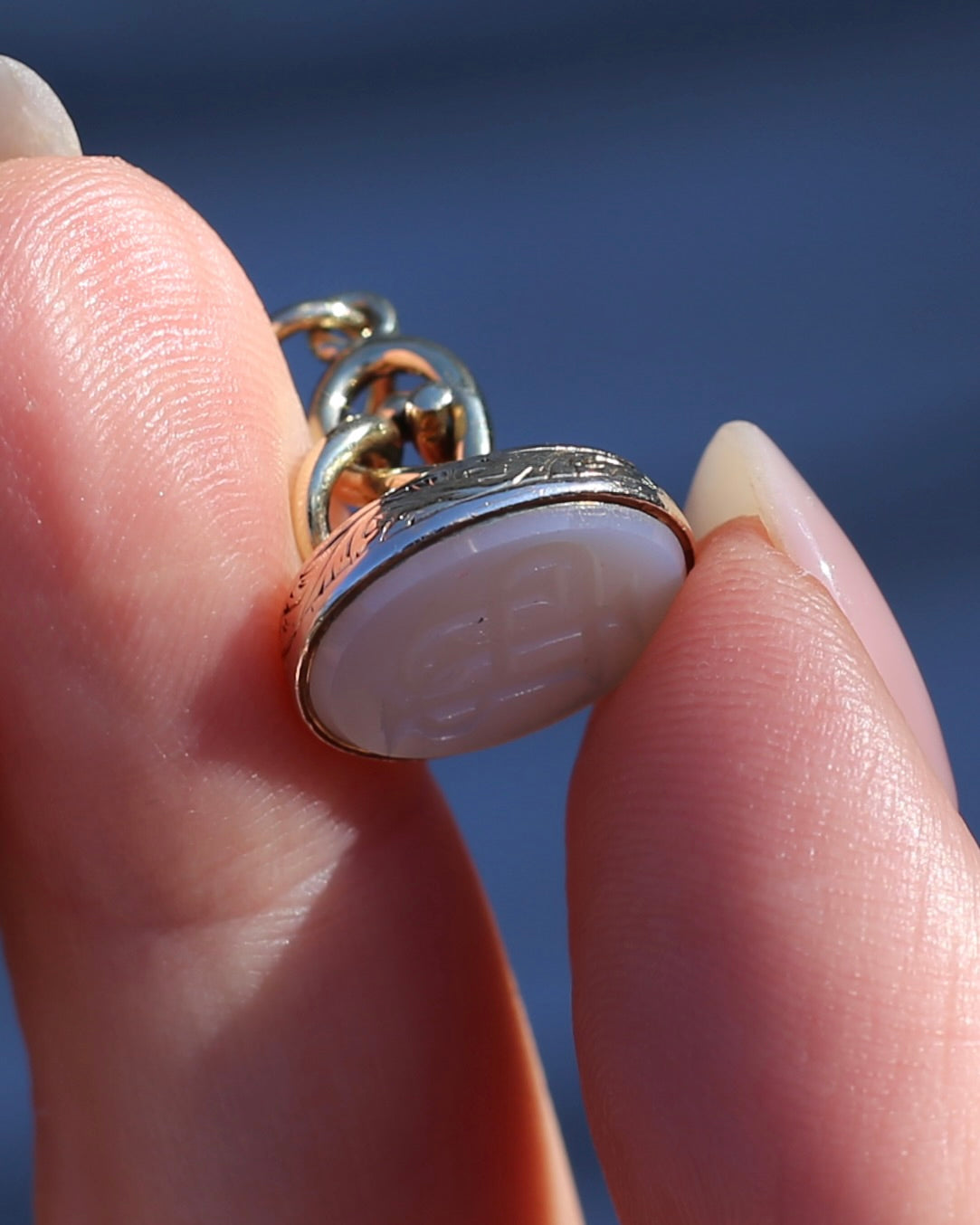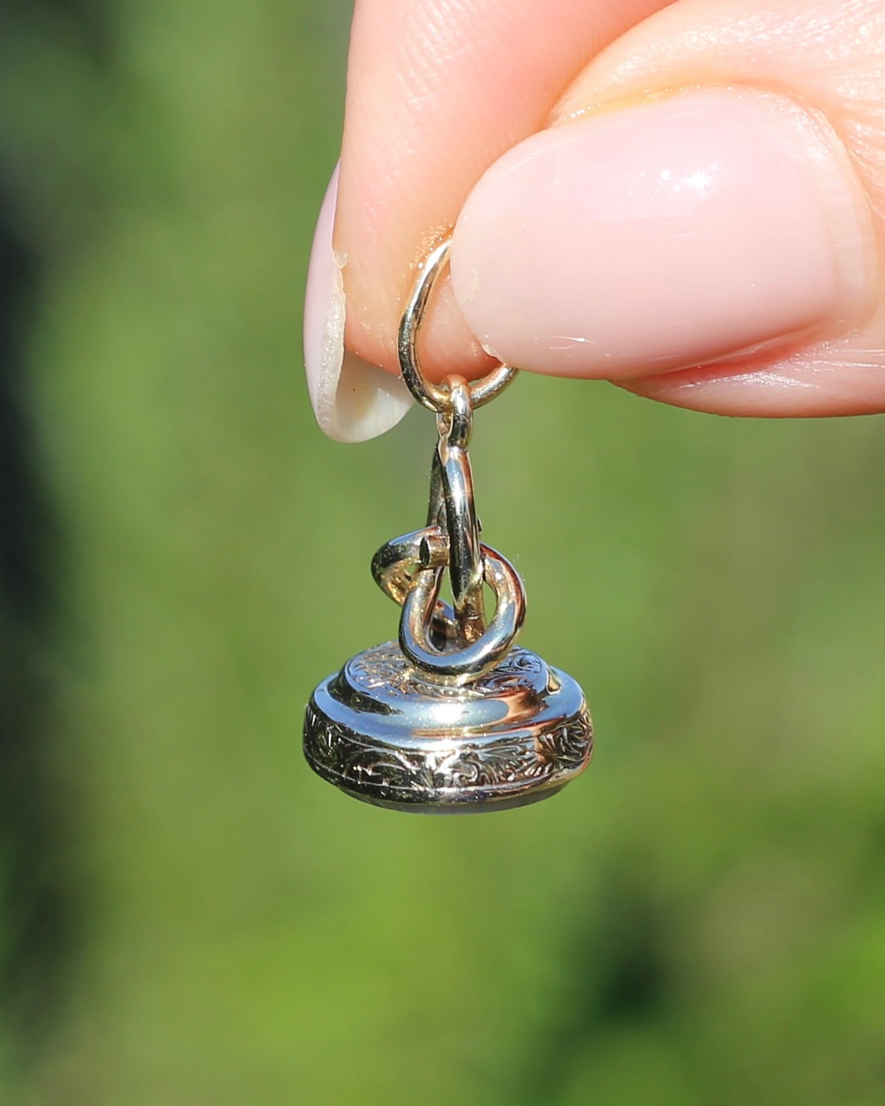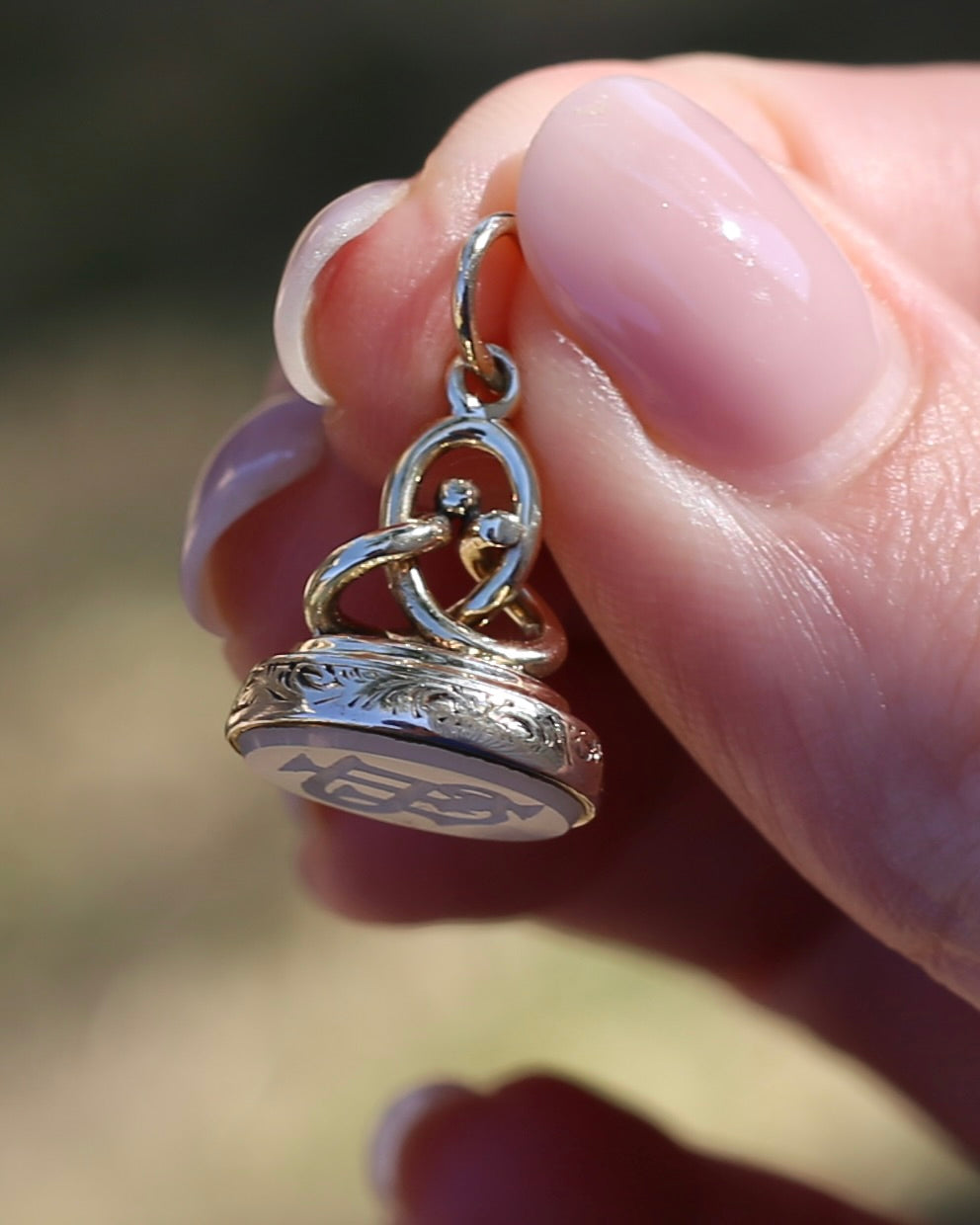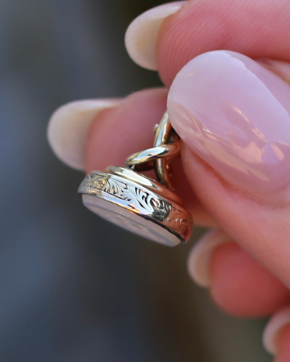 Set in 9ct gold, the edges are covered in a fabulous vine and leaf engraved pattern. This pattern also sits beneath the swirled gold that builds to the bail. We love the opulence of the gold, the engraved details, the swirls. It all screams of the most fabulous past.
