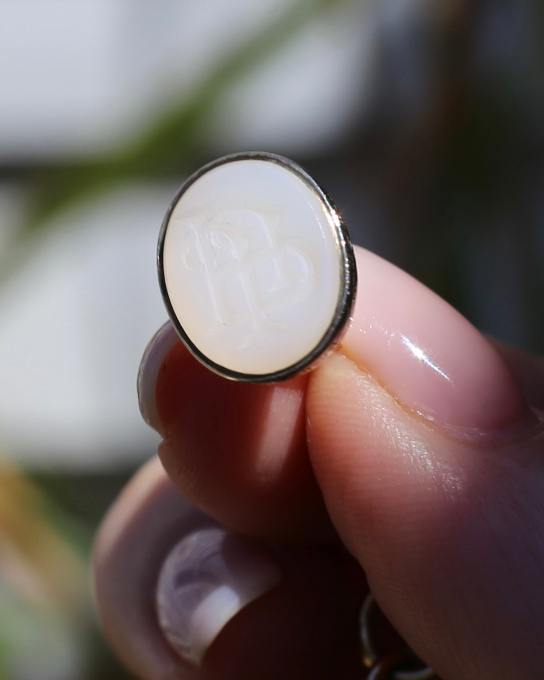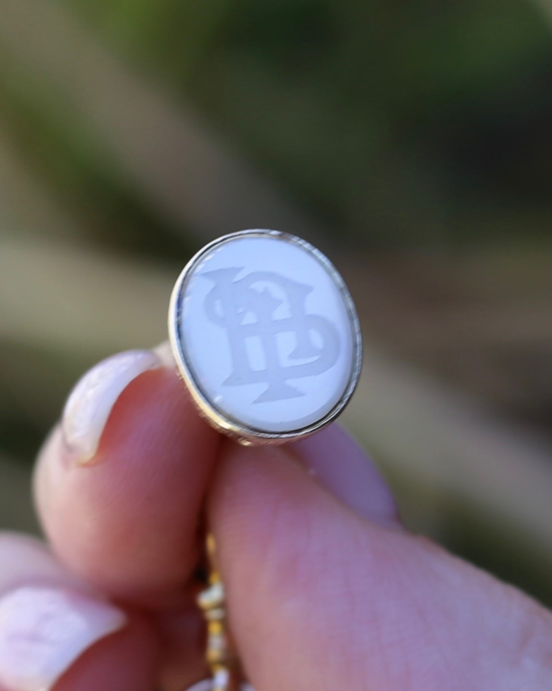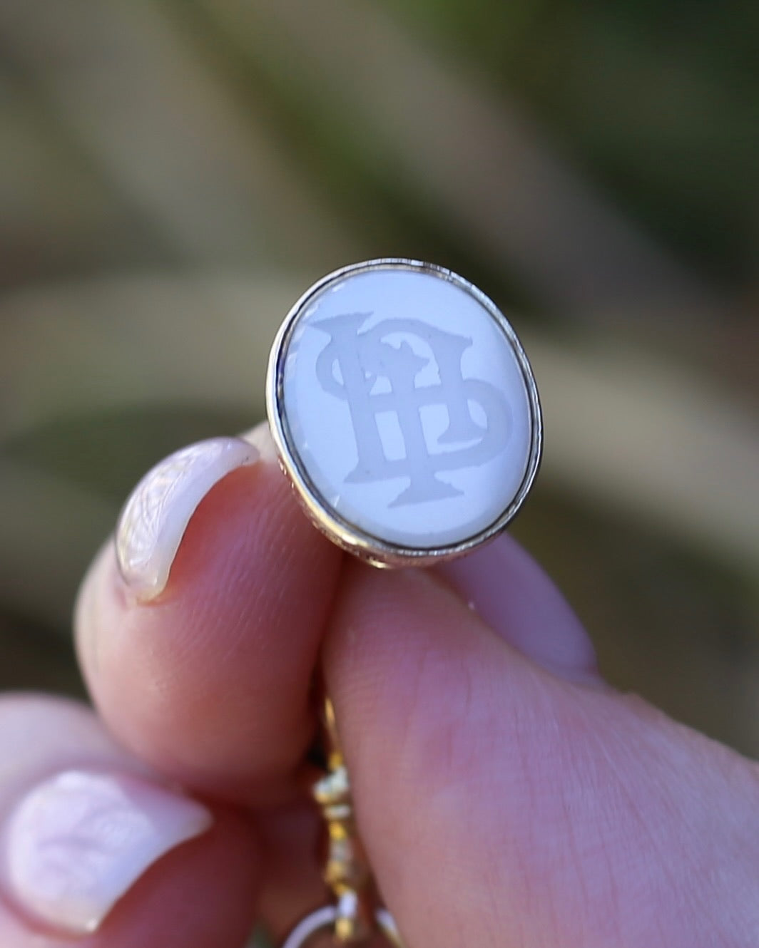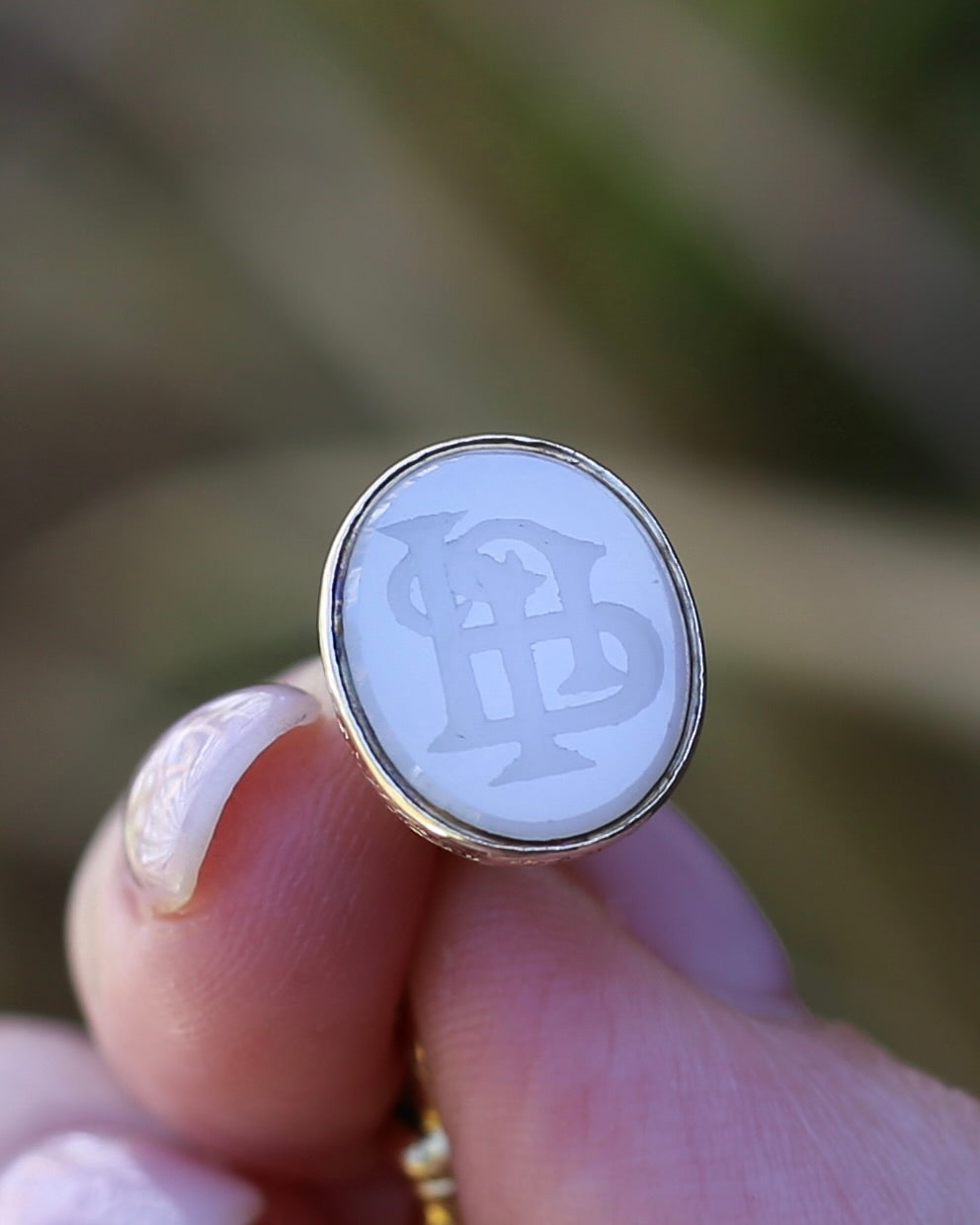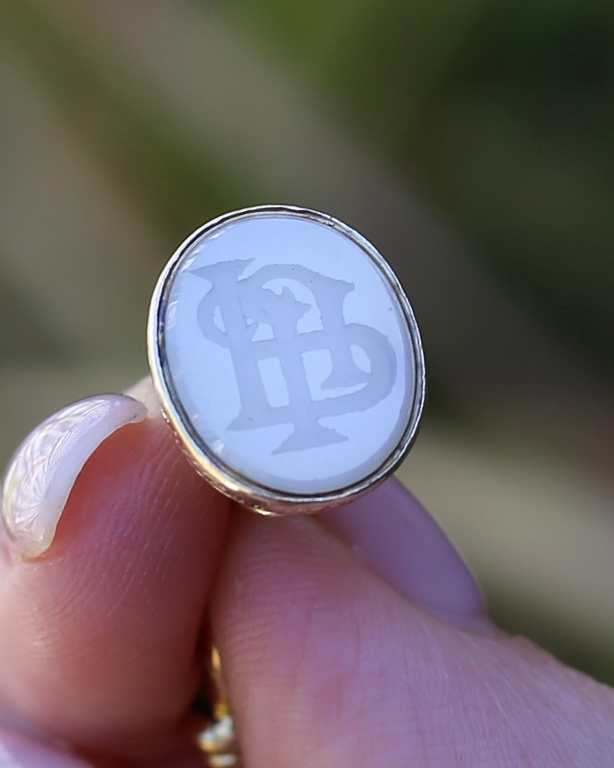 We love an intaglio fob - the romance of the imagination of the quill scribed parchment sealed with wax - set with the initials of the writer. This fabulous set of initials appears to me JJP or PJJ - and that hand carved detail is amazing - just look at the craftsmanship of the intertwined letters. The fob is stone - and we are guessing of the quartz/ agate family.