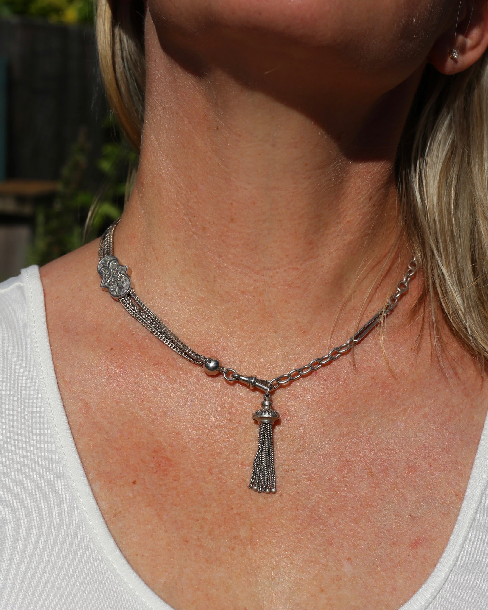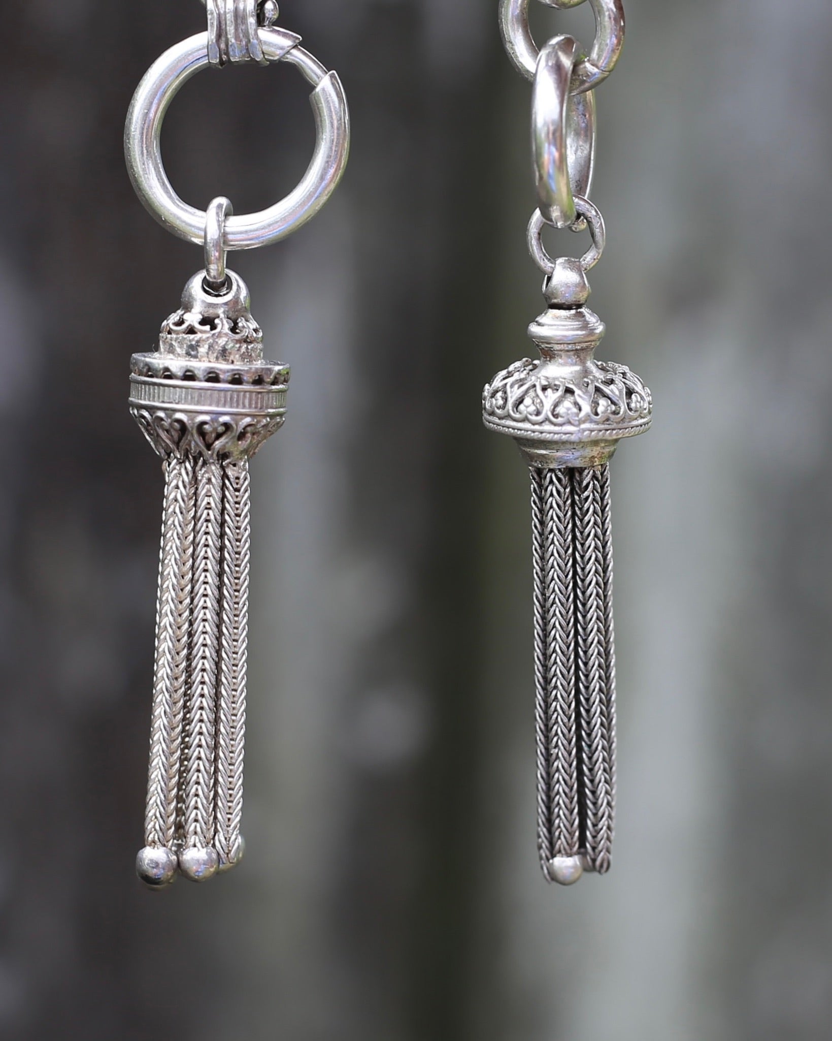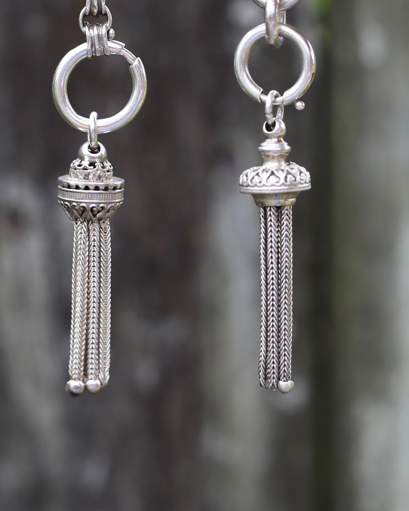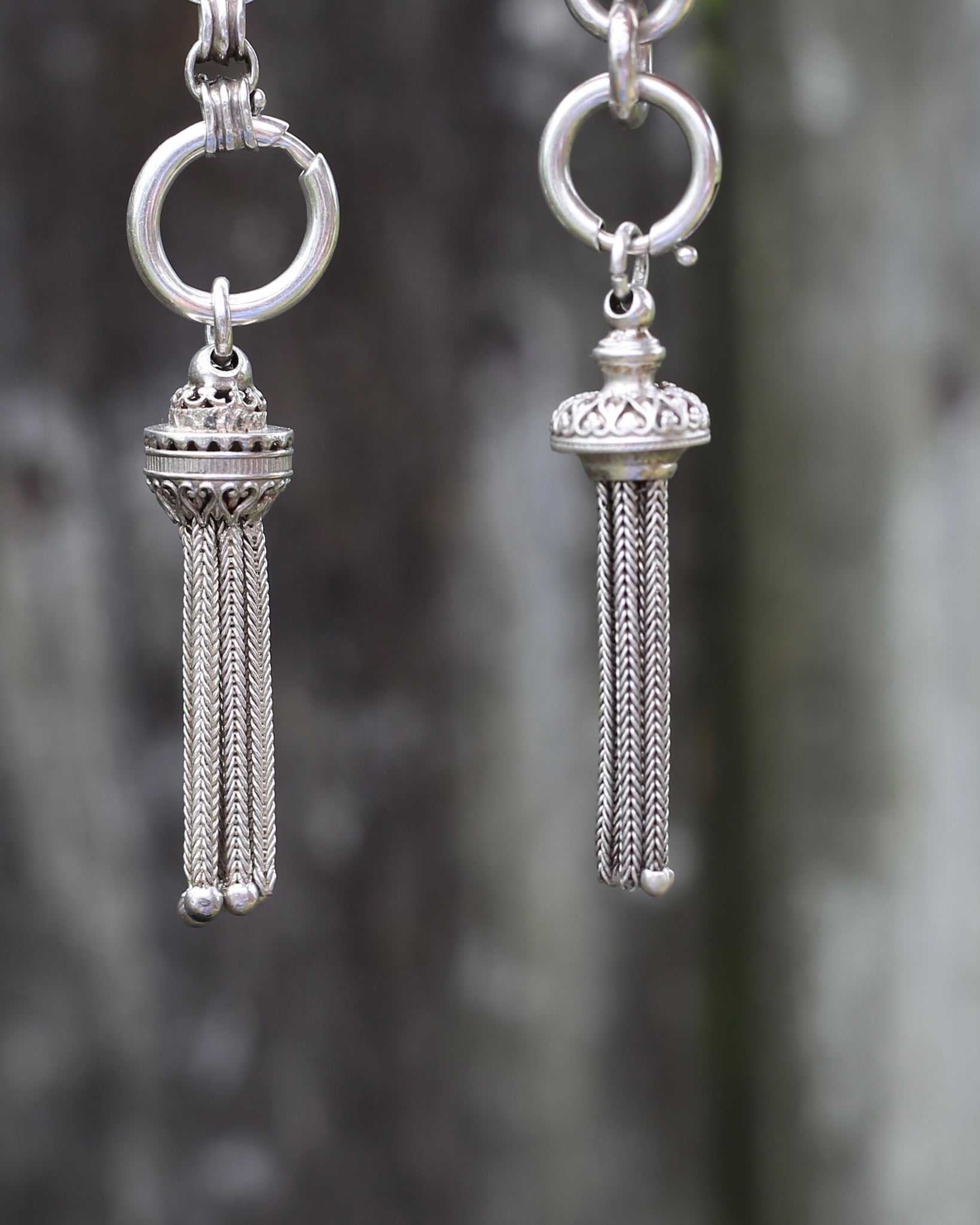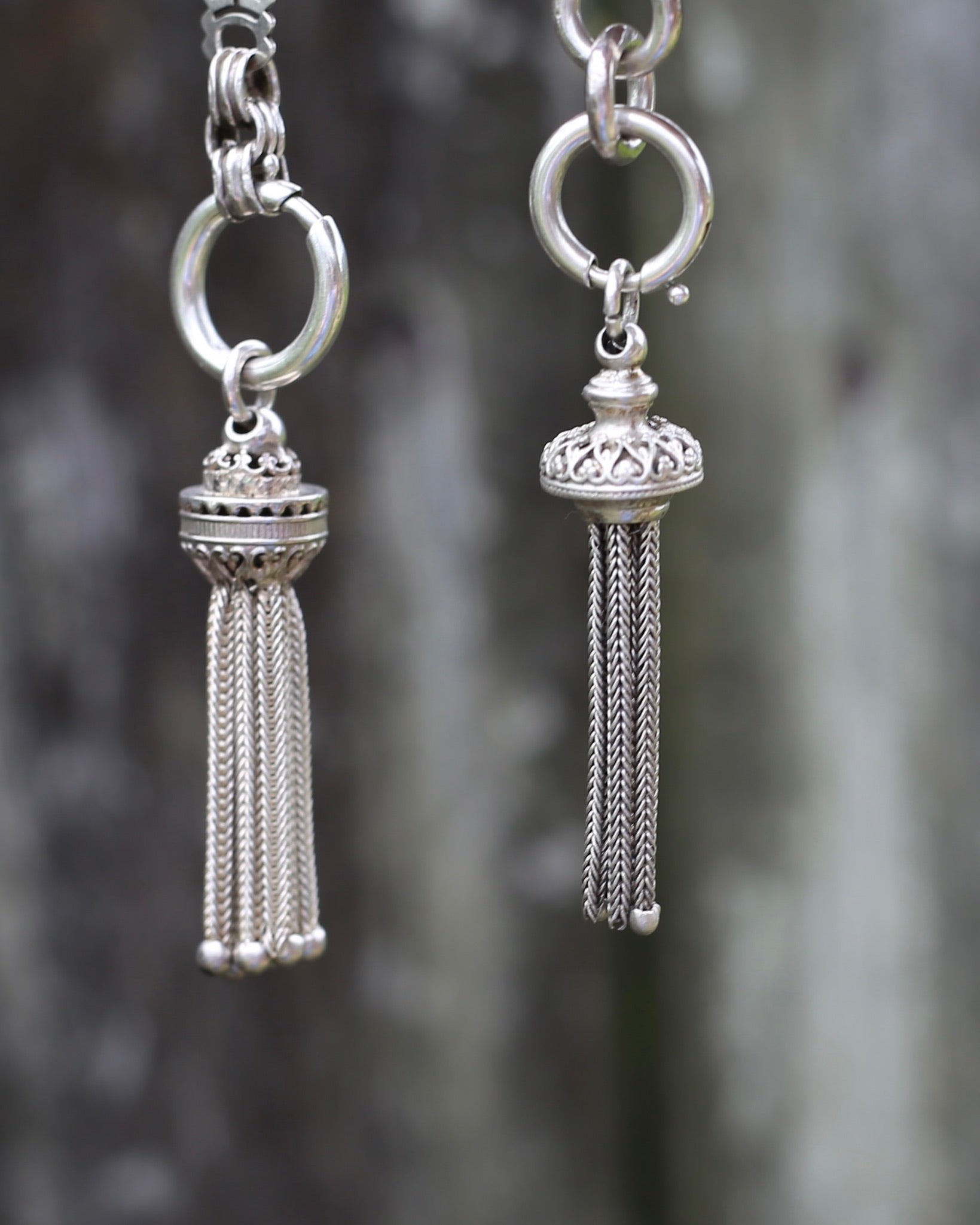 Antique Silver Tassels 0 one of our most requested and hard to find items. Made in Victorian (and the early part of the 20th Century) as a decorative feature to the watch chains, muff chains, longguards, chatterlains. Made with a decorative silver cap (all handmade of course) and with foxtail chain drops - some styled with decorative ball covers, some without.