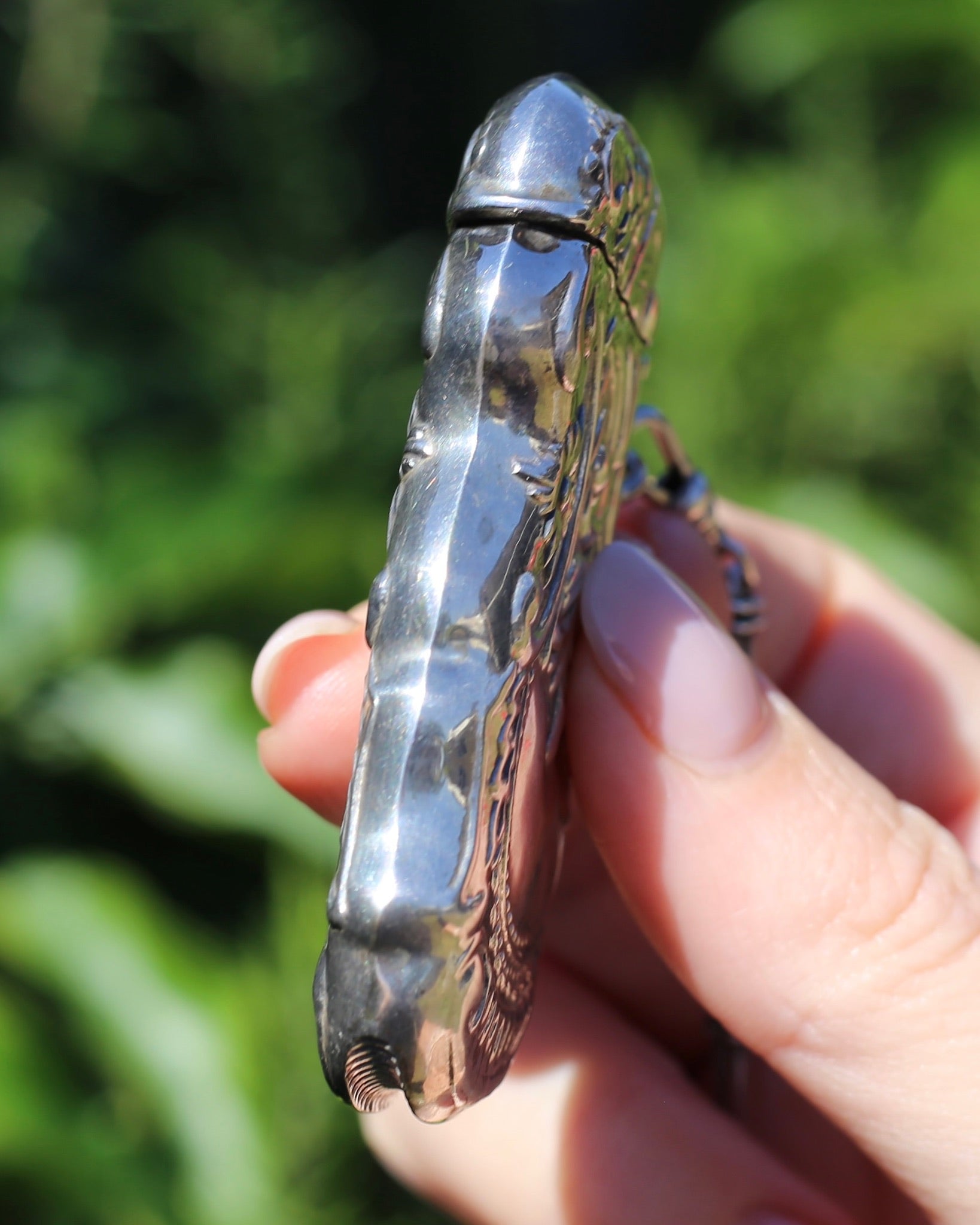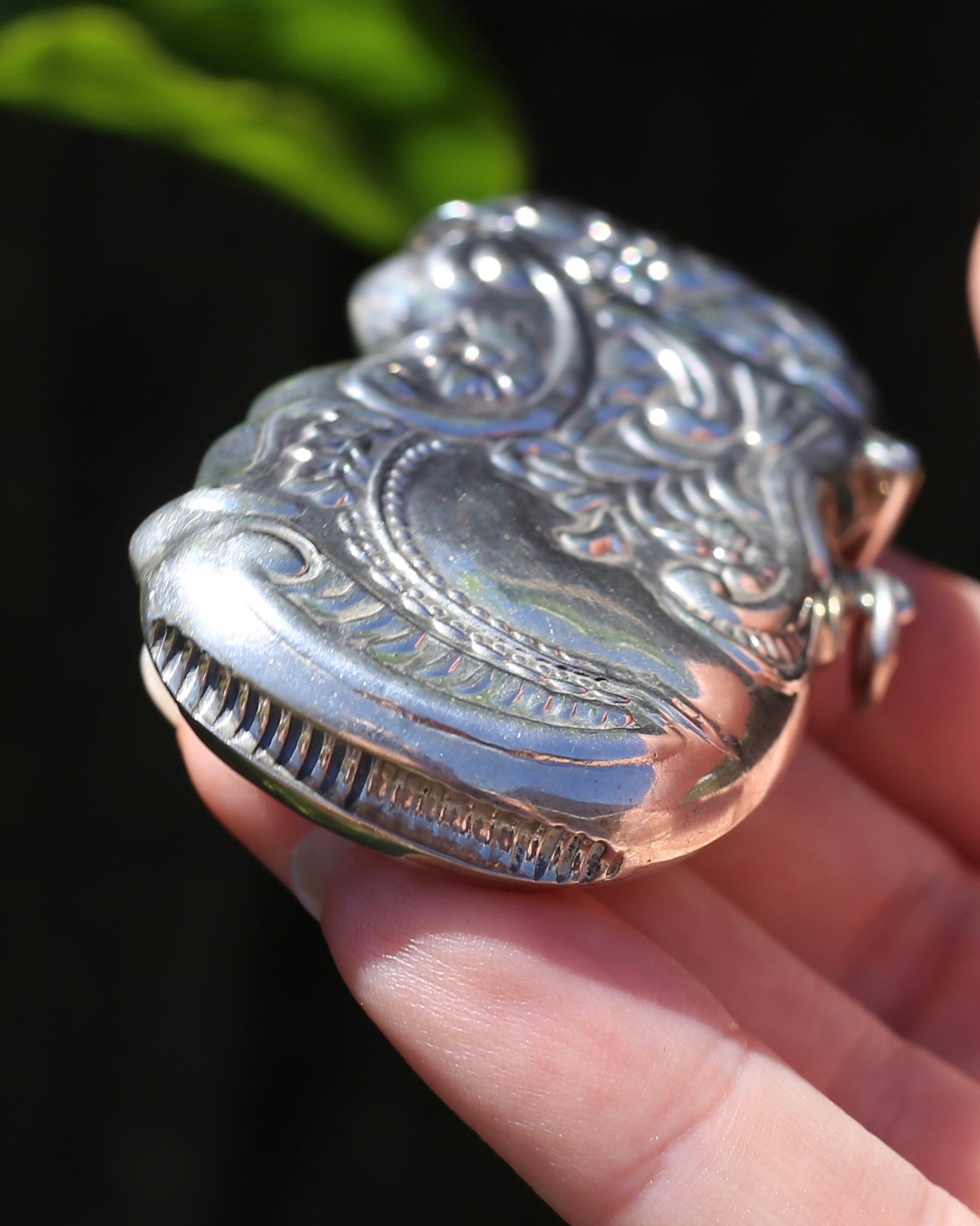Art Nouveau jewellery was all about the fluid lines and the natural motifs of plants and flowers. This fabulous oversized vesta case is adorned with repousse flowers and vines and we love the clear floral images.