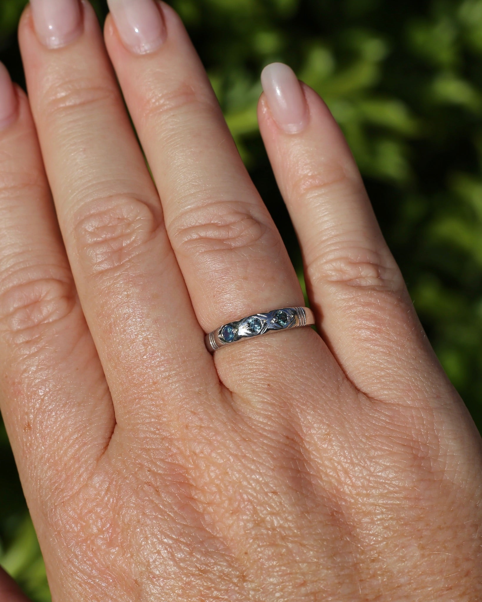 Trilogies are just so packed with meaning, so for this beauty to have the past, present and future held in engraved band settings that are so wearable - and with the stones throwing different colours much like memories - and how it is the light of the present that influences how you see your past and future. Grain set into a band that had previously had three very dull garnets, this little glow up has brought serious star power to this amazing ring.