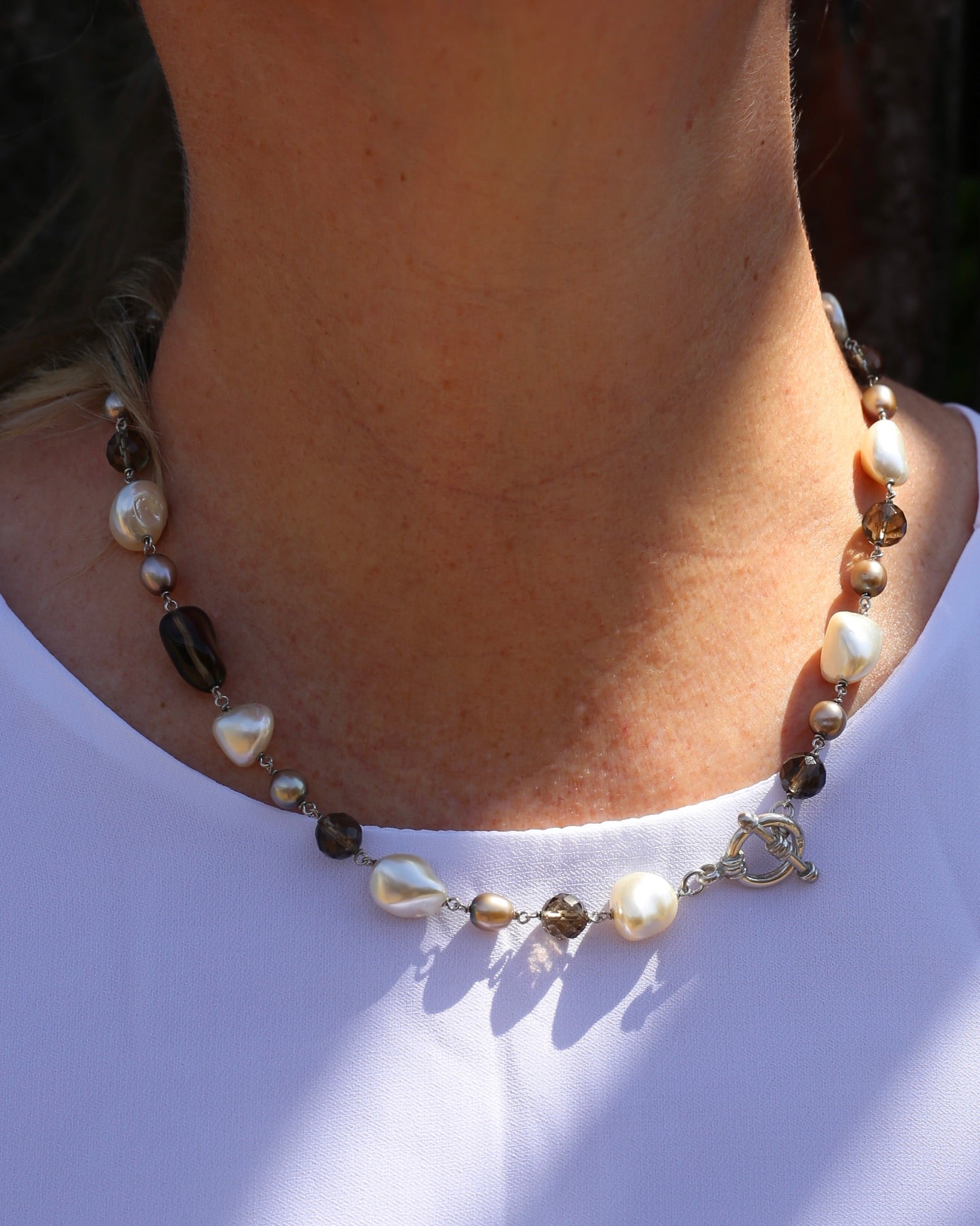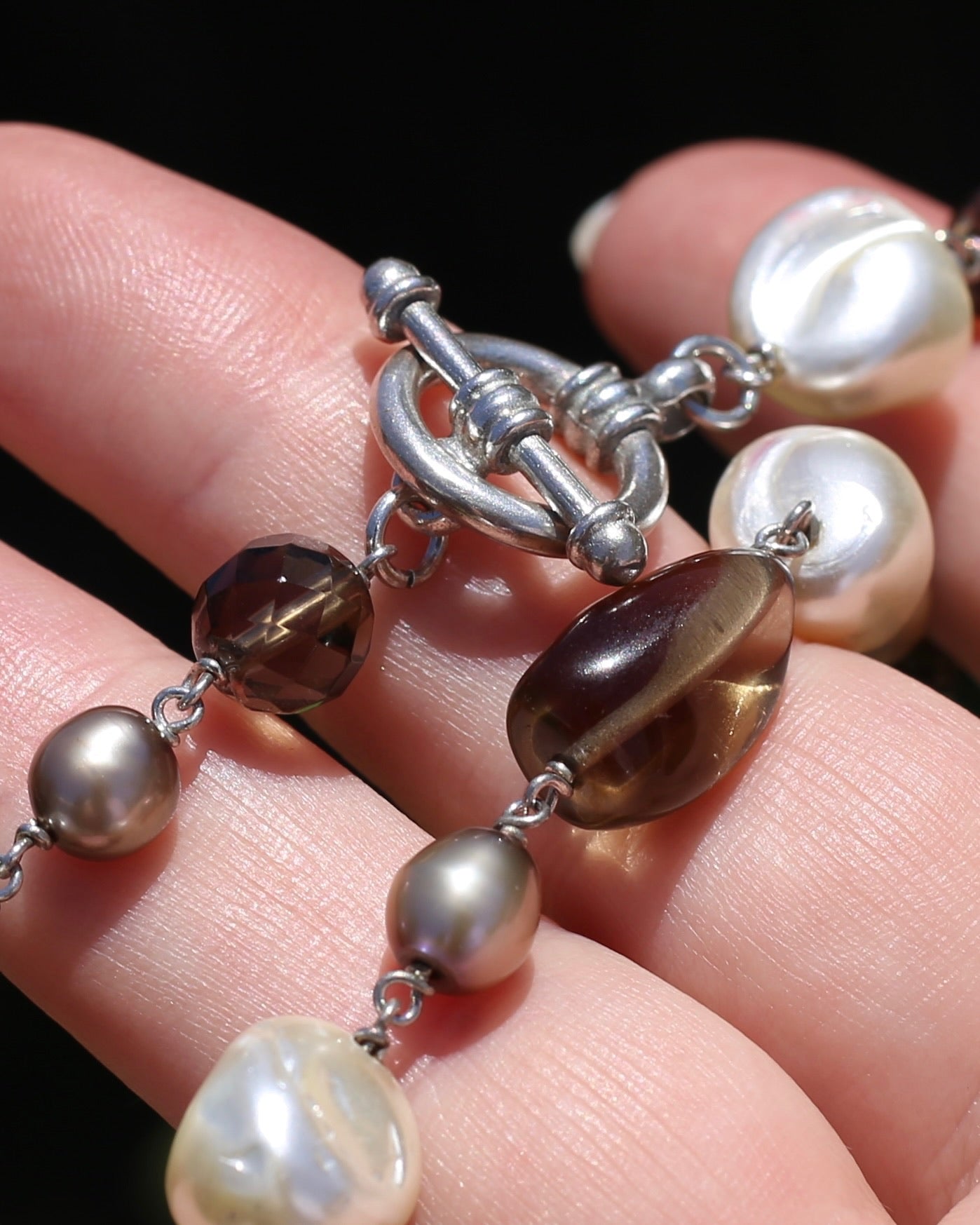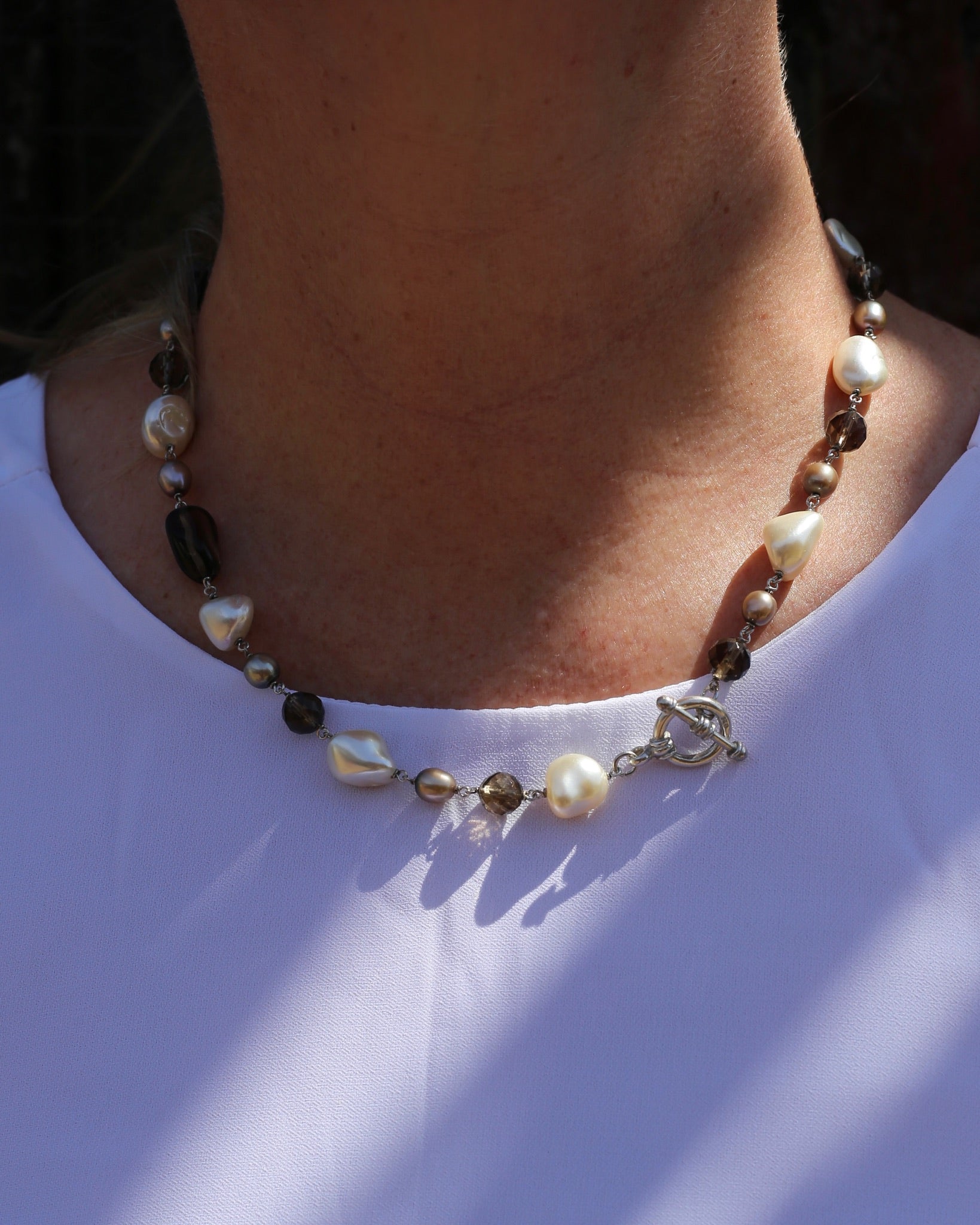 Baroque White Pearl, Grey Pearl and Smoky Quartz Neckalce, Silver Clasp and Findings, 43g