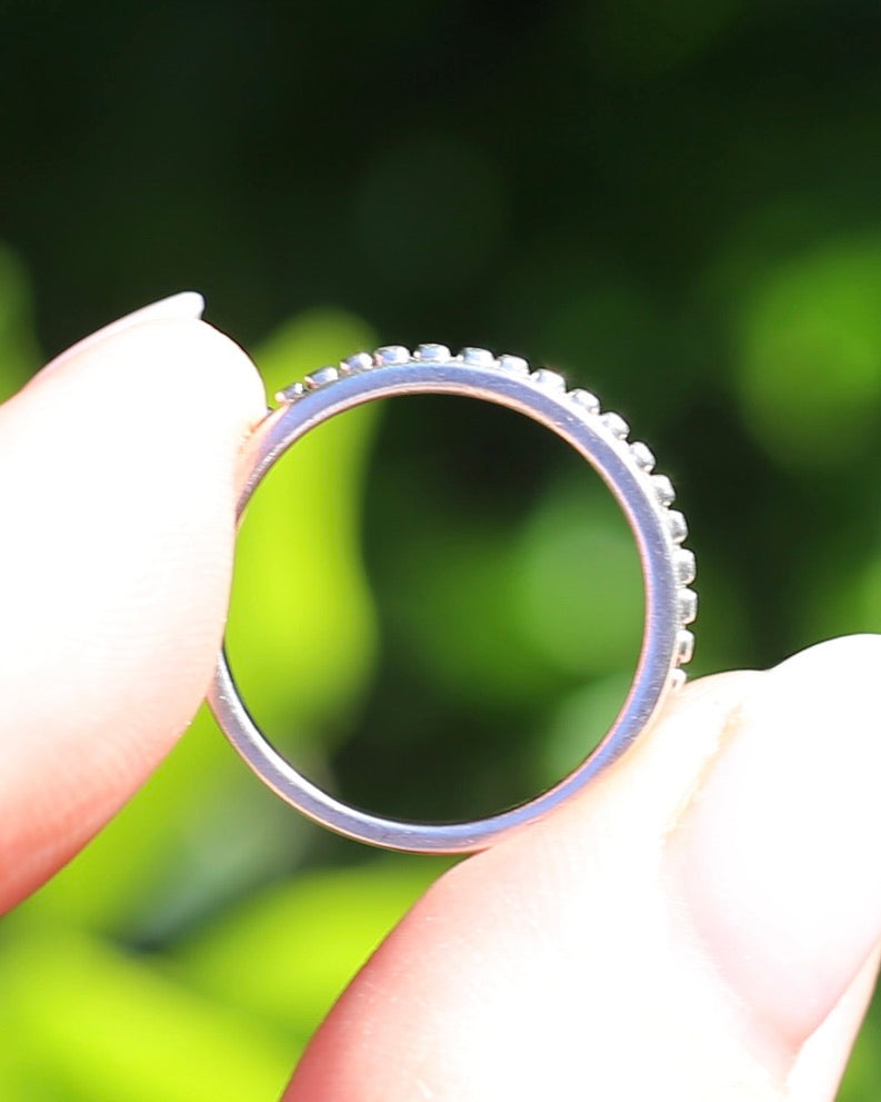 This beaded stacker is the ultimate in adding some depth and texture to your stack. Those beads run almost half way around the ring so even from the side of your finger the pattern remains. With the way that silver builds patina, the gaps also develop those deep shadows which highlights the beads further. I have been wearing this stacked with the baby bombe - and I love the contrast.