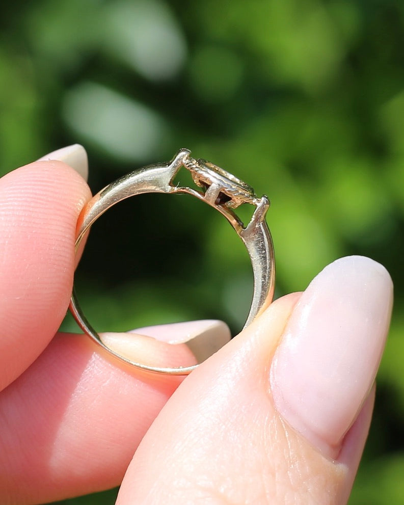 Garnets are perfect Autumnal stone - the deep mulled wine red that reminds us of falling red leaves, warm fires and glorious spice warmed drinks to warm our souls. This fabulous deep garnet is bezel set and has delicate rope details around the very edge. We love the way the gold catches the light with the bezel face, rope details and raised shoulders.