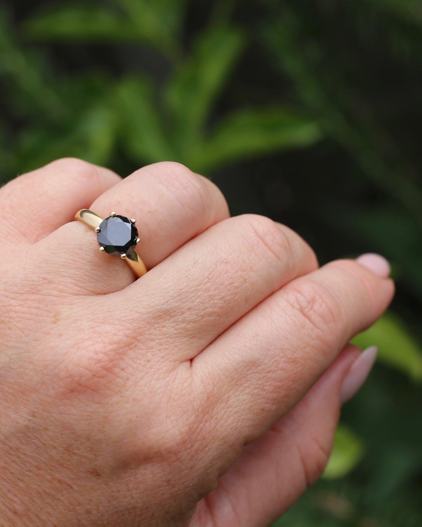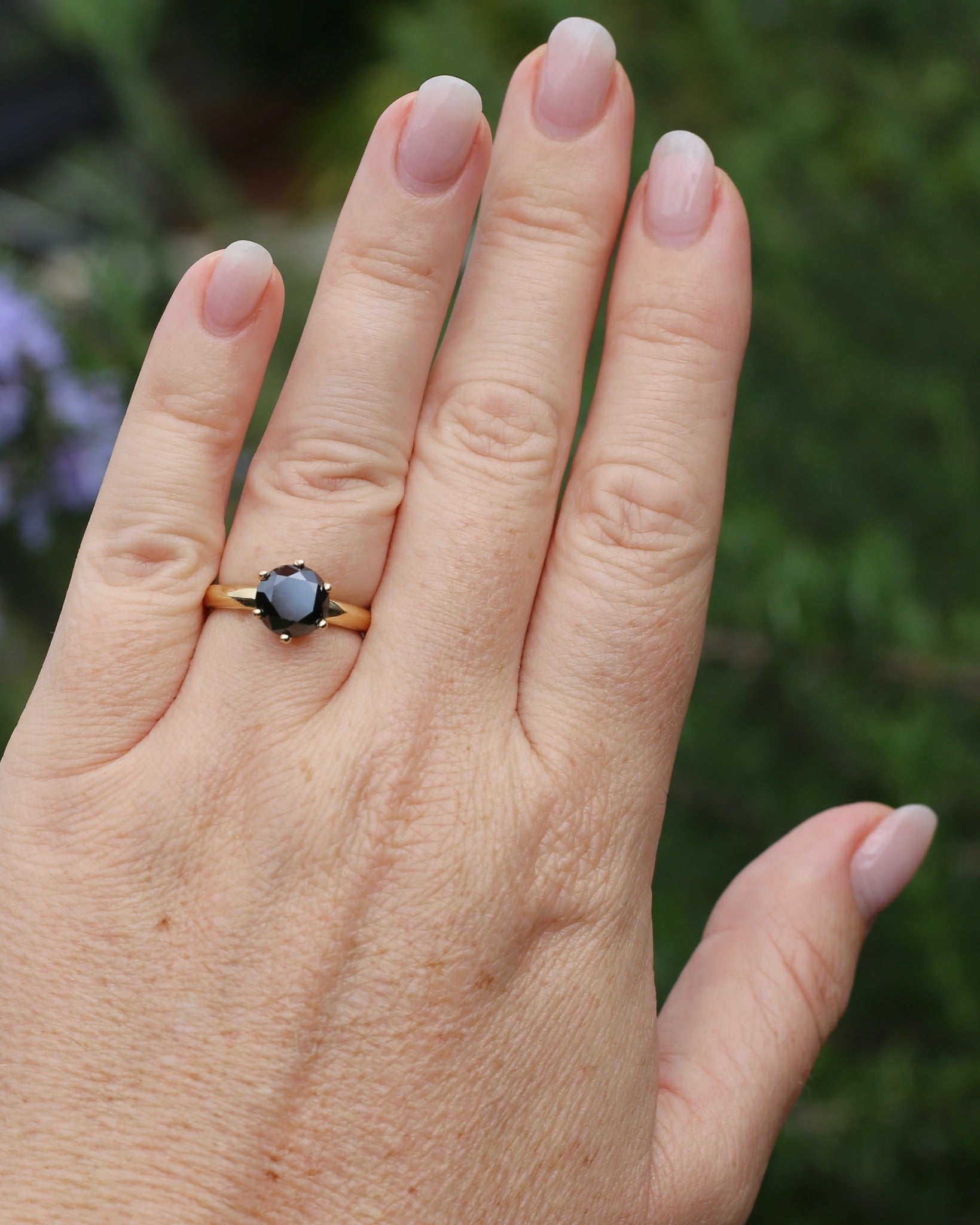 This is a glorious statement in black and gold. Black diamond solitaires are one of the most requested modern rings we get asked for - and it is not hard to see why. A stone with great hardness (9.25 for moissanite and 10 for diamond), a lovely twist on the classic white solitaire, and then combo of black and gold - magical. Diamonds and moissanites are normally easily told apart by the double refraction of moissanite - except this stone we can't see into - so we have called it a moissanite to be safe - but it could indeed be a treated black diamond.