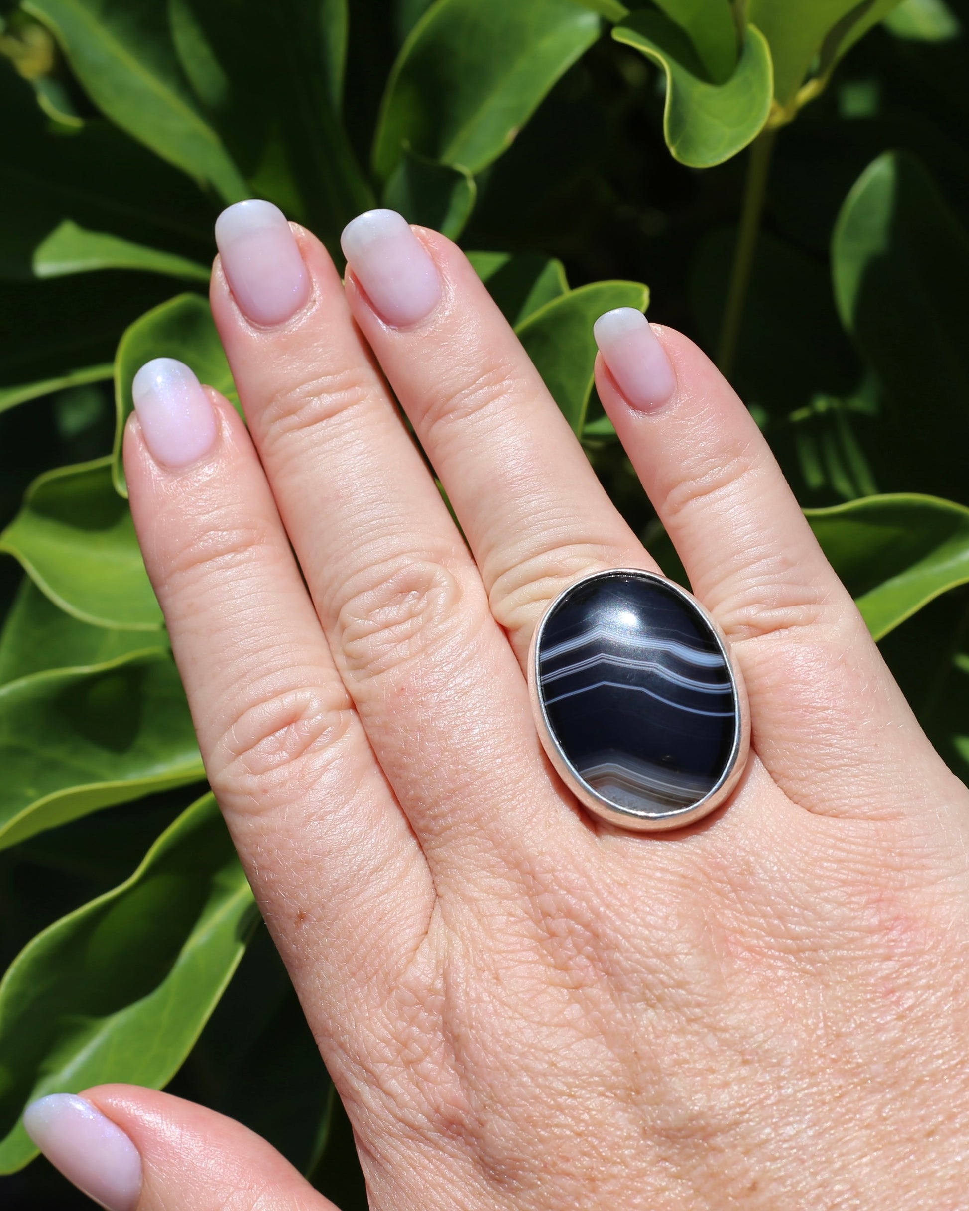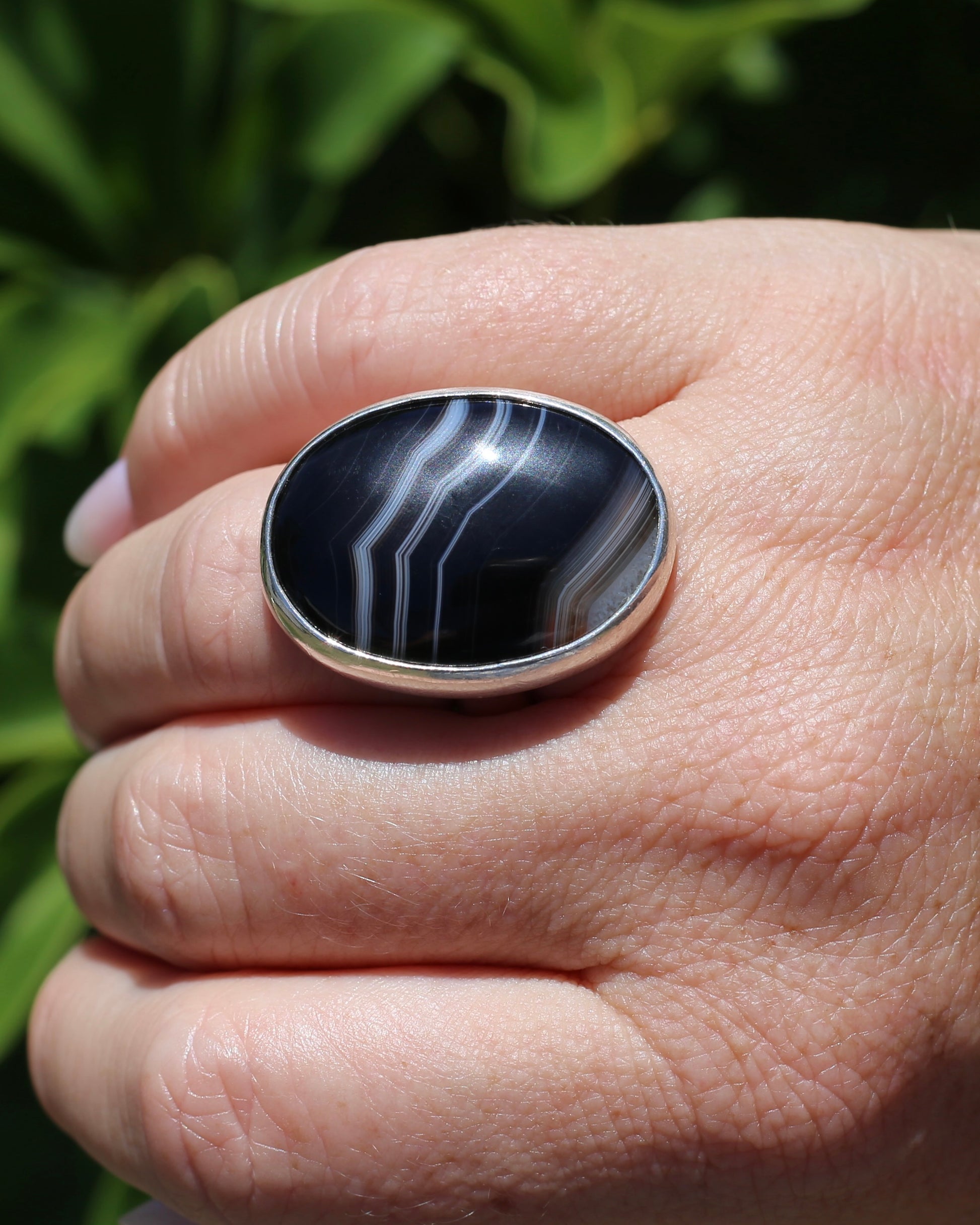 Now this is a ring with real weight and presence. Featuring a fabulous cabochon of banded agate the black face is split by glorious white lines. And at one end it fades into browns and greys - and we just can't get enough of the amazing way nature has formed these magical stones.