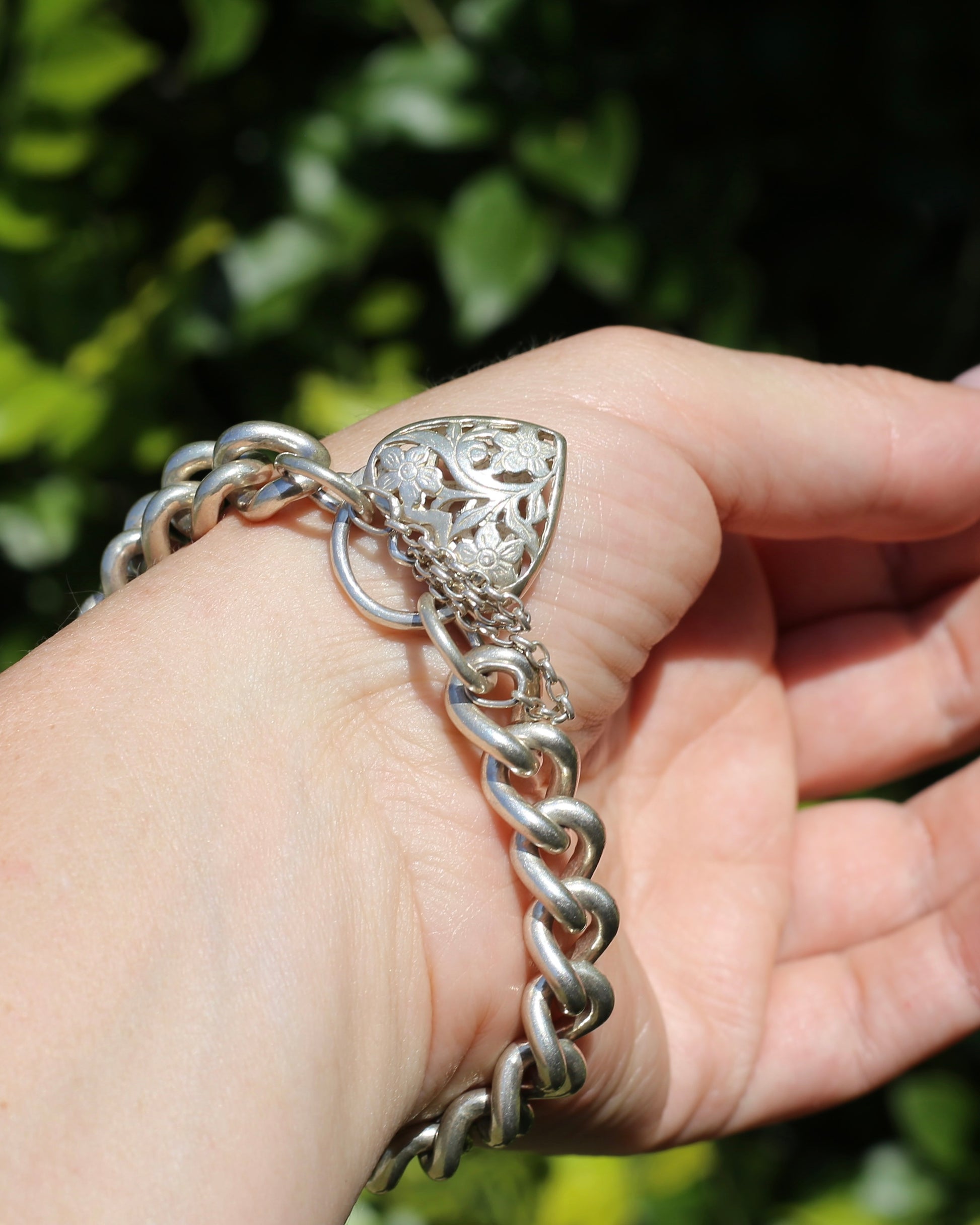 Fastened with a heart filigree floral padlock and complete with a safety chain, this bracelet could be worn alone, in a stack or to start a charm bracelet.