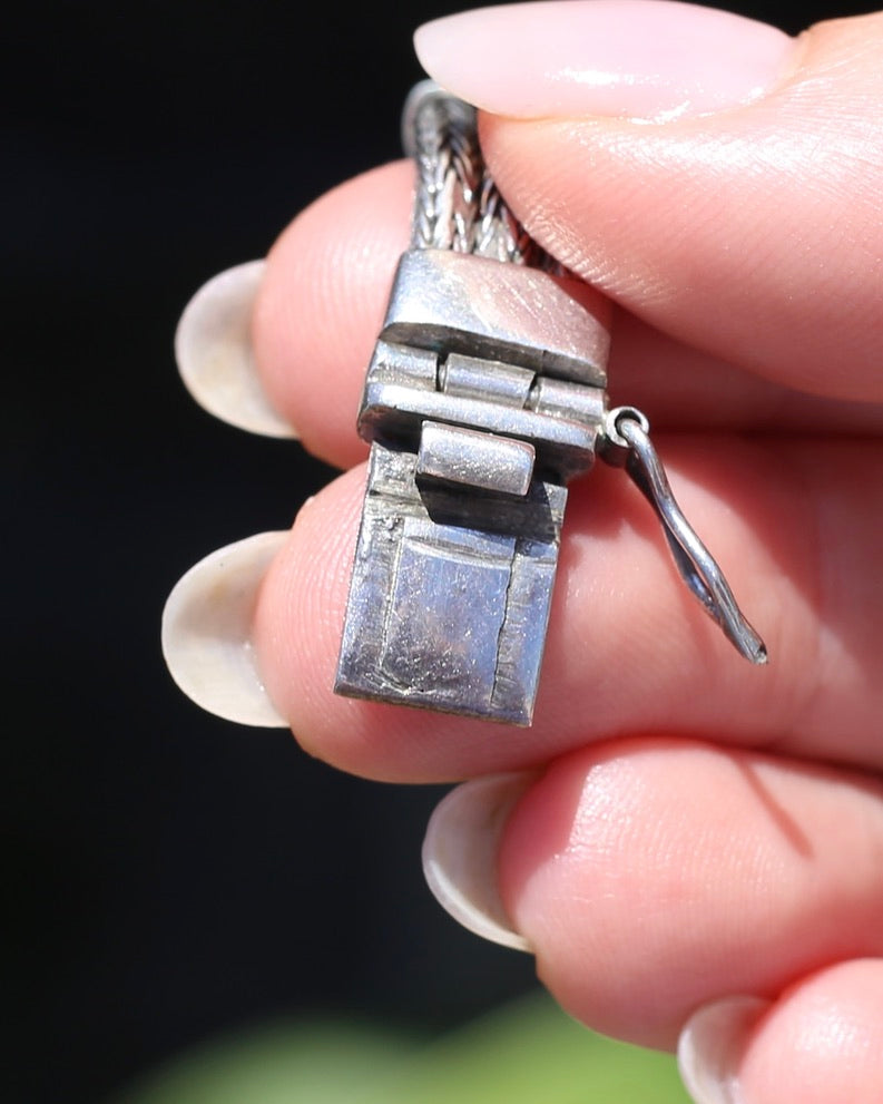 We love chunky silver, better yet chunky silver with personality. This fabulous vintage bracelet is the most perfect tight fit piece to add to your wrist stack. The bracelet has three sections of triple foxtail chains separated by three sections of chunky curb chain. This bracelet is not long, and fits snuggly round my wrist. Fastened with a chunky secure clasp and safety clasp this is a strong and personality filled bracelet.