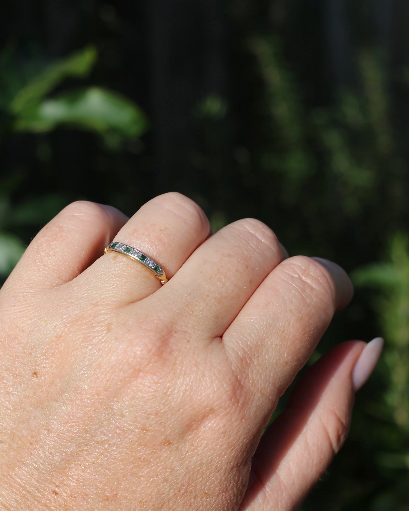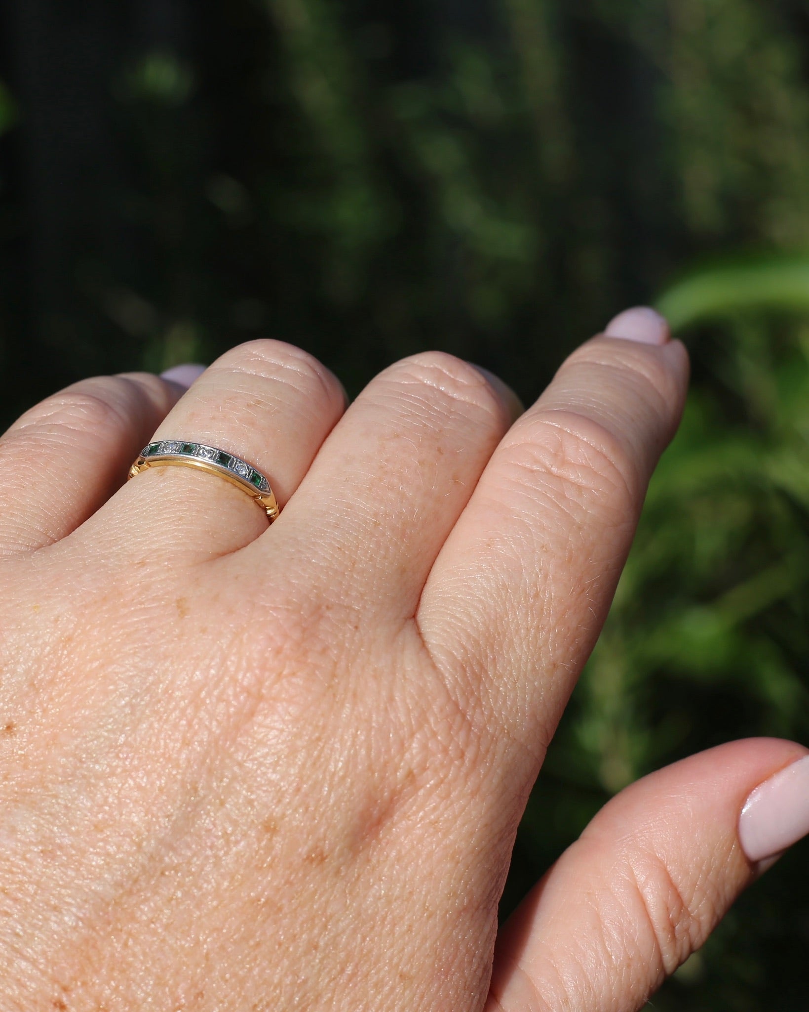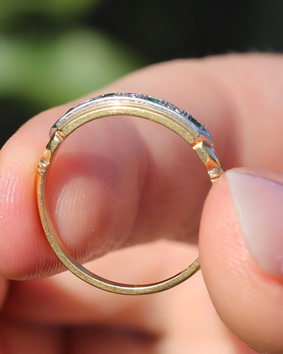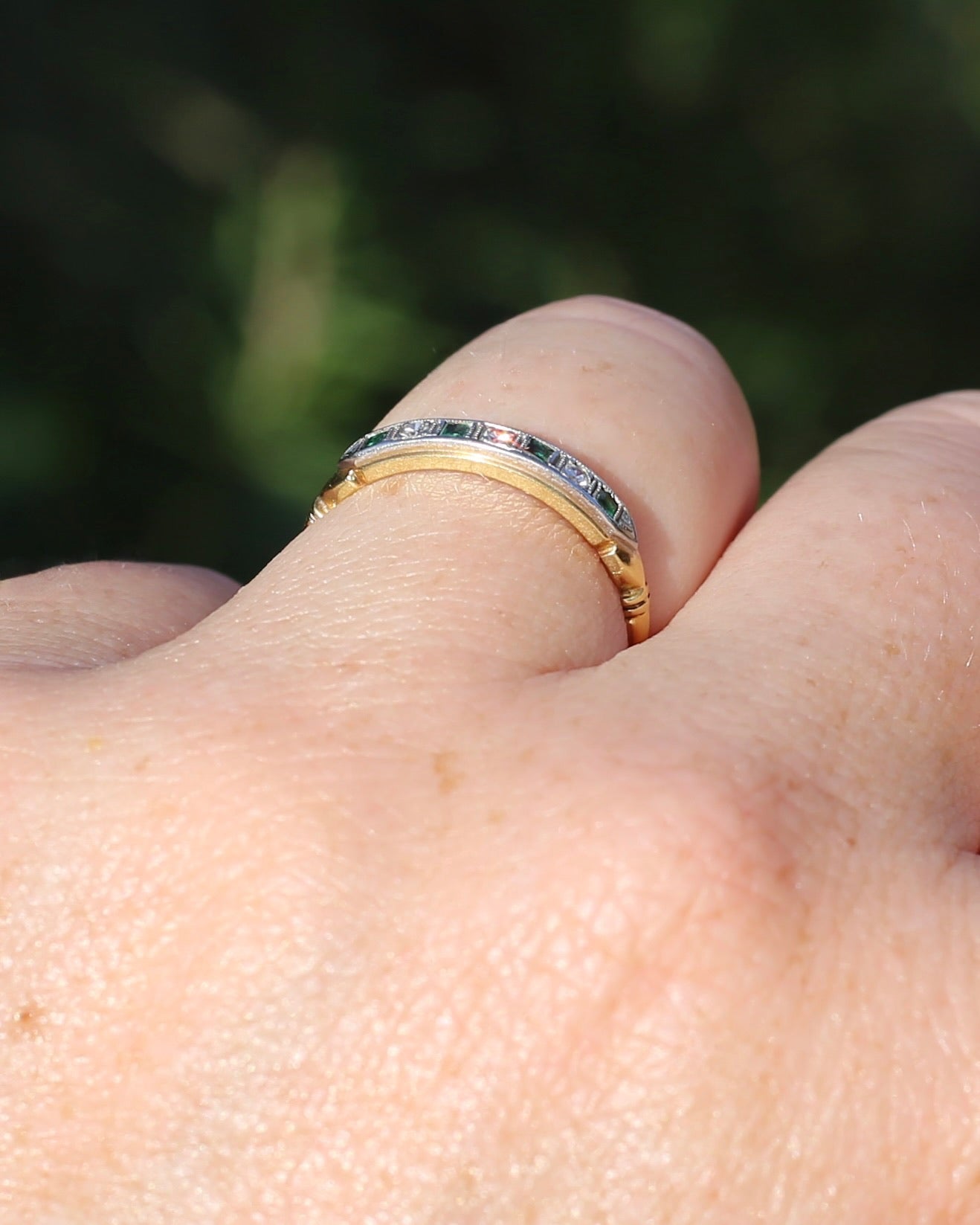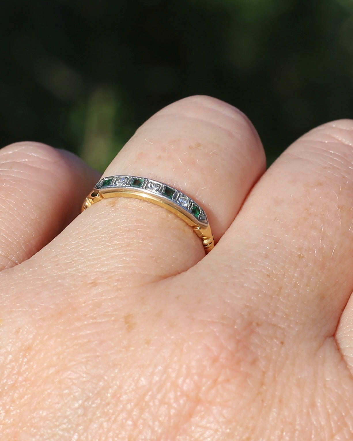 Hello 1930s! This fabulous handmade mixed metal 7 stone ring screams of the Era. The use of platinum and 18ct gold was at its peak (and the wars after this are cause for its decline in jewellery). The hand cut emeralds, single cut diamonds and the use of milgrain settings - all utterly divine and totally of the time.