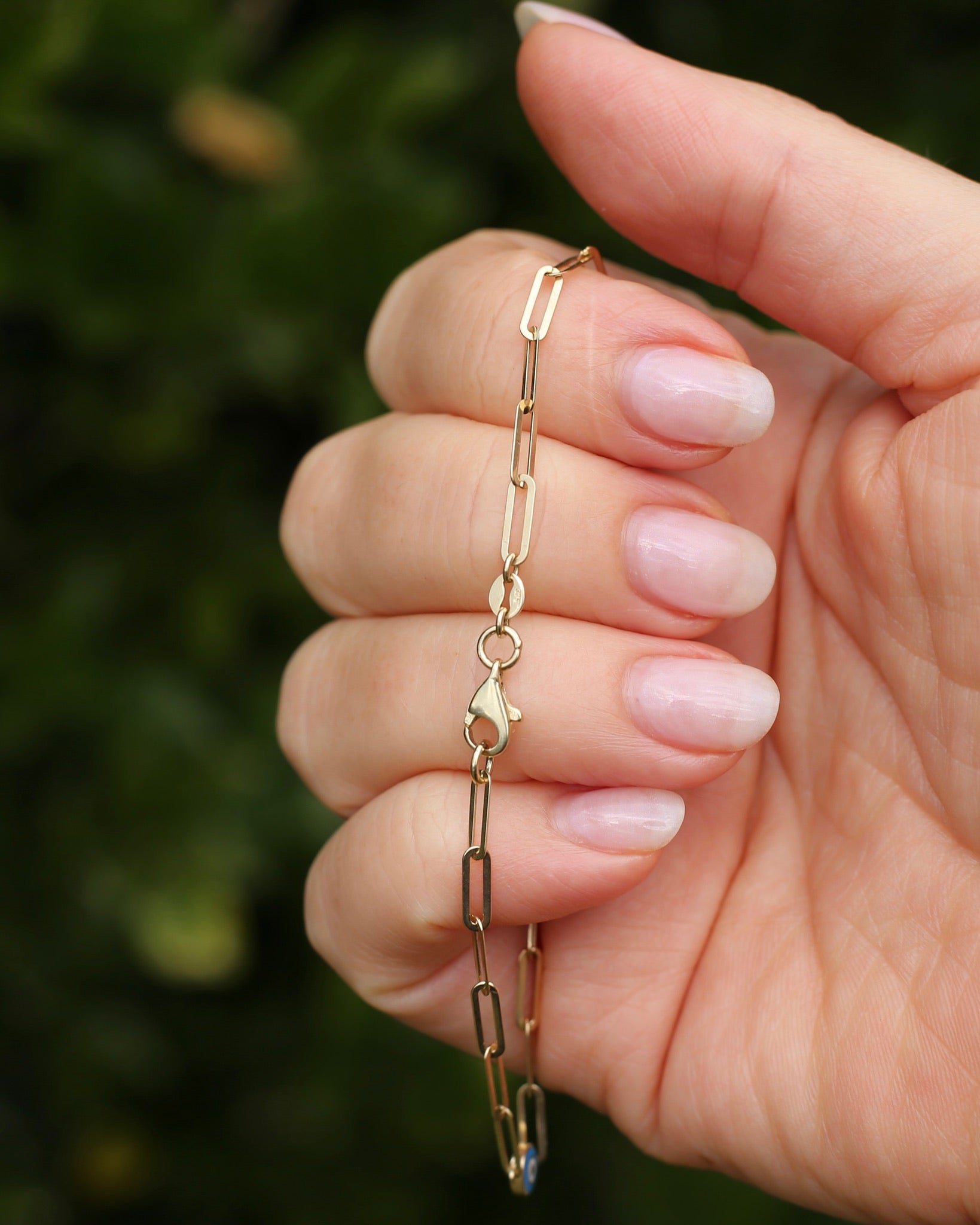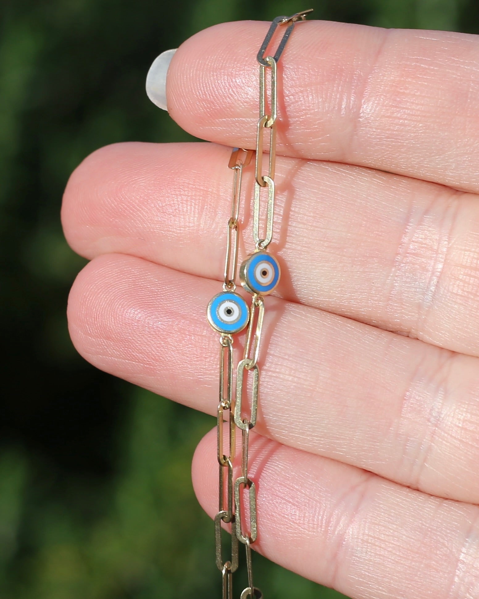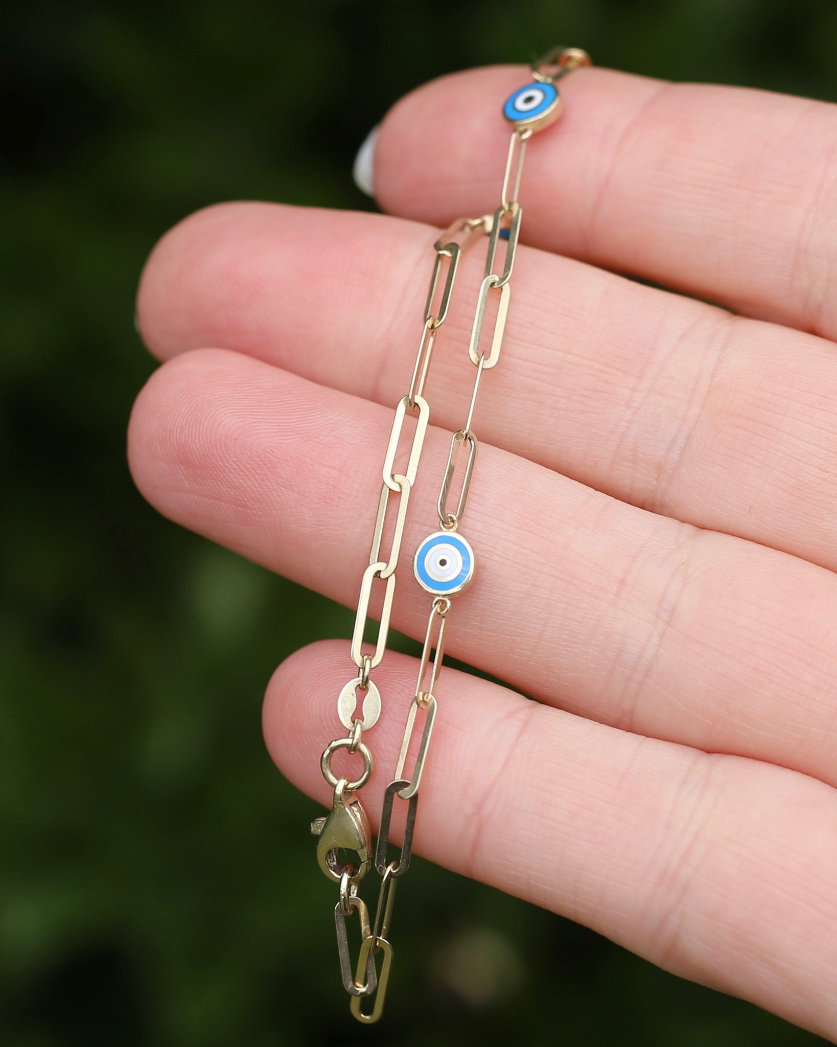 Delicate Paperclip and Enamel Evil Eye Bracelet, 9ct Yellow Gold, 19.5cm or 7.75inches