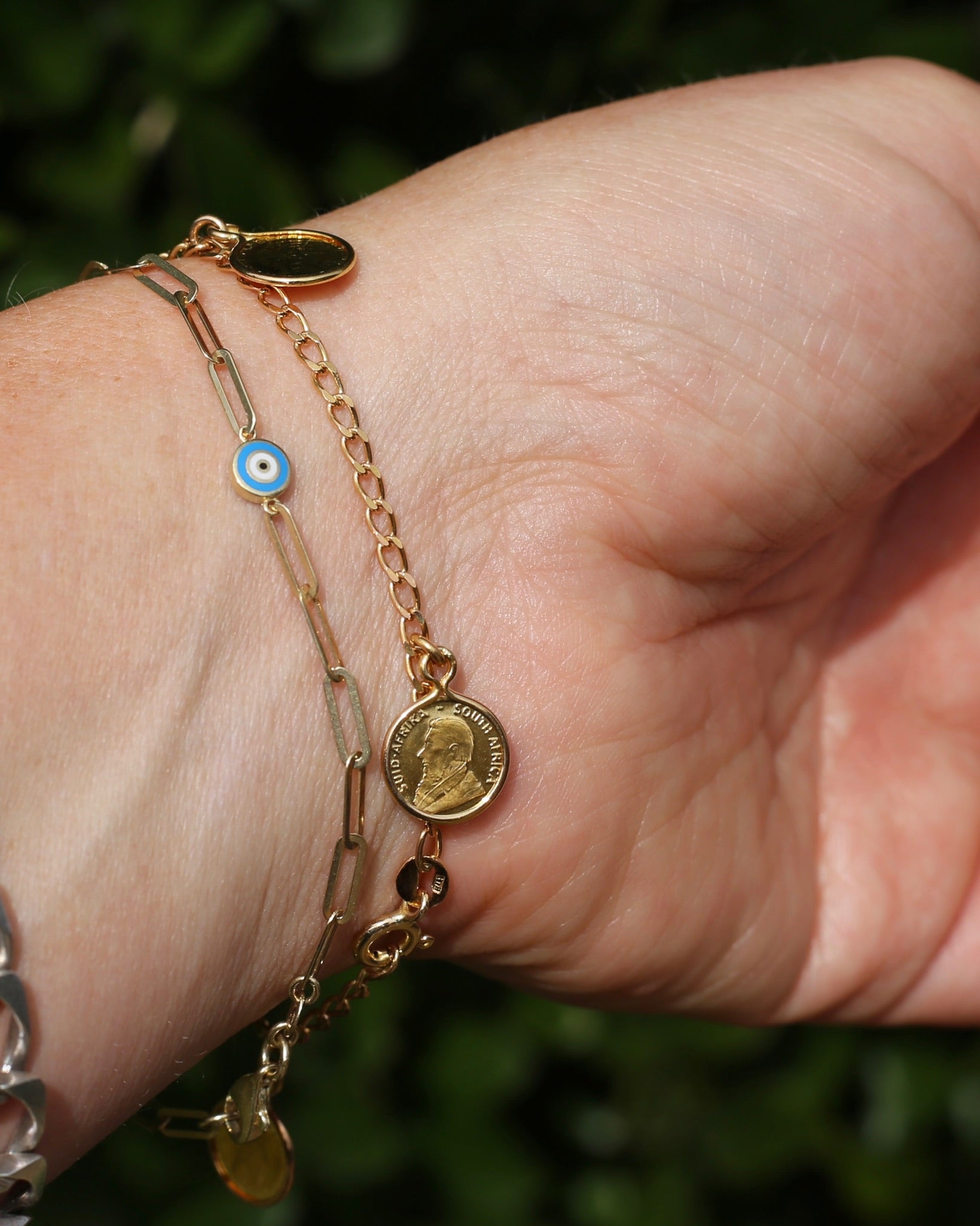 Evil eye beads have their origins in many Mediterranean and Middle Eastern Cultures. Believed to protect the wearer from envy, negative energies and bad luck. This fabulous paperclip and evil eye bracelet is the perfect combination. Three enamel evil eye charms in turquoise, gold, white and black, and then beautifully angular paperclip links to catch the light.