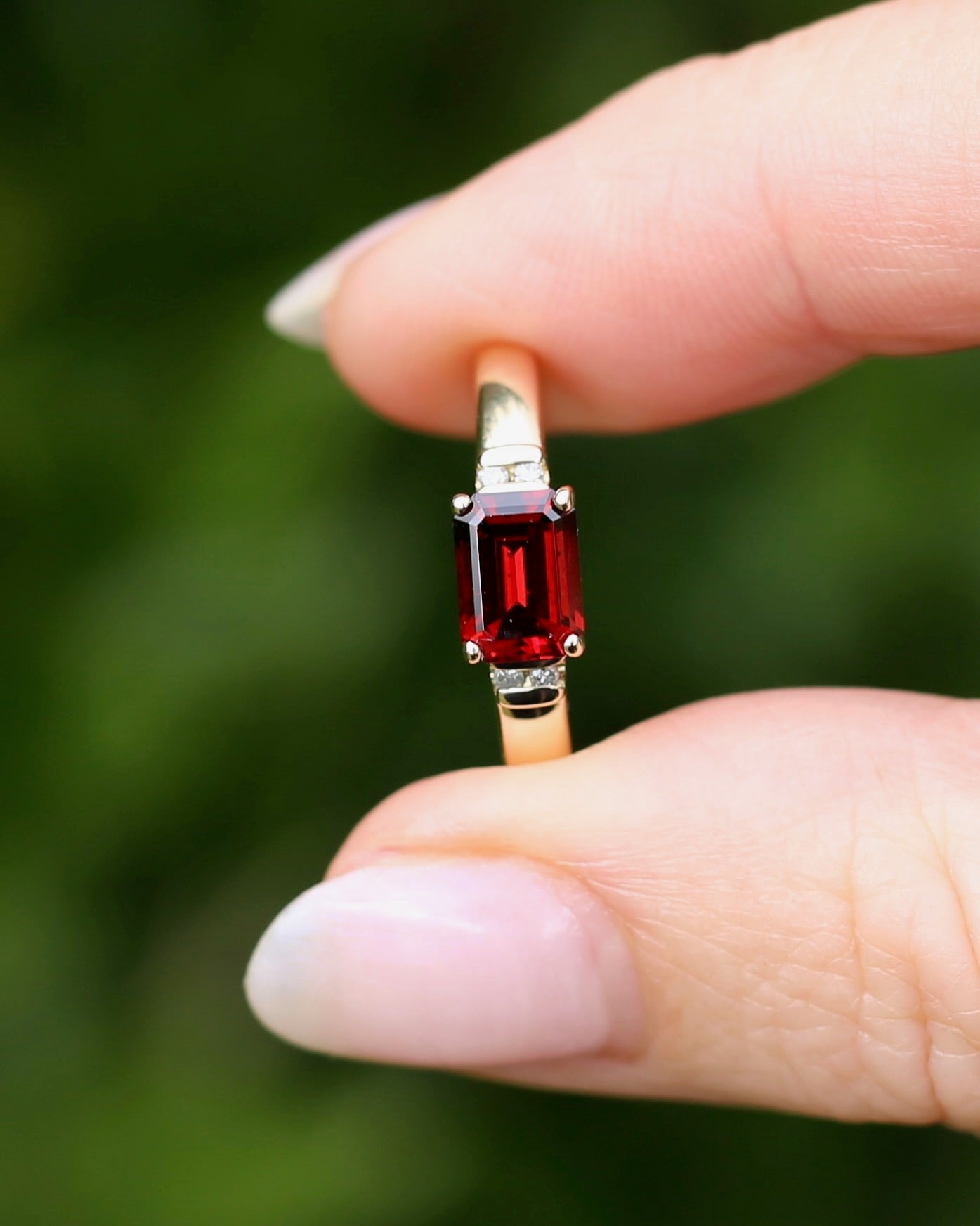 East African East West Set Emerald Cut Garnet and Diamond side stones, 9ct Yellow Gold, size P1/2 or 8